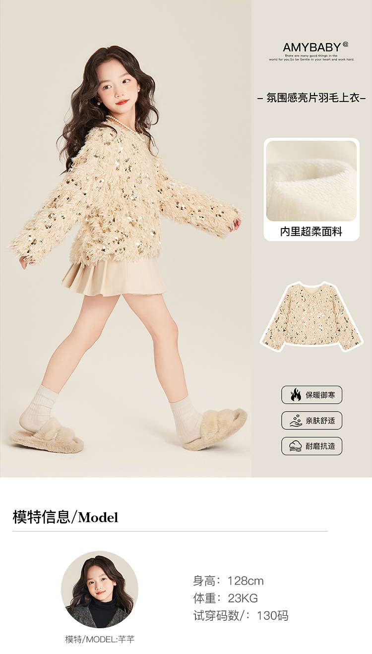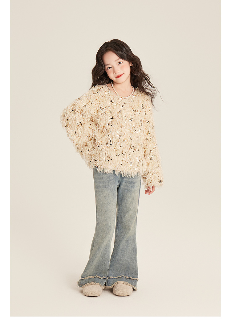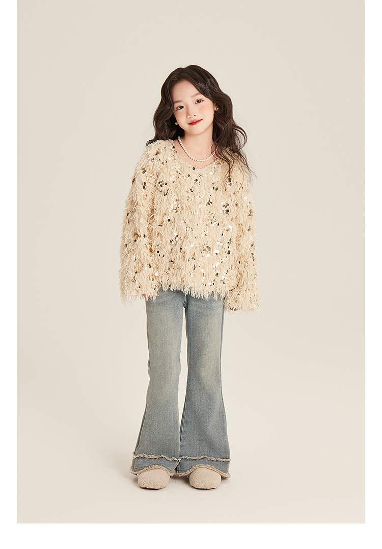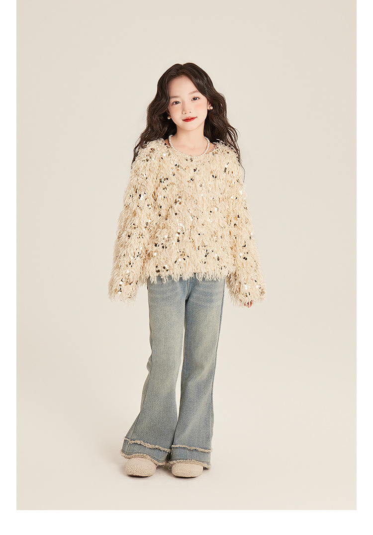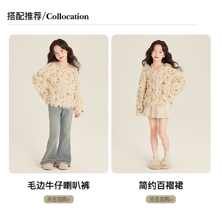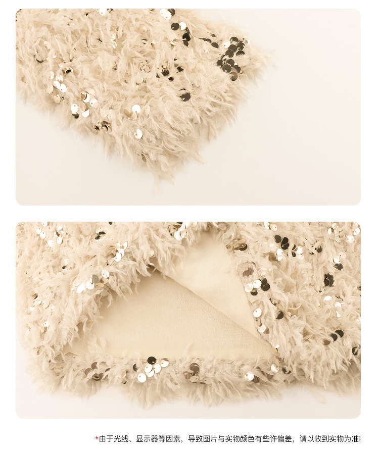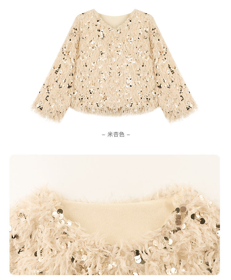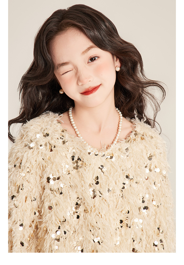 Amybaby Girl's Winter 2024 새로운 프랑스 스타일 우아한 분위기 깃털 Sequin Tassel Top스토어 가기