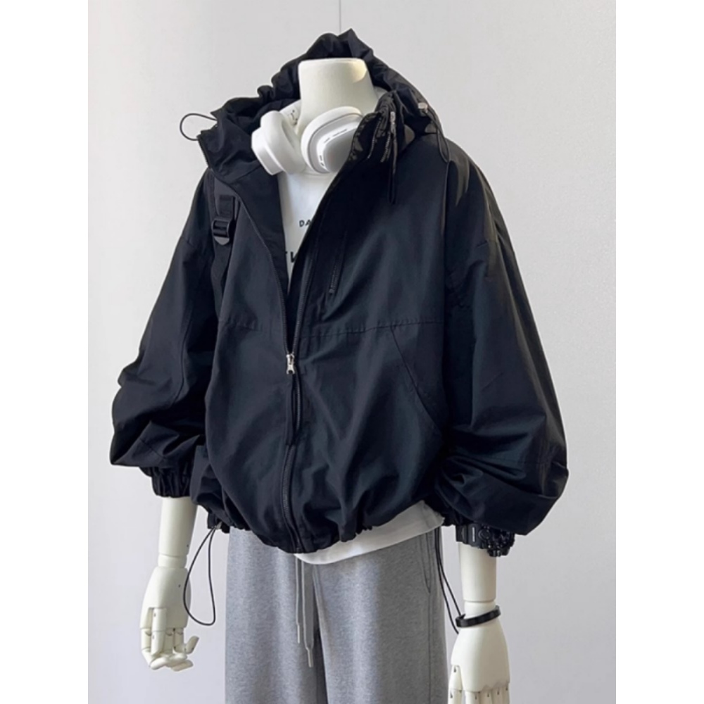 블랙 드로우 스트링 후드 재킷 여성의 가을 디자인 센스 우아한 루즈 슬림 프록 탑
