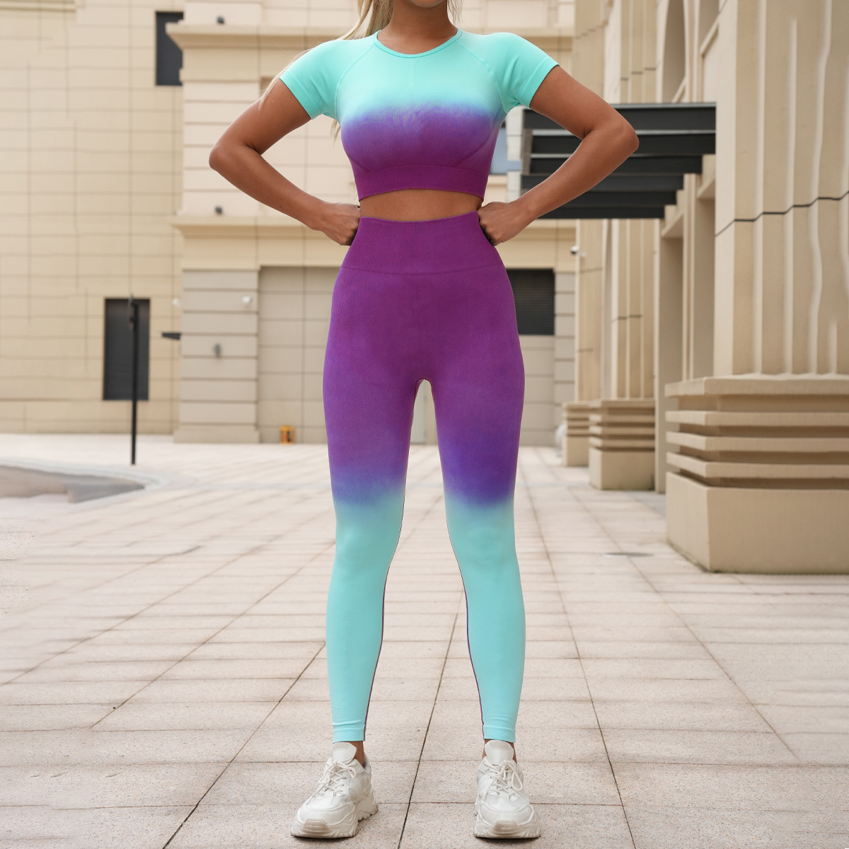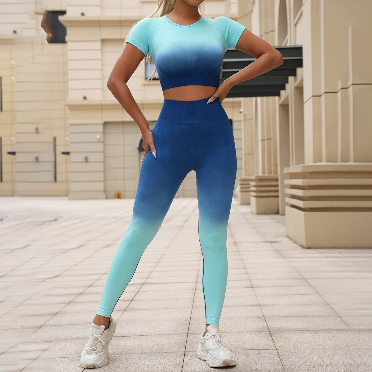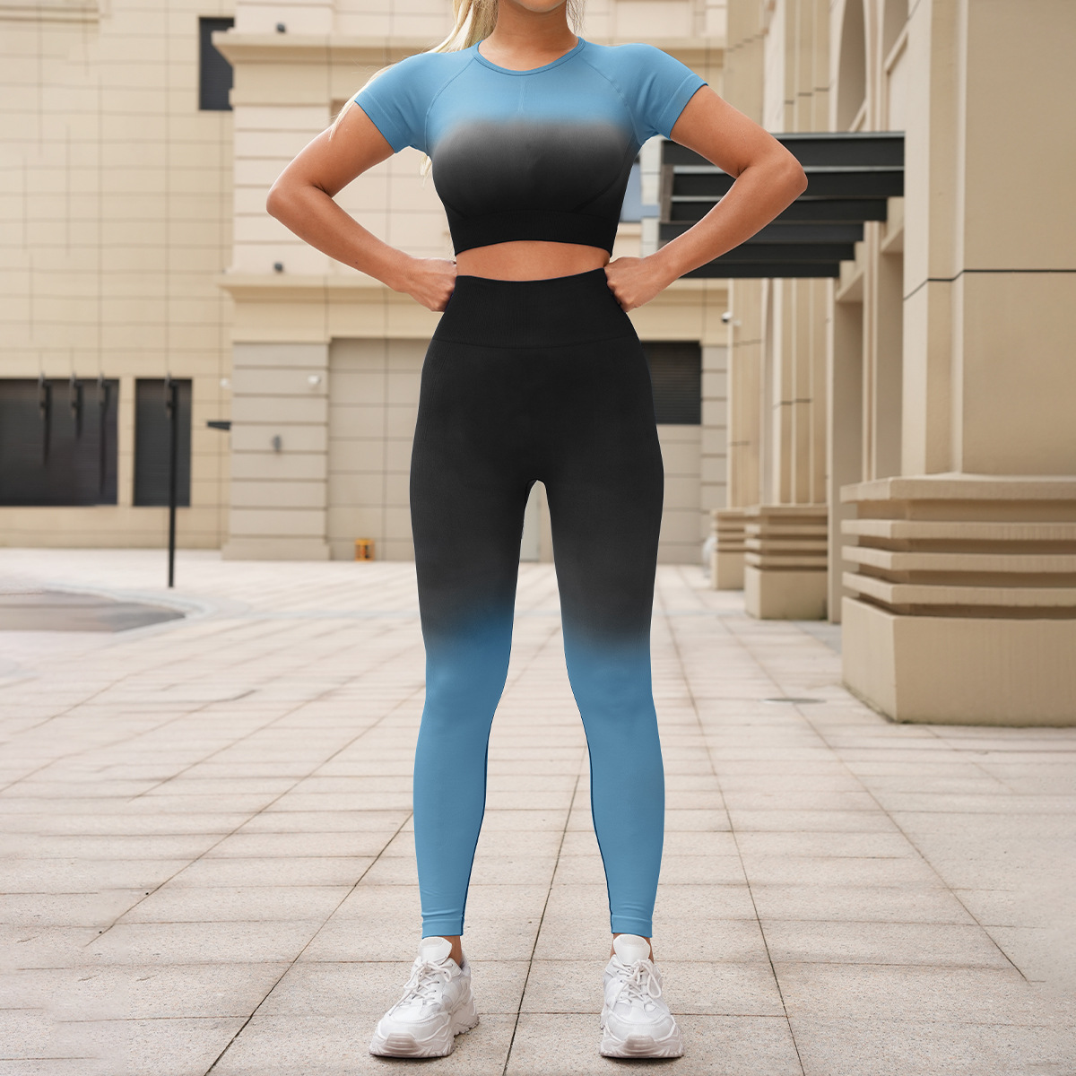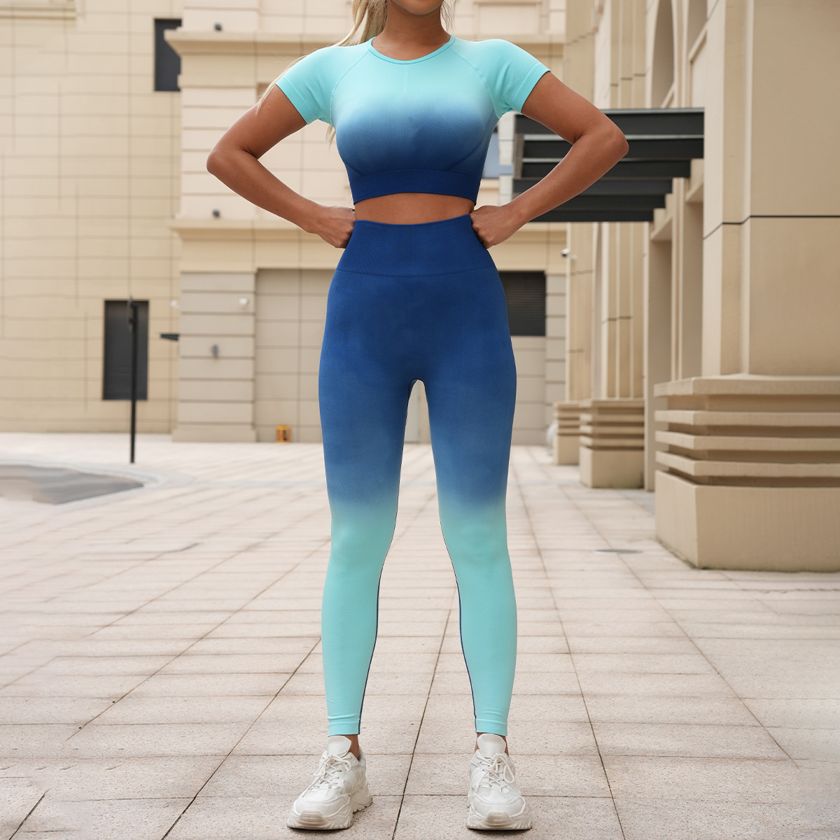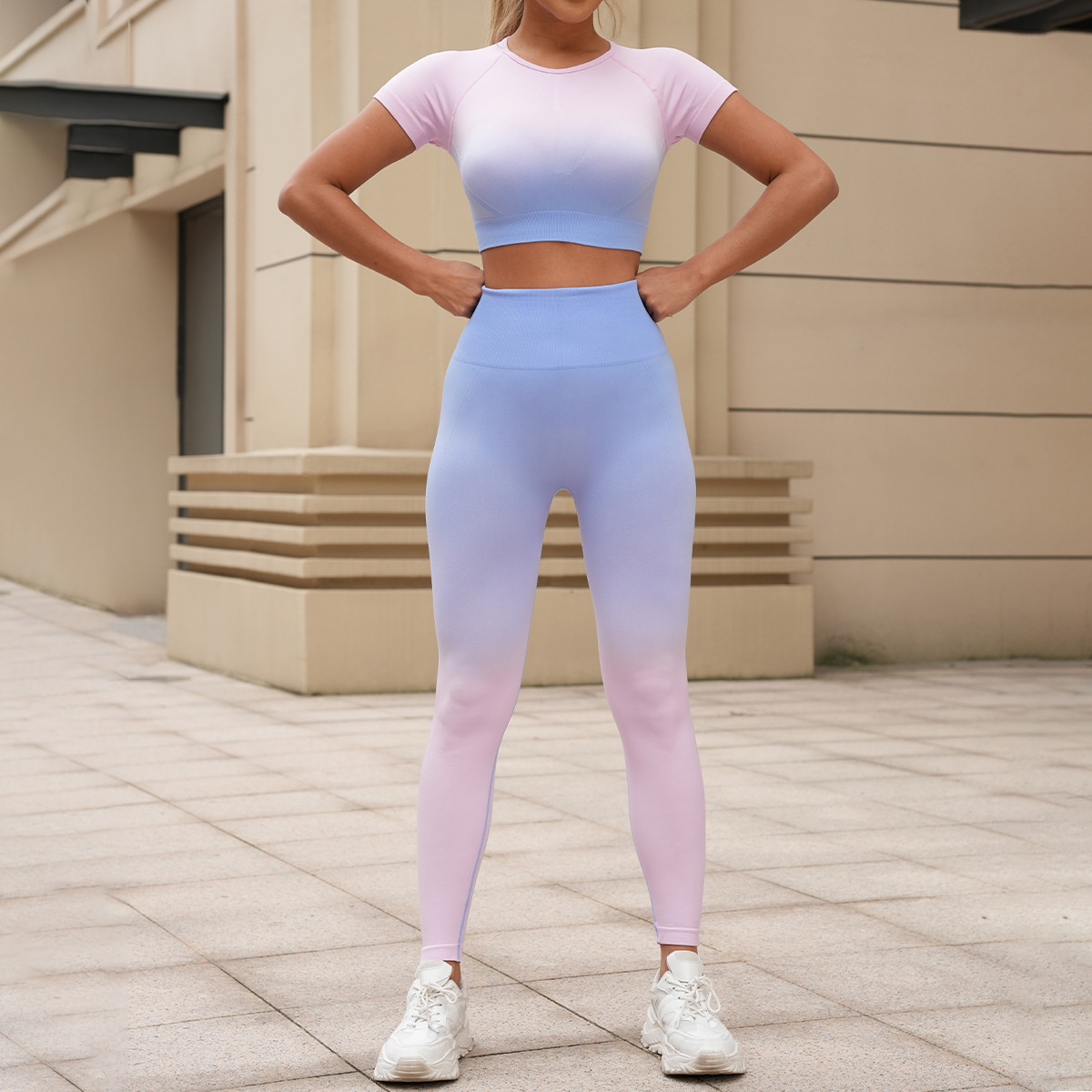 국경 간 그라디언트 원활한 요가 세트 세트 여성의 빠른 건조 스포츠 피트니스 세트 최고 반팔 복숭아 엉덩이 요가 바지