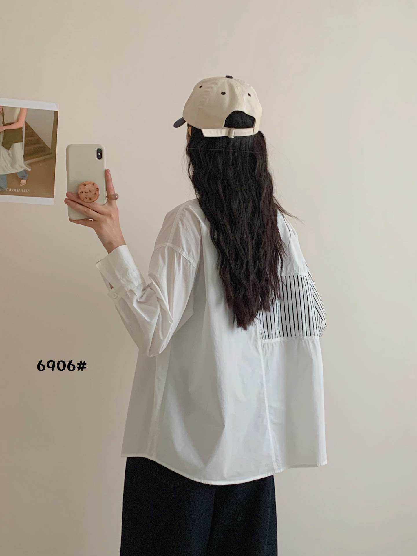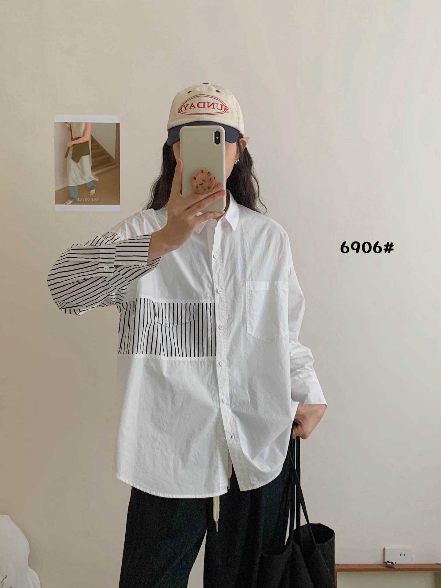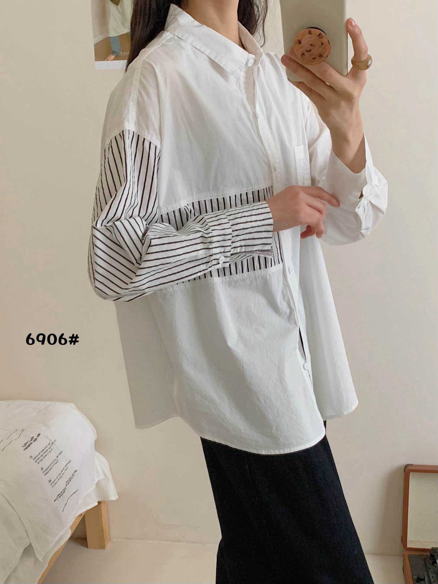 맞춤형 디자인 센스 스트라이프 바느질 긴팔 셔츠 여성의 봄 한국식 루즈 스택 캐주얼 탑스토어 가기