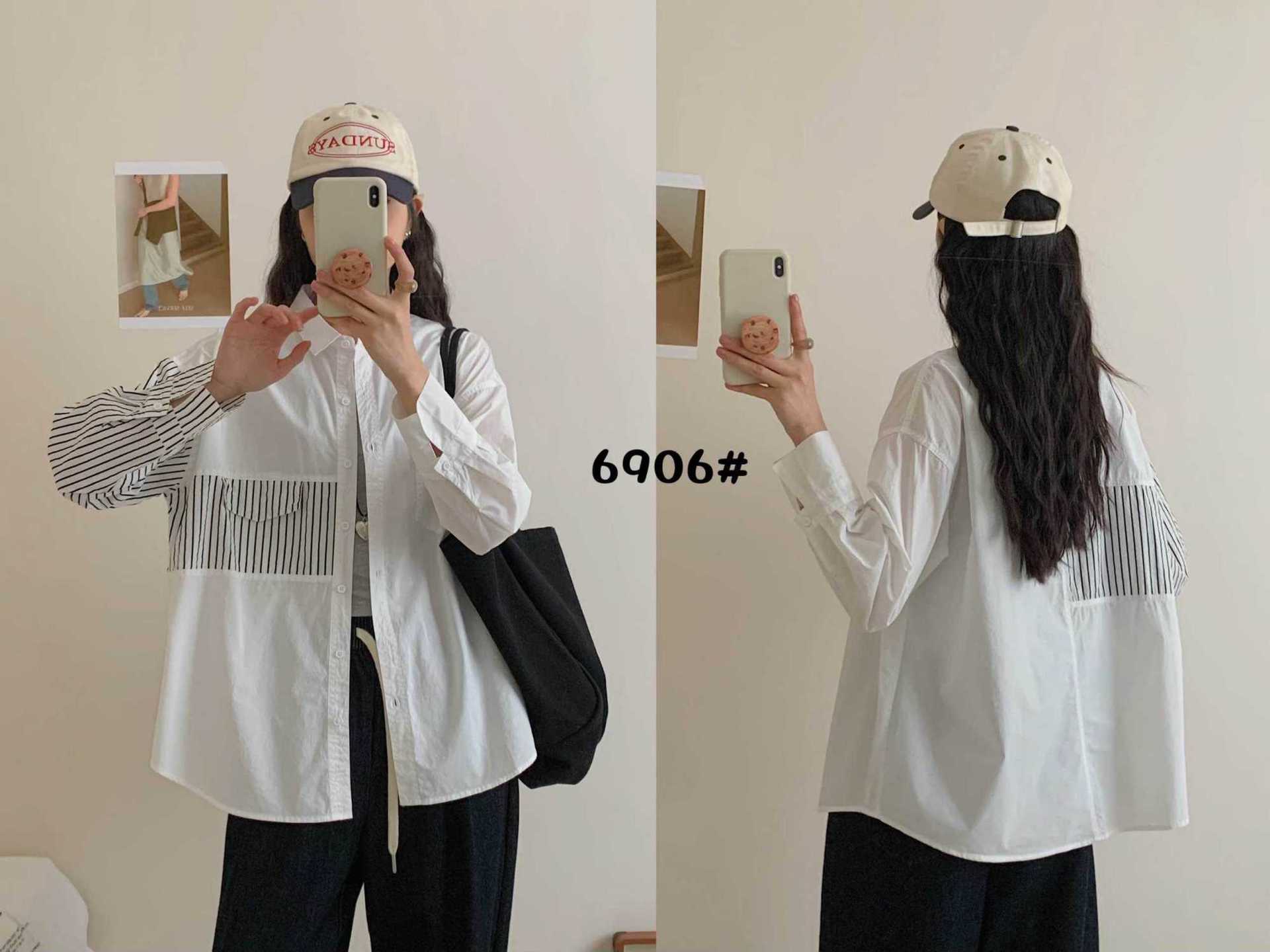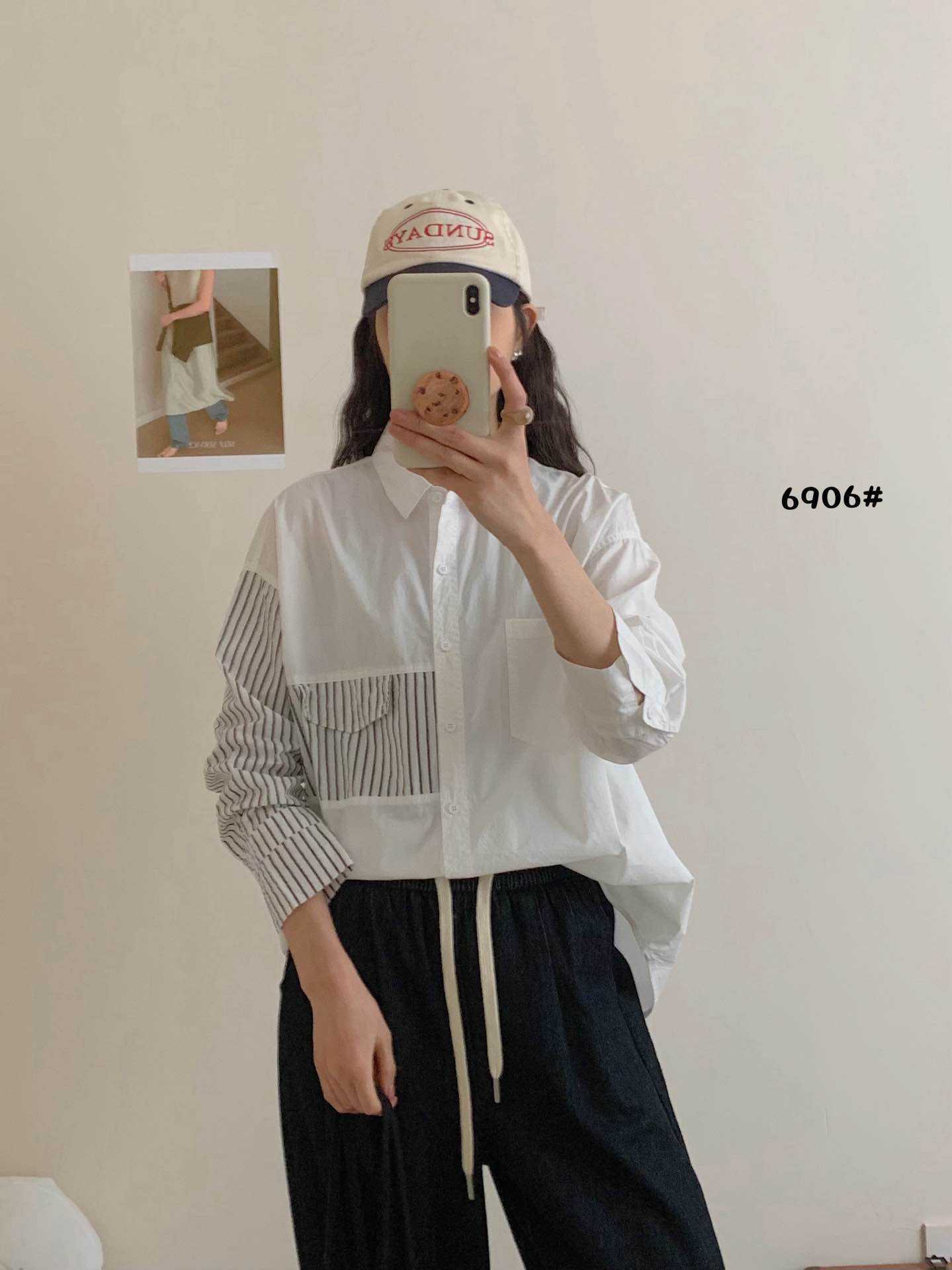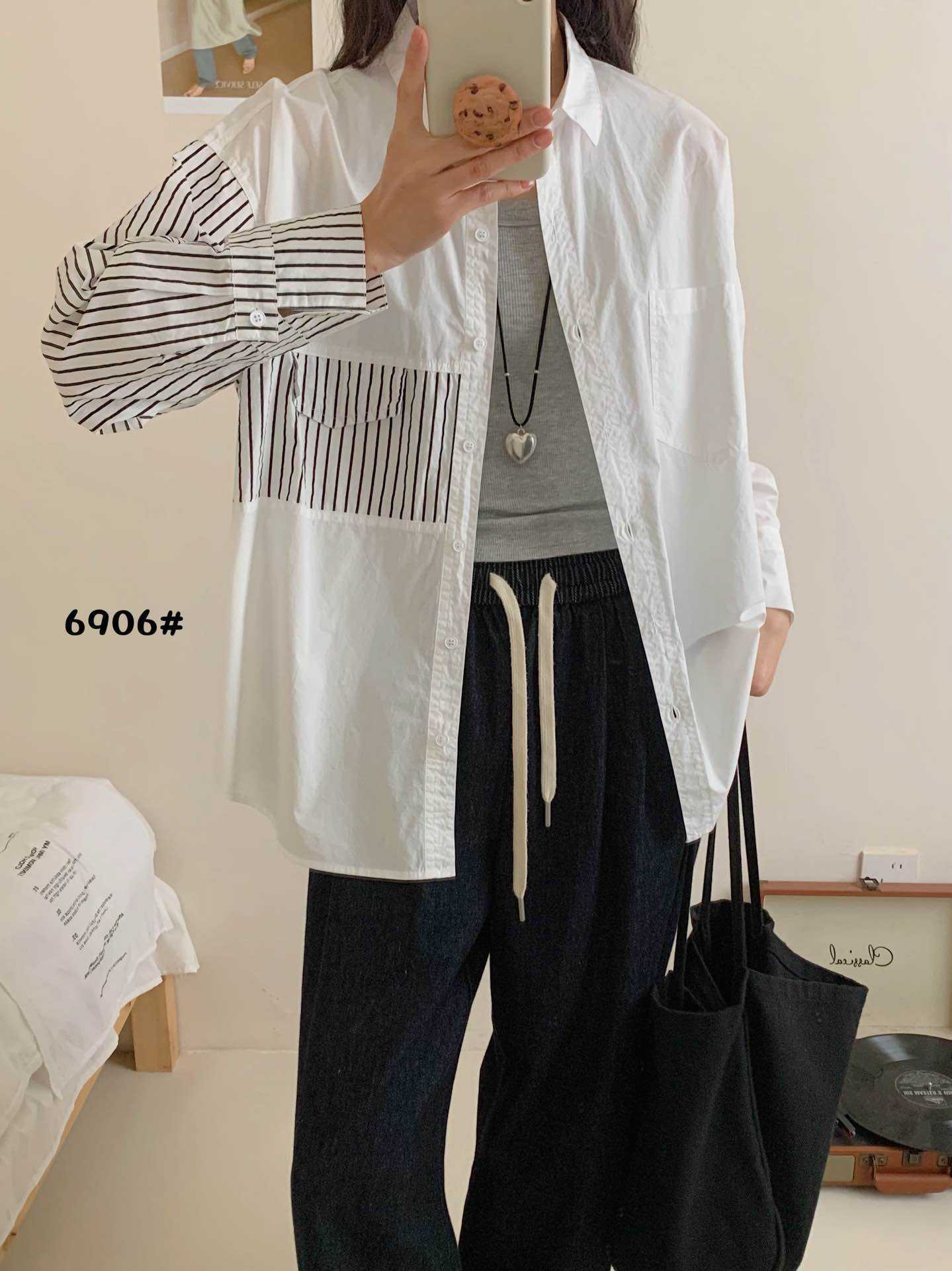 맞춤형 디자인 센스 스트라이프 바느질 긴팔 셔츠 여성의 봄 한국식 루즈 스택 캐주얼 탑스토어 가기