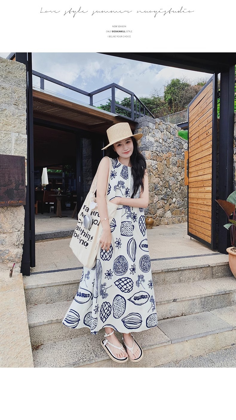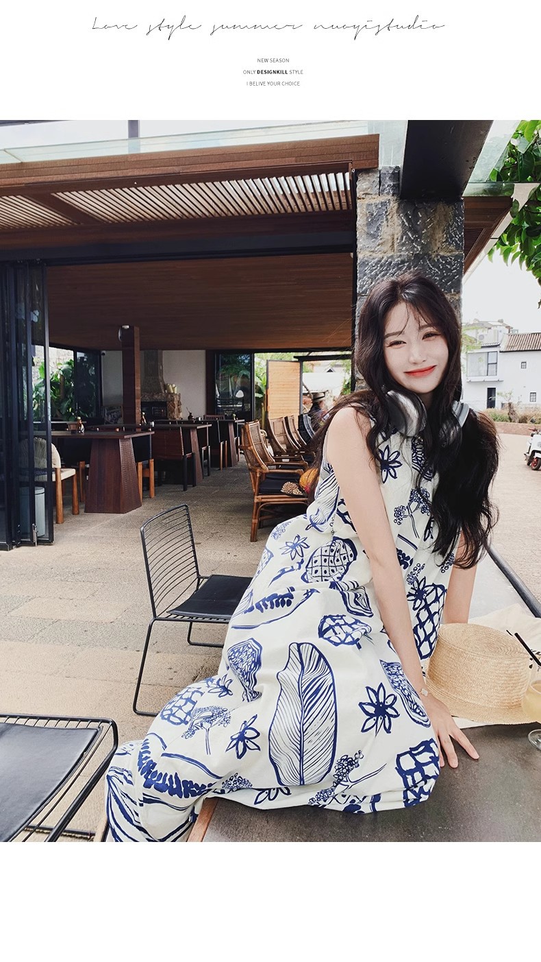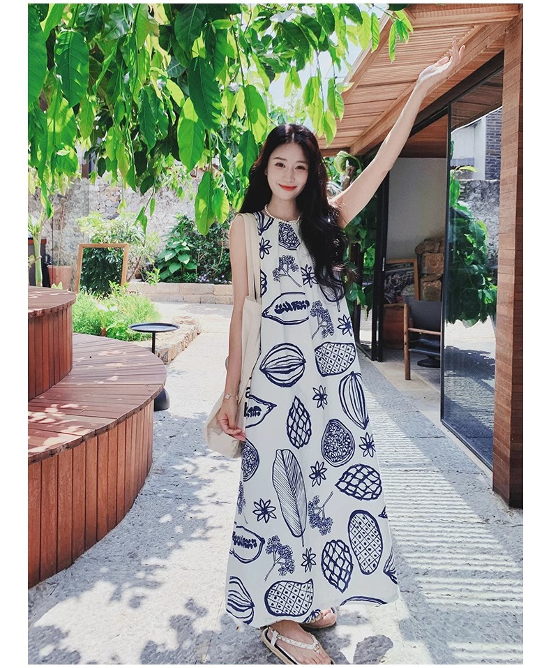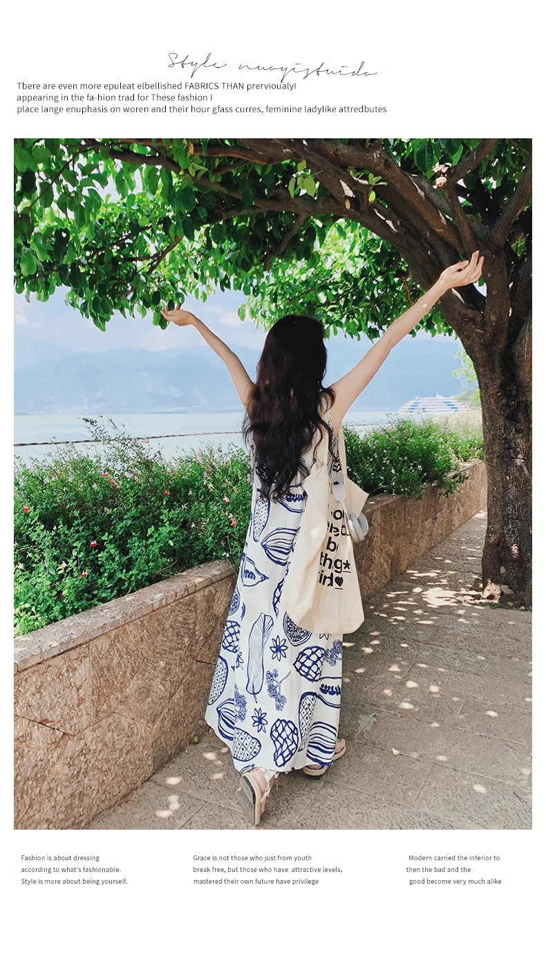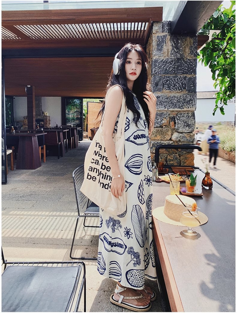 디자인 센스 인쇄 조끼 원피스 여성 여름 2025 새로운 해변 휴가 느슨한 슬리밍 우아한 긴 원피스스토어 가기