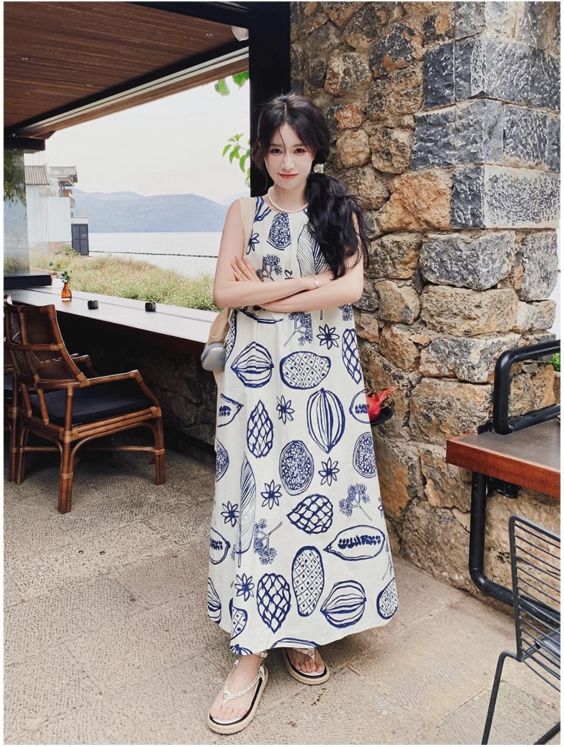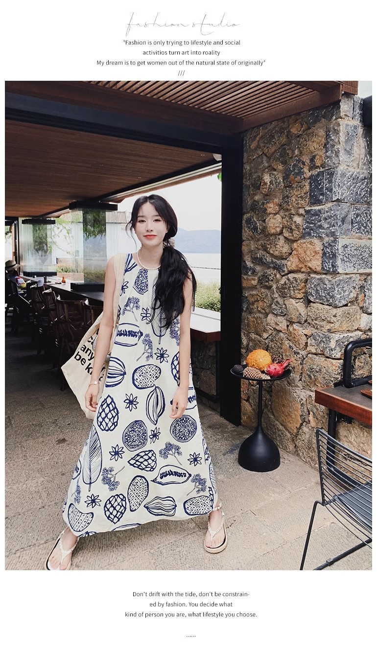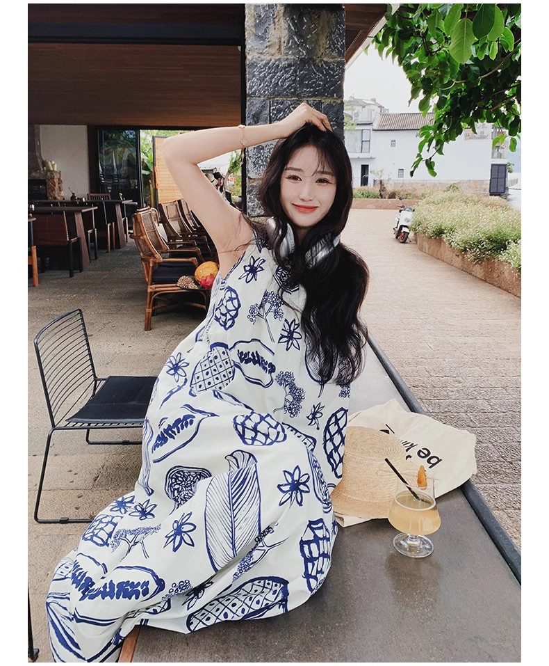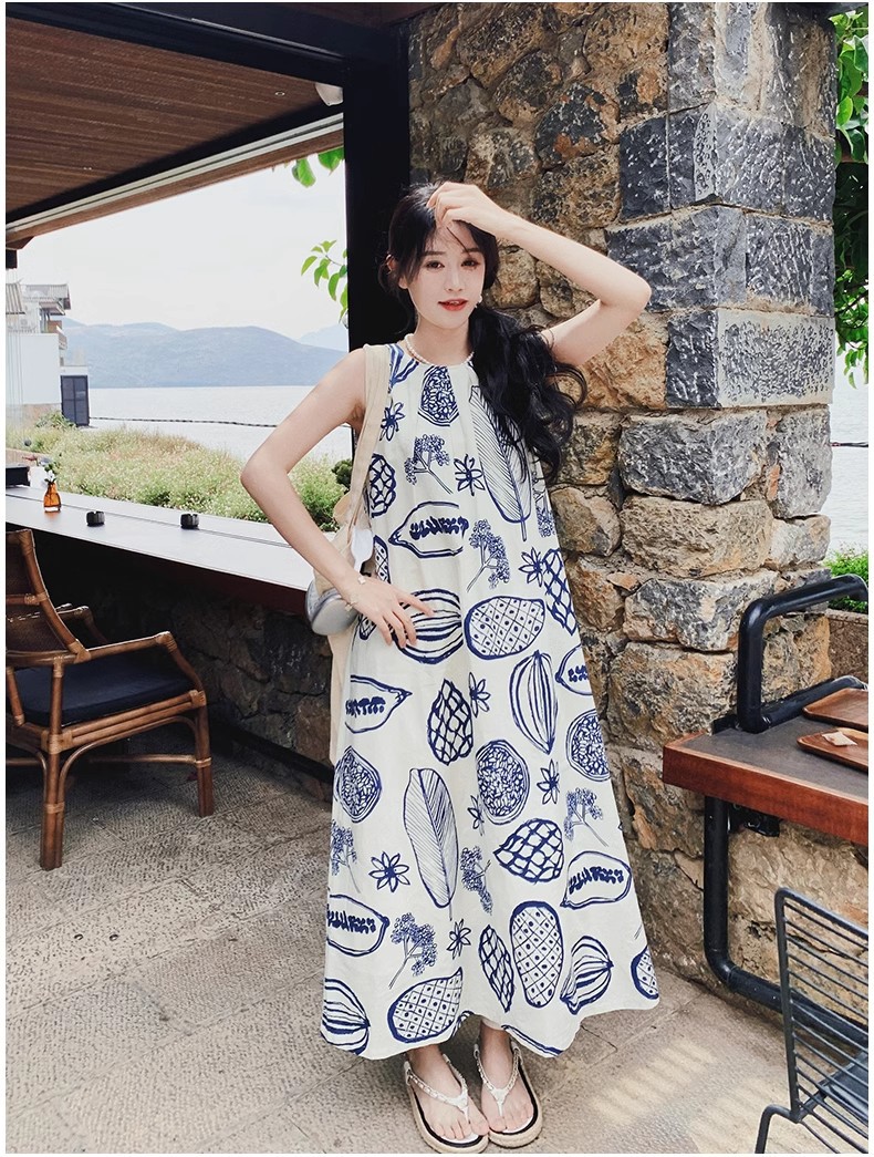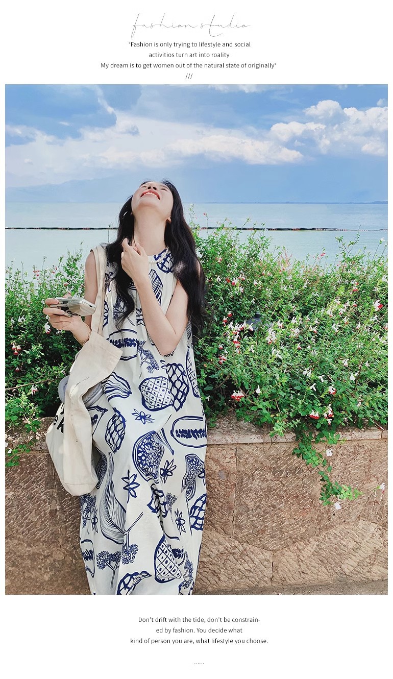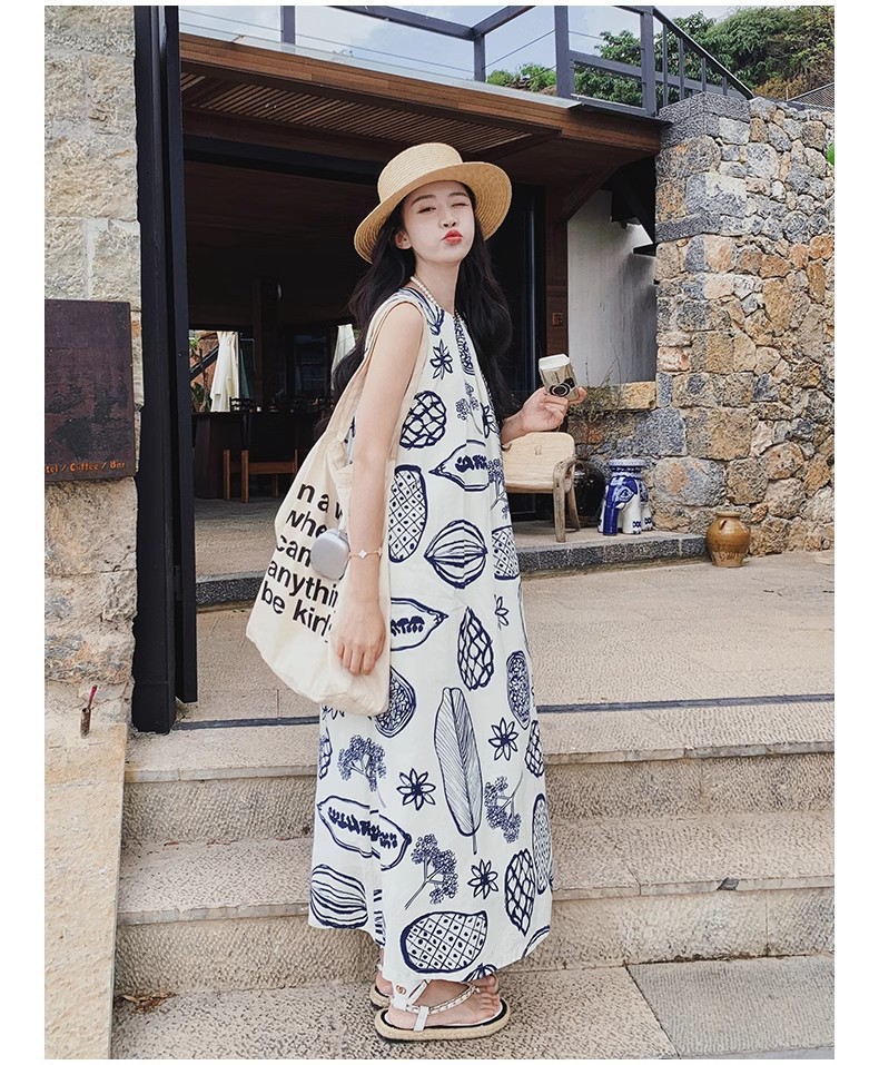 디자인 센스 인쇄 조끼 원피스 여성 여름 2025 새로운 해변 휴가 느슨한 슬리밍 우아한 긴 원피스스토어 가기