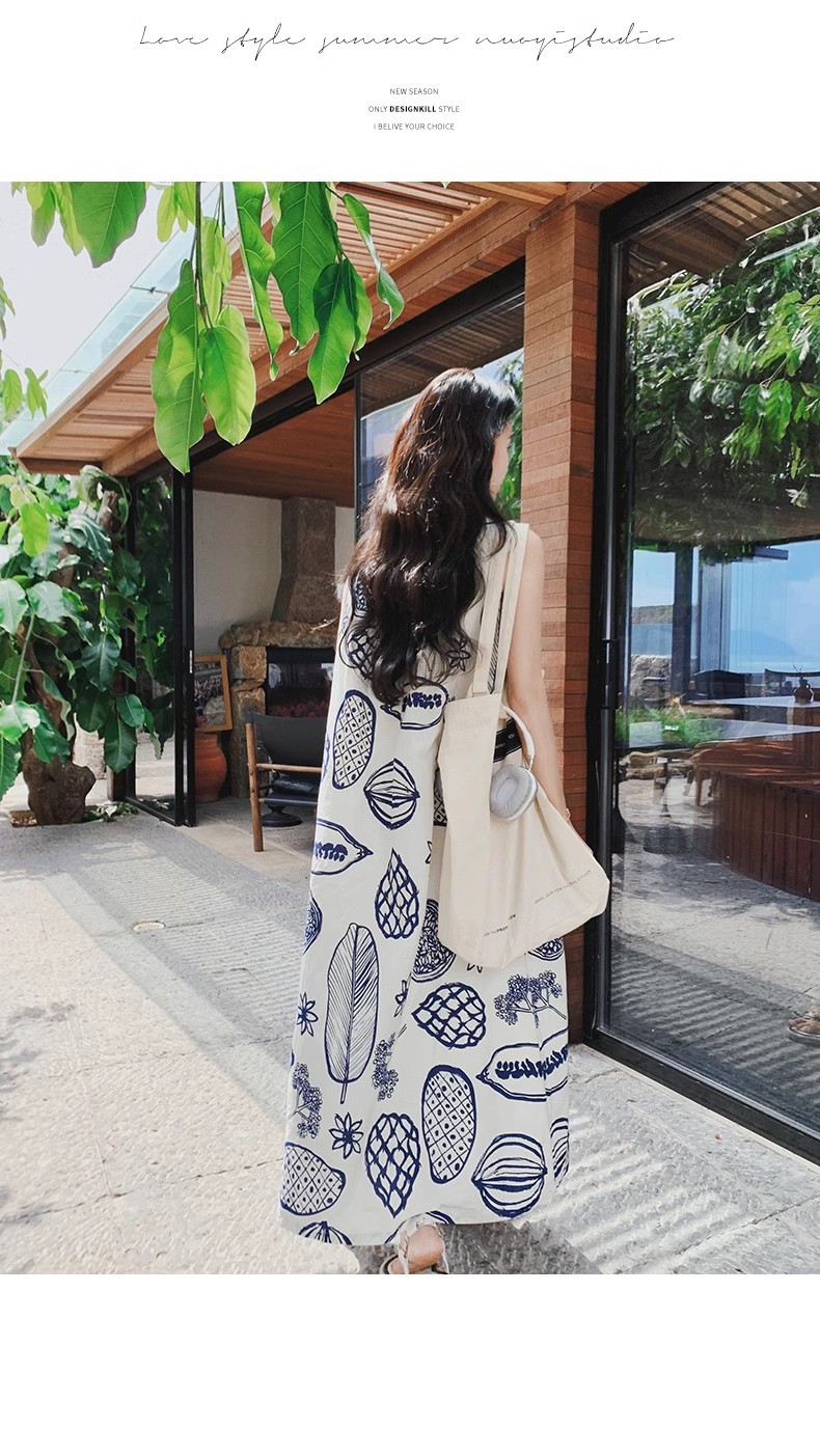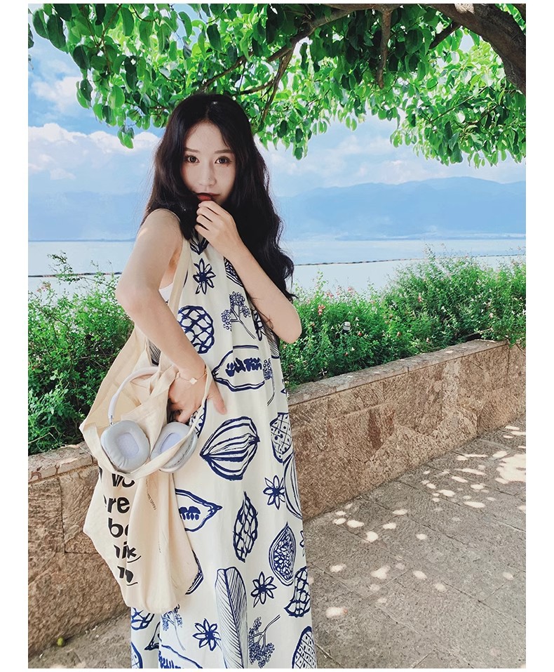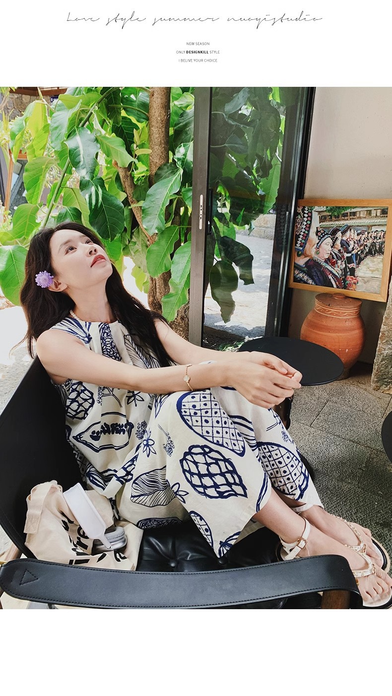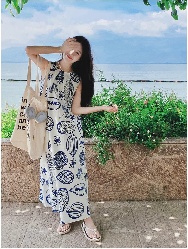 디자인 센스 인쇄 조끼 원피스 여성 여름 2025 새로운 해변 휴가 느슨한 슬리밍 우아한 긴 원피스