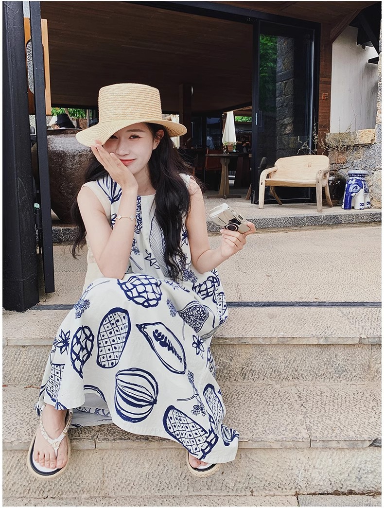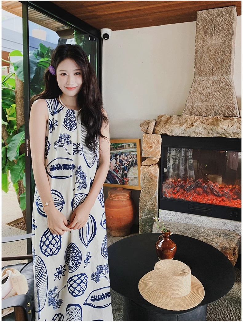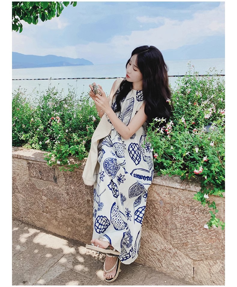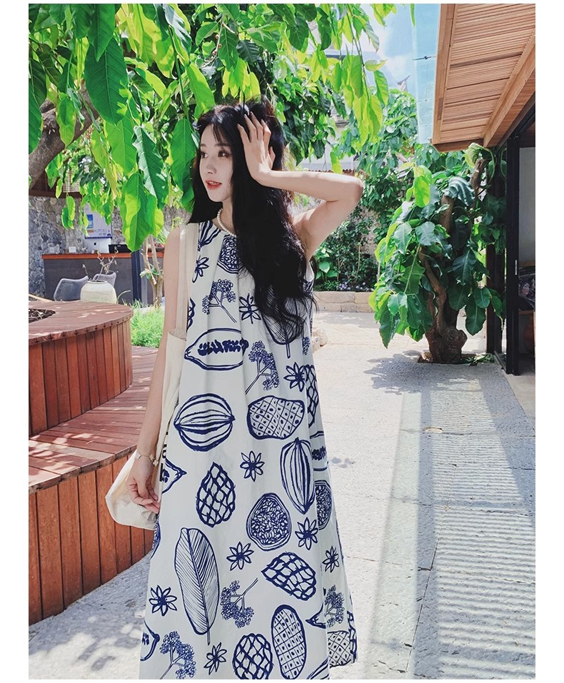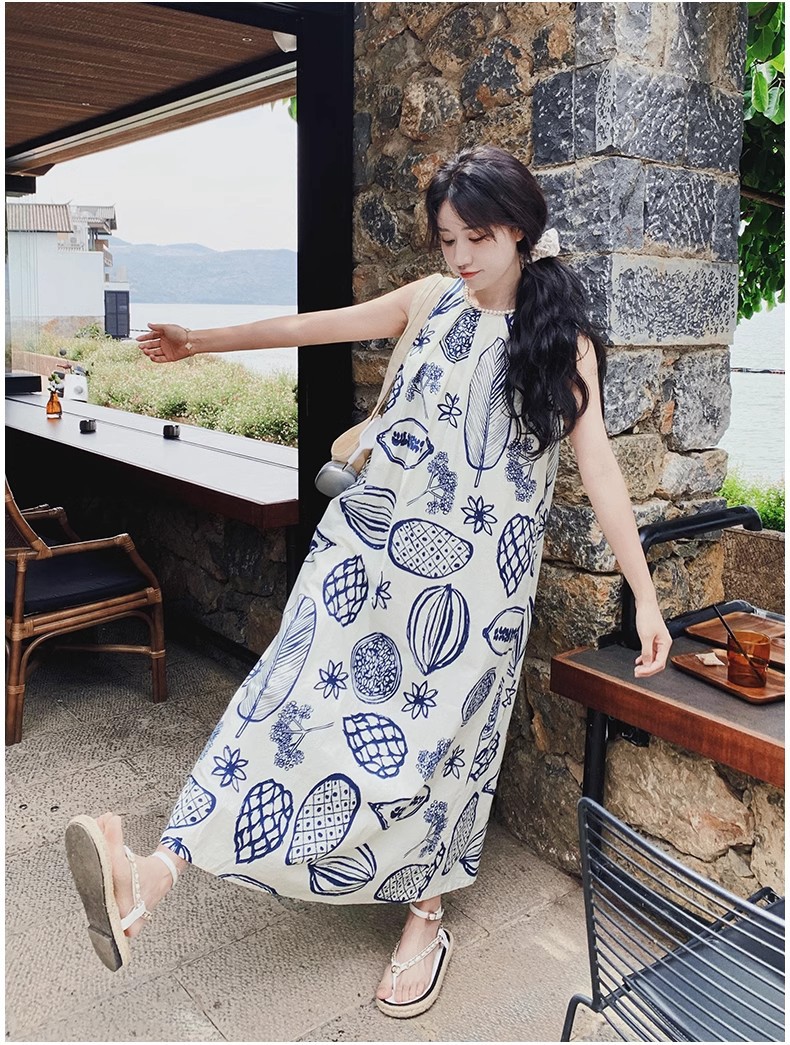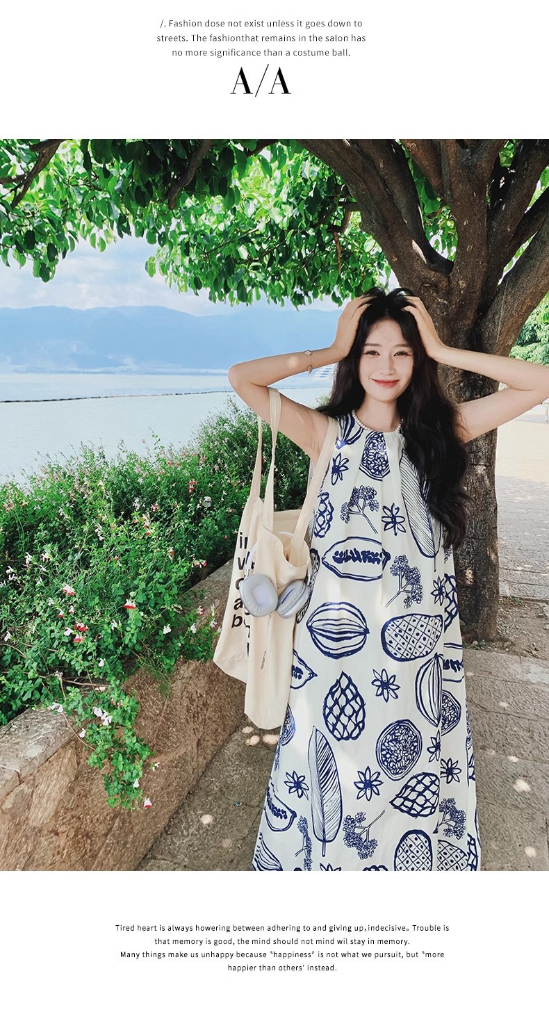 디자인 센스 인쇄 조끼 원피스 여성 여름 2025 새로운 해변 휴가 느슨한 슬리밍 우아한 긴 원피스
