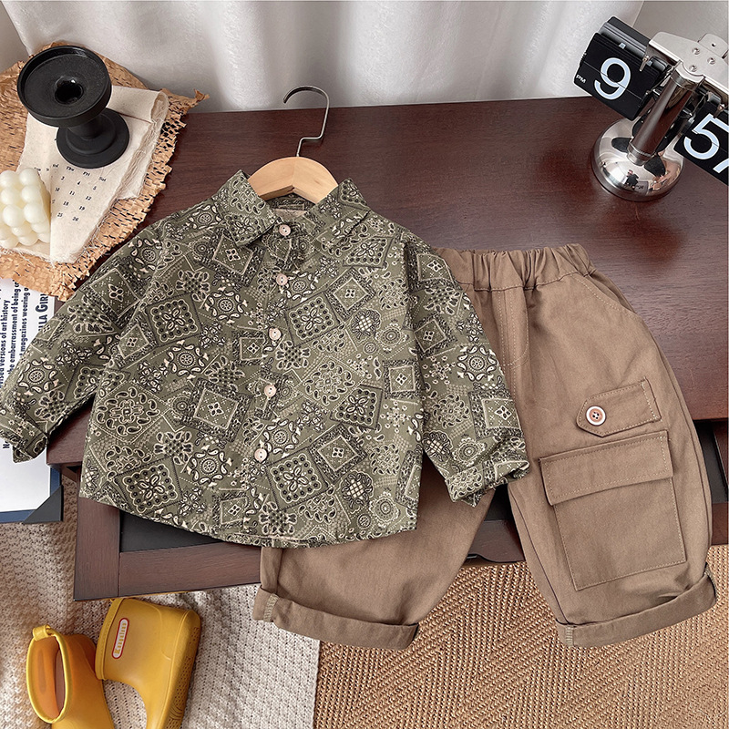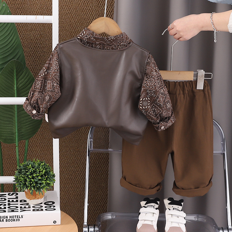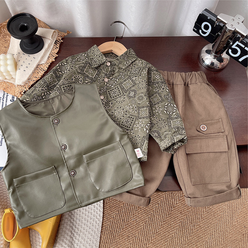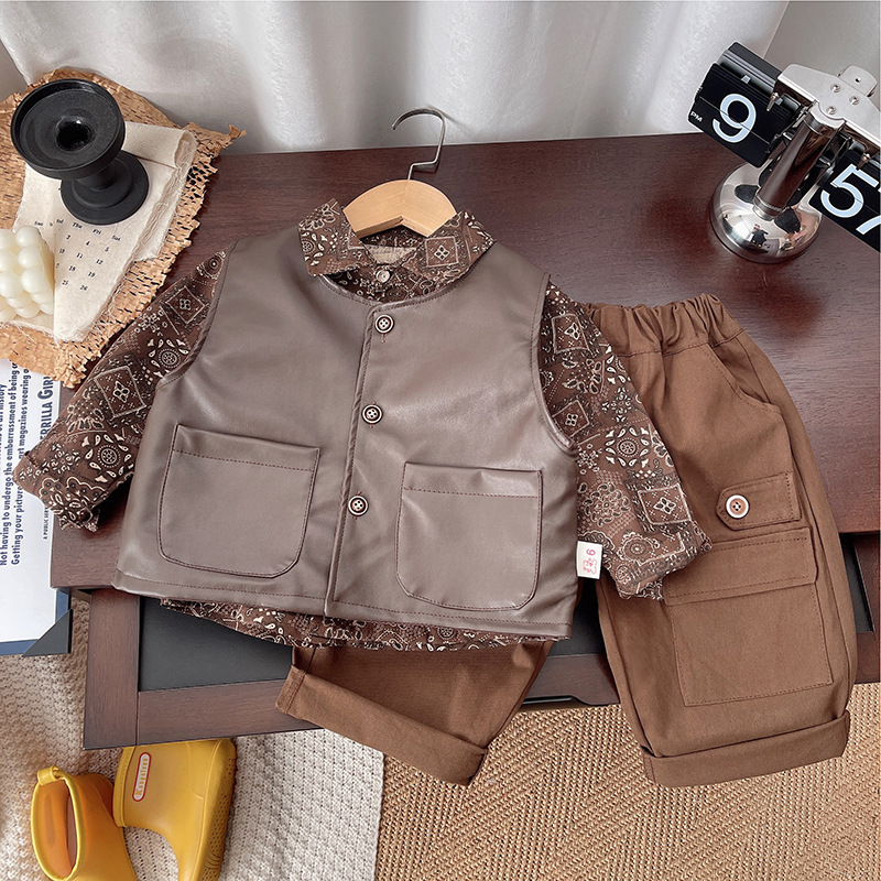 소년 봄 3 조각 세트 어린이 가죽 조끼 2025 봄과 가을 새로운 어린이 꽃 셔츠 캐주얼 바지 세트 트렌디스토어 가기