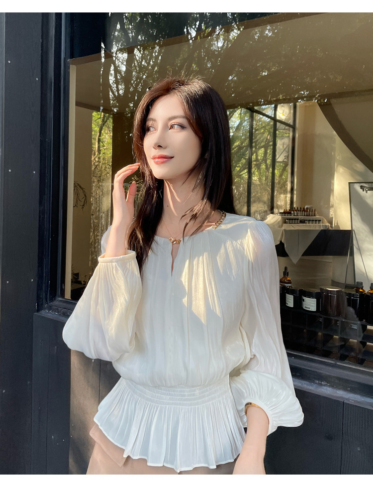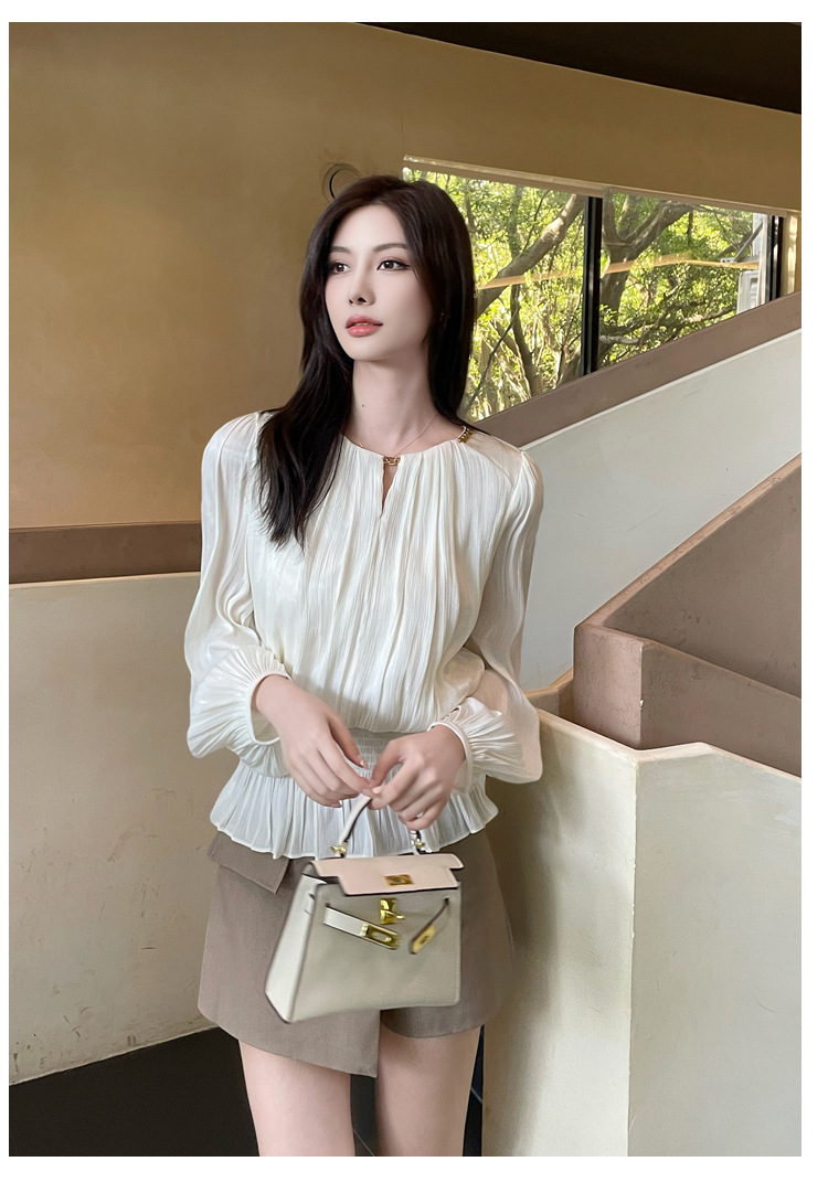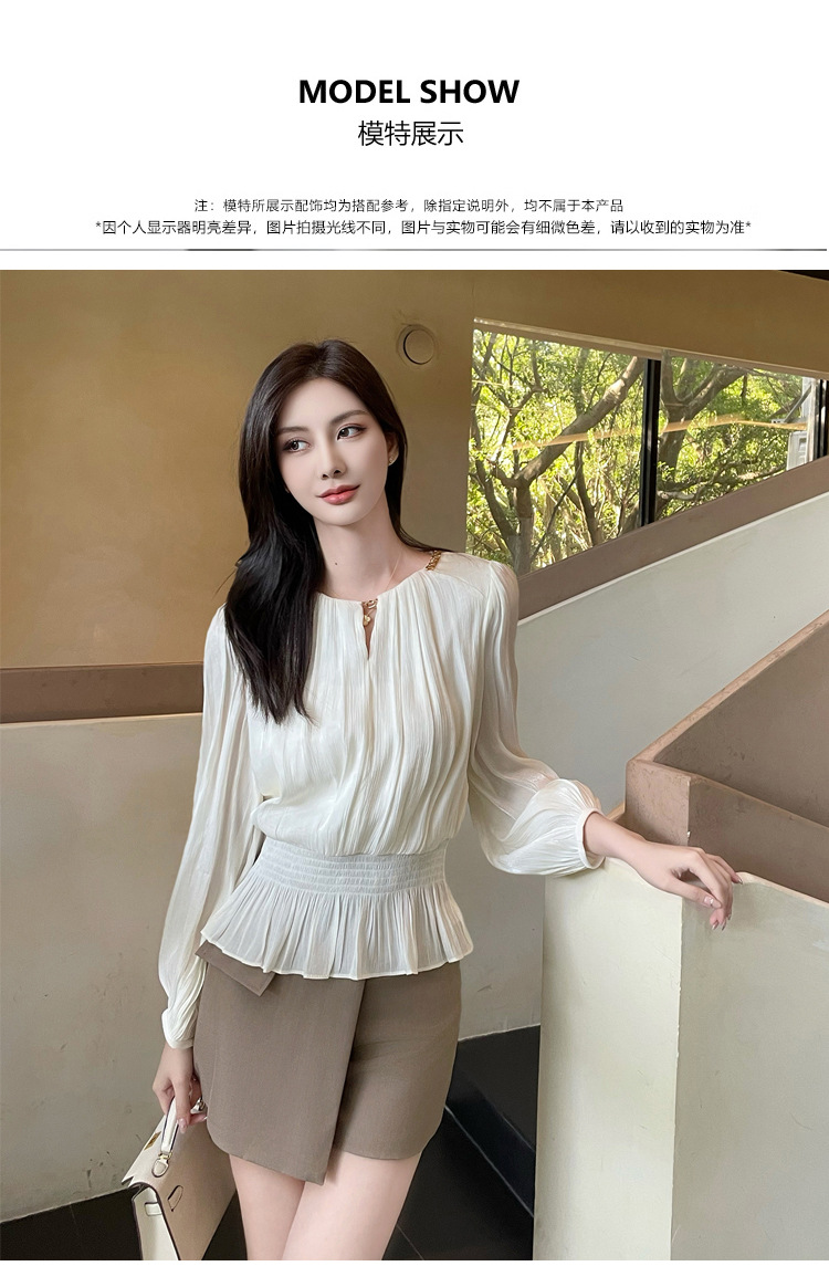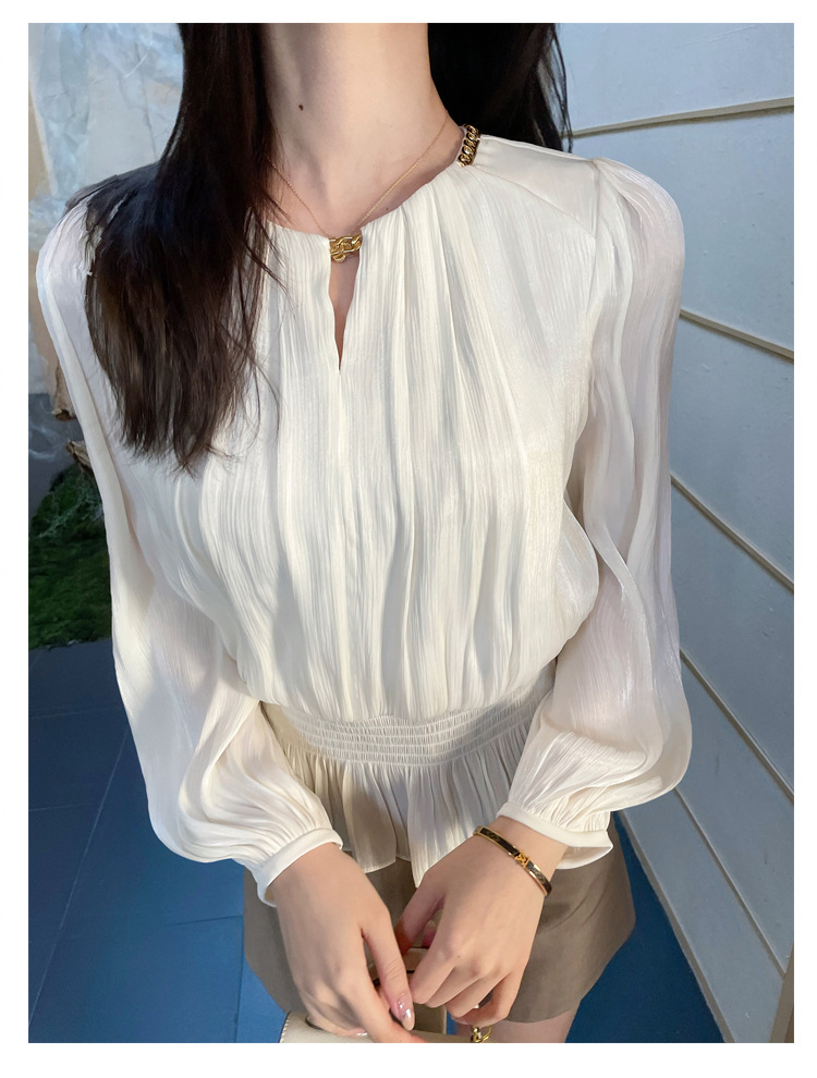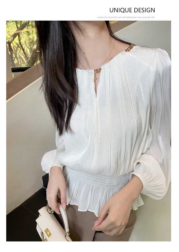2025 한국 슬림핏 라운드넥 체인 디자인 솔리드 컬러 허리라인 롱슬리브 쉬폰 셔츠 여성용 봄 얇은 상의 체인 디자인스토어 가기
