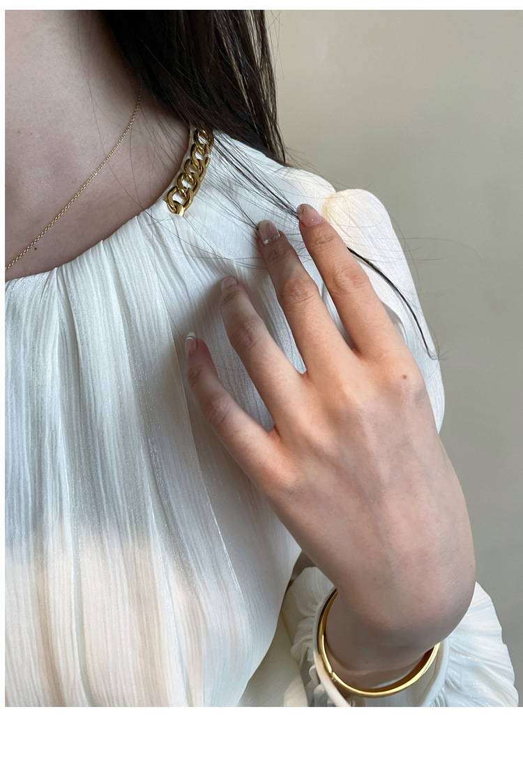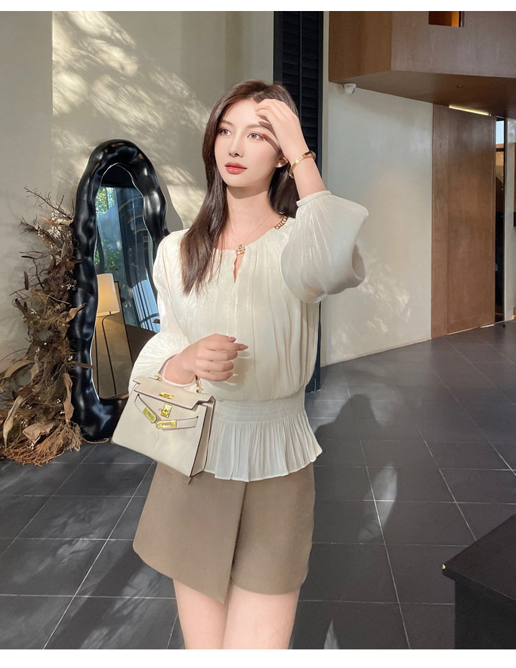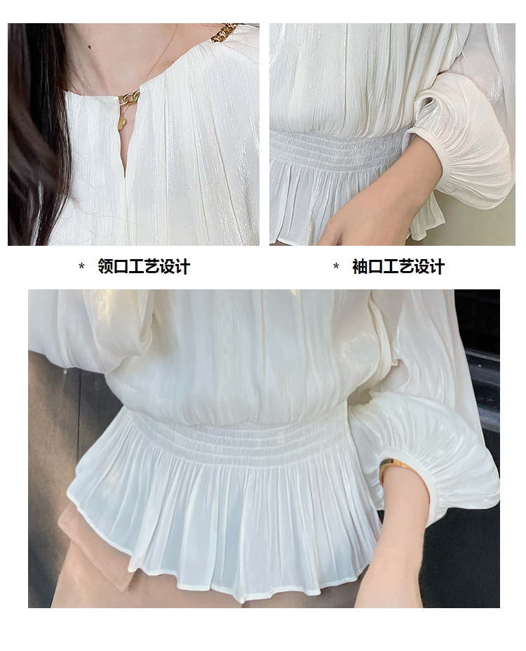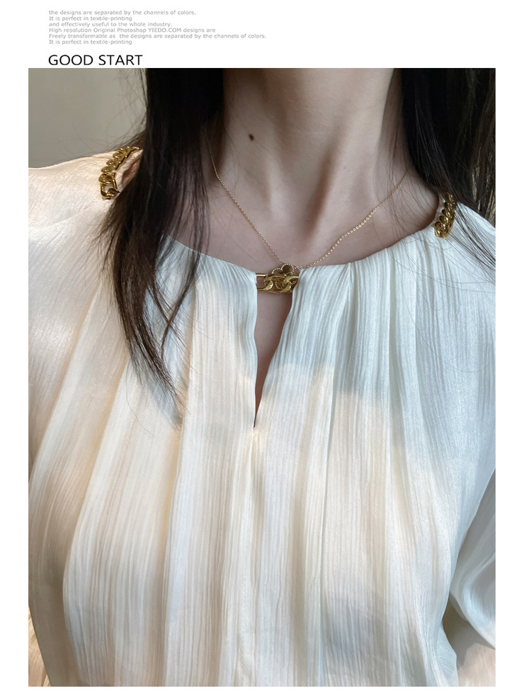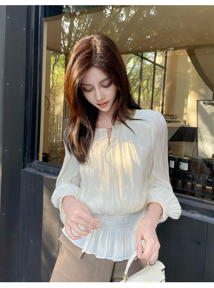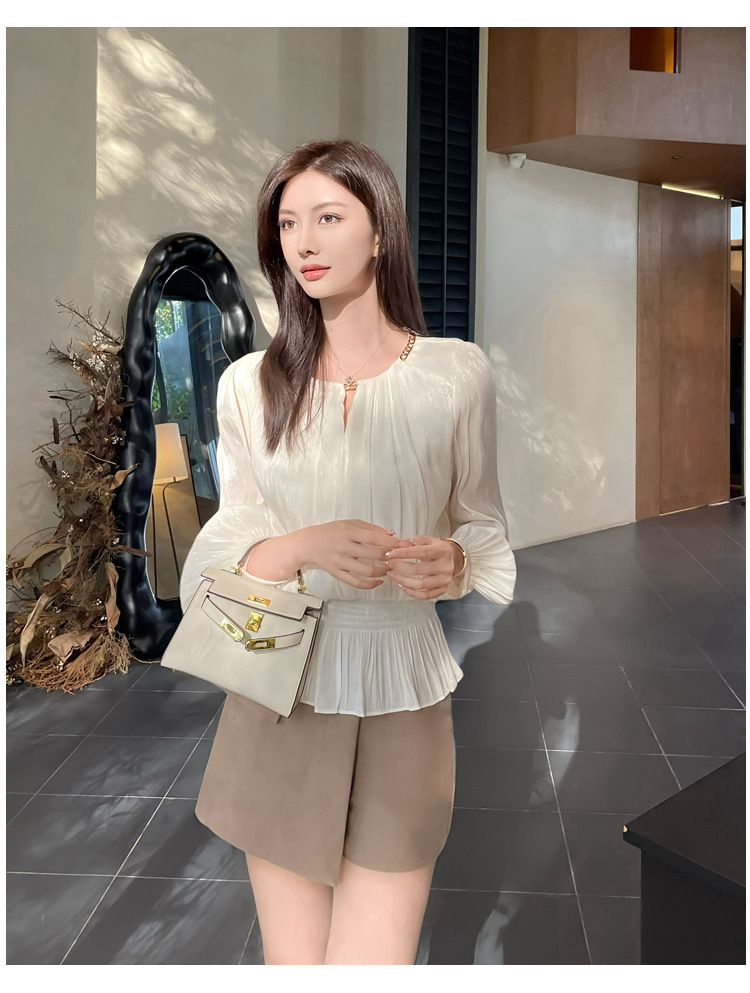 2025 한국 슬림핏 라운드넥 체인 디자인 솔리드 컬러 허리라인 롱슬리브 쉬폰 셔츠 여성용 봄 얇은 상의 체인 디자인스토어 가기