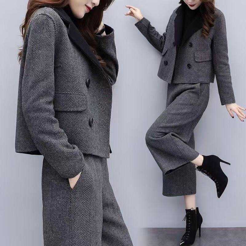 신상 여성복 2025 가을 겨울 투피스 세트 헤링본 패턴 모직 재킷 와이드 팬츠 캐주얼 패션 세트 여성 트렌드