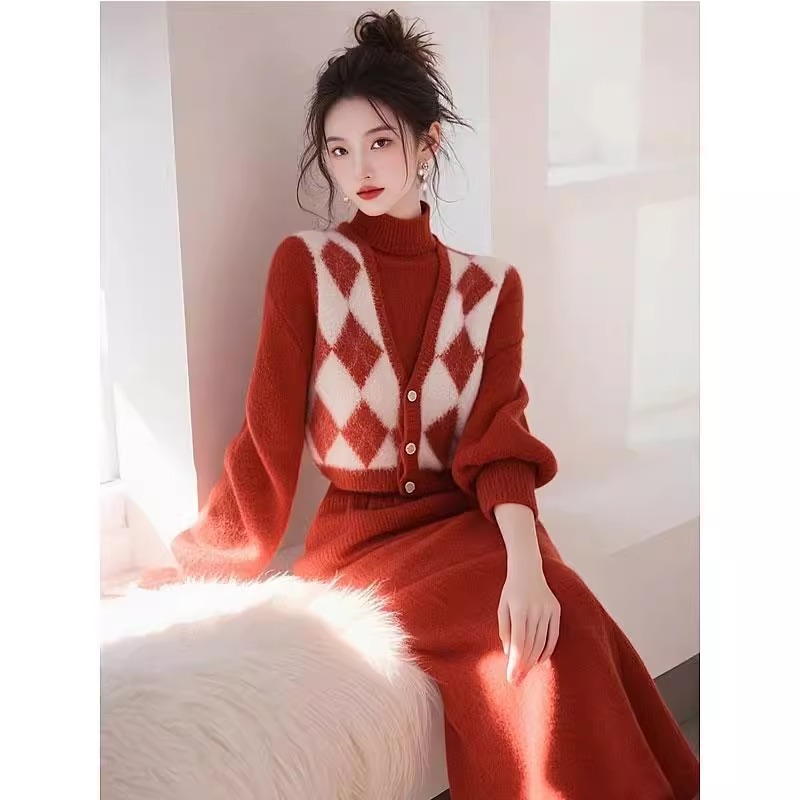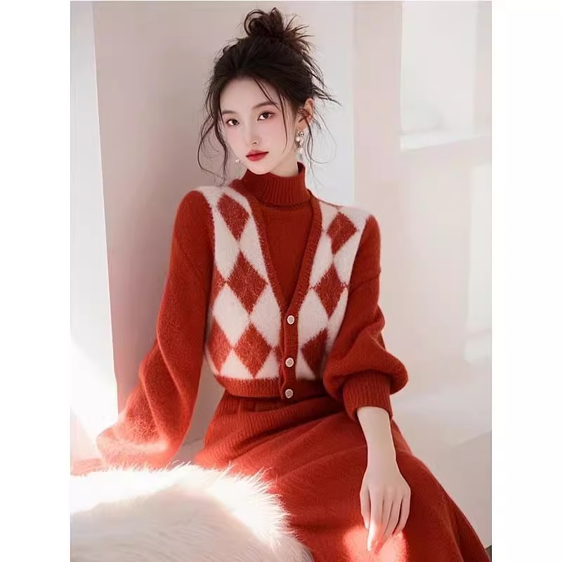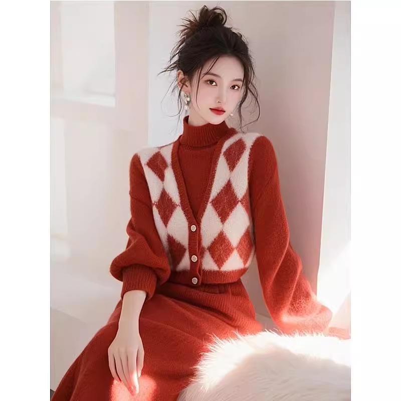 가을과 겨울 젠틀웨어 여성 서양식 크리스마스 설날 감소 서양식 마름모 조끼 원피스 투피스 세련된 세트스토어 가기