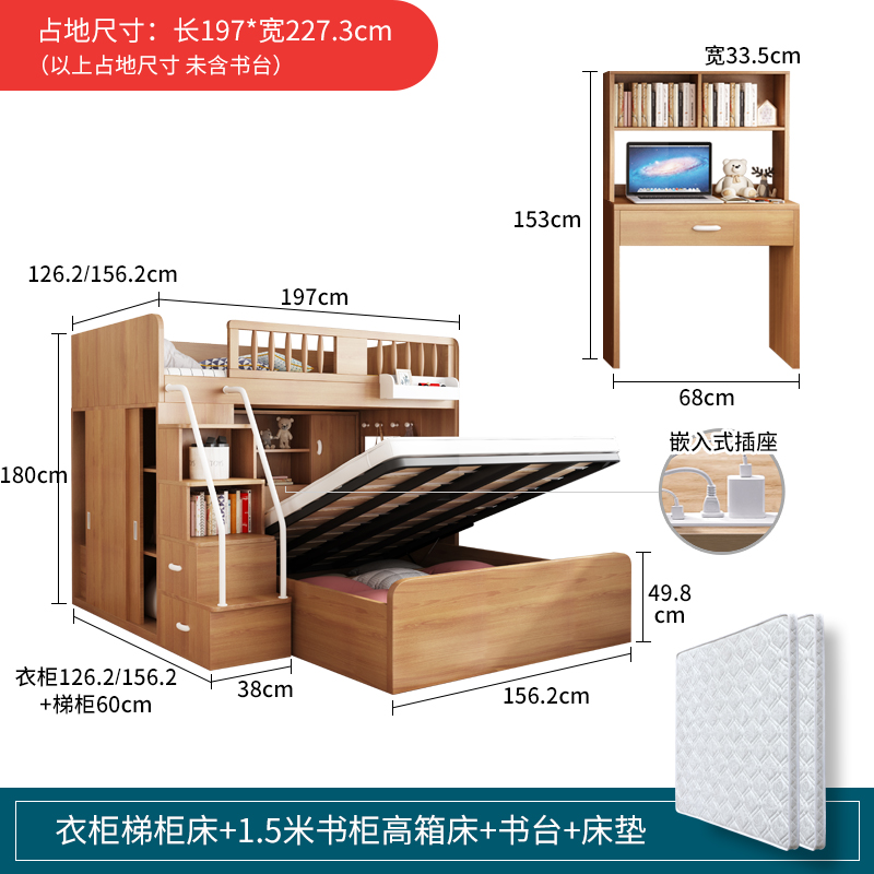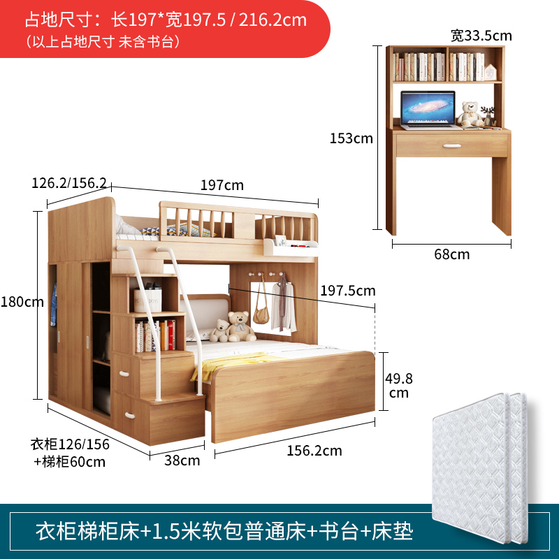 • §※✪☆§옷장 사다리 침대 + 1.5m 소프트 하이 박스 침대 + 책상 + 매트리스§※✪☆§