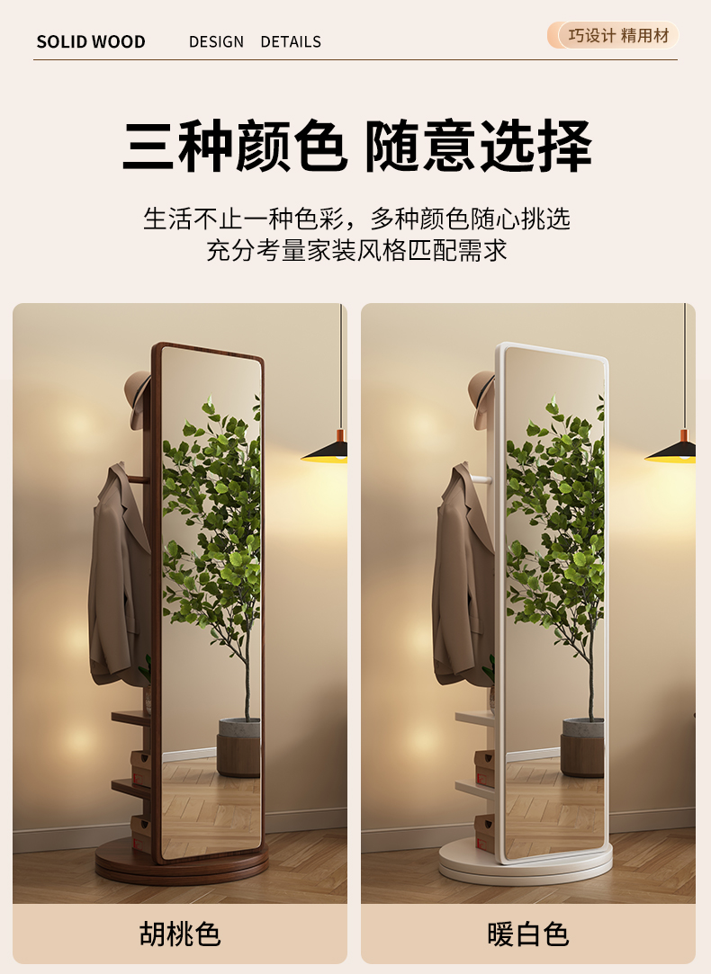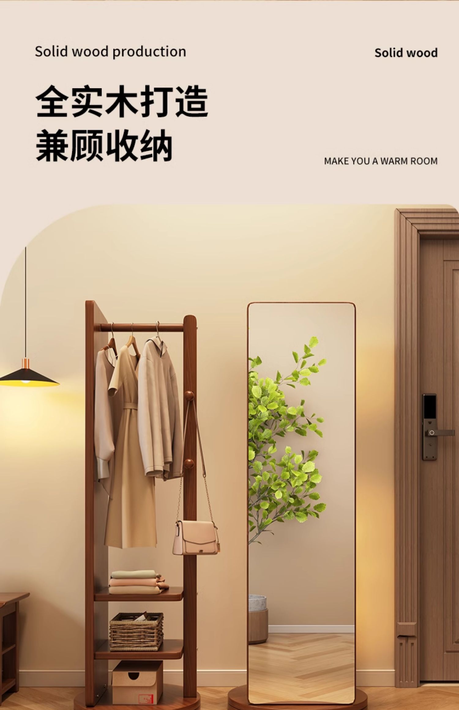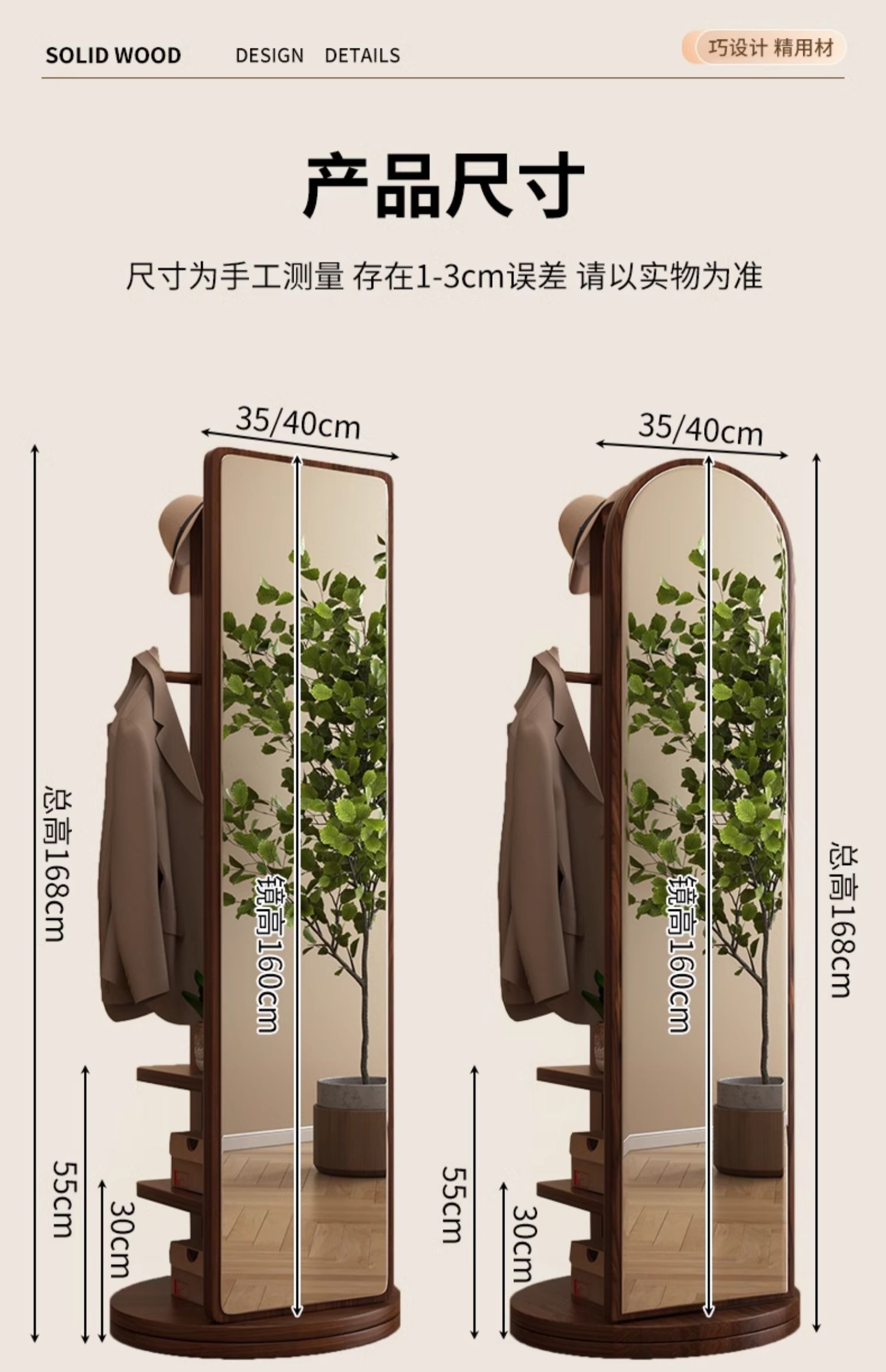 L * 단단한 나무 전체 길이 거울 드레스 거울 바닥 거울 가정용 침실 회전 가능한 모바일 통합 피팅 거울 옷걸이