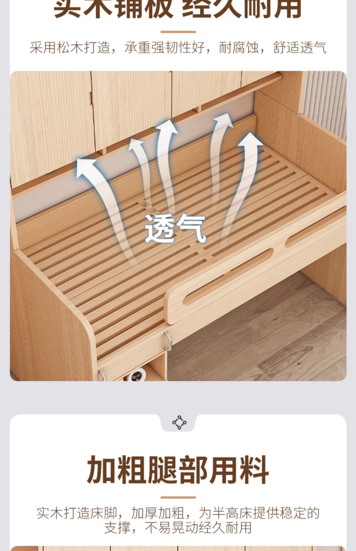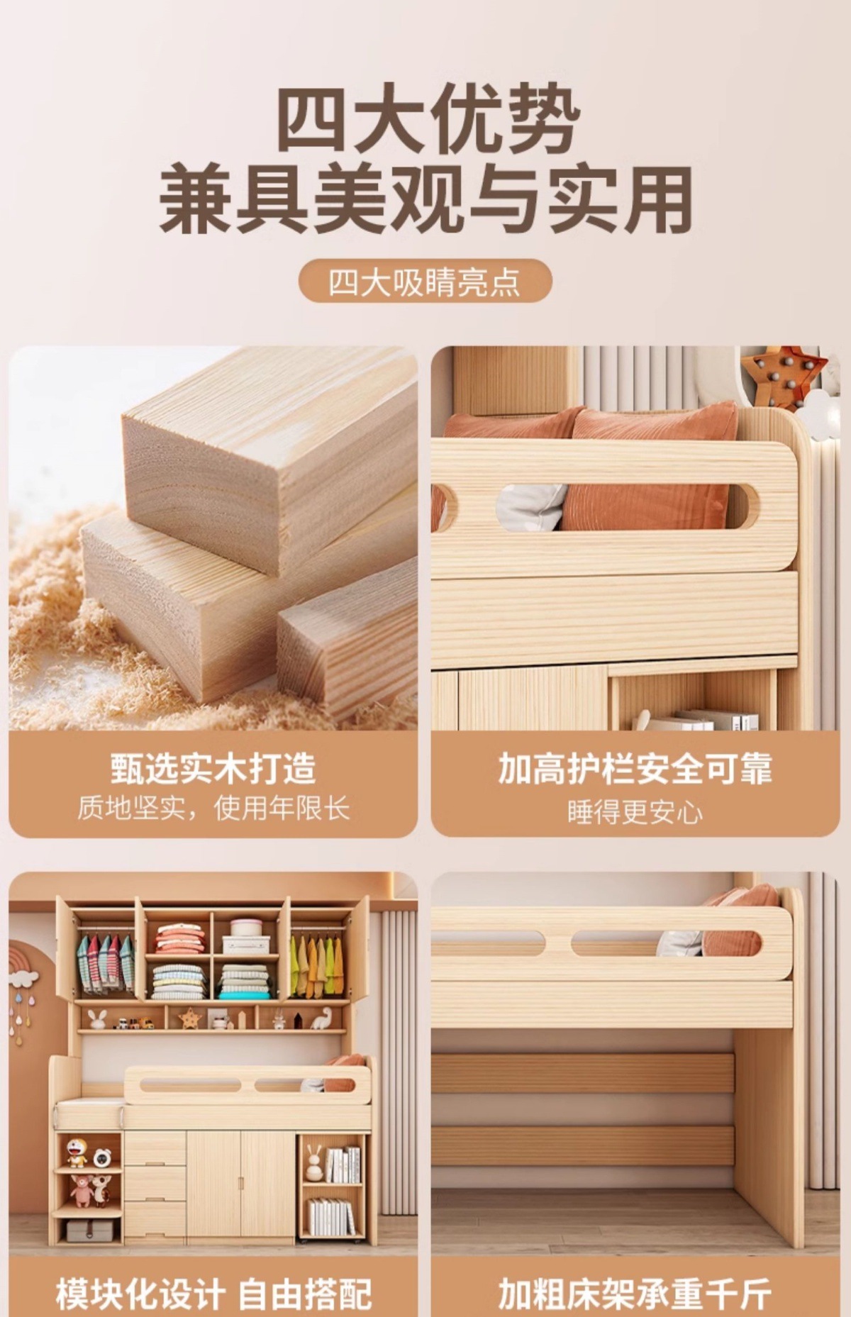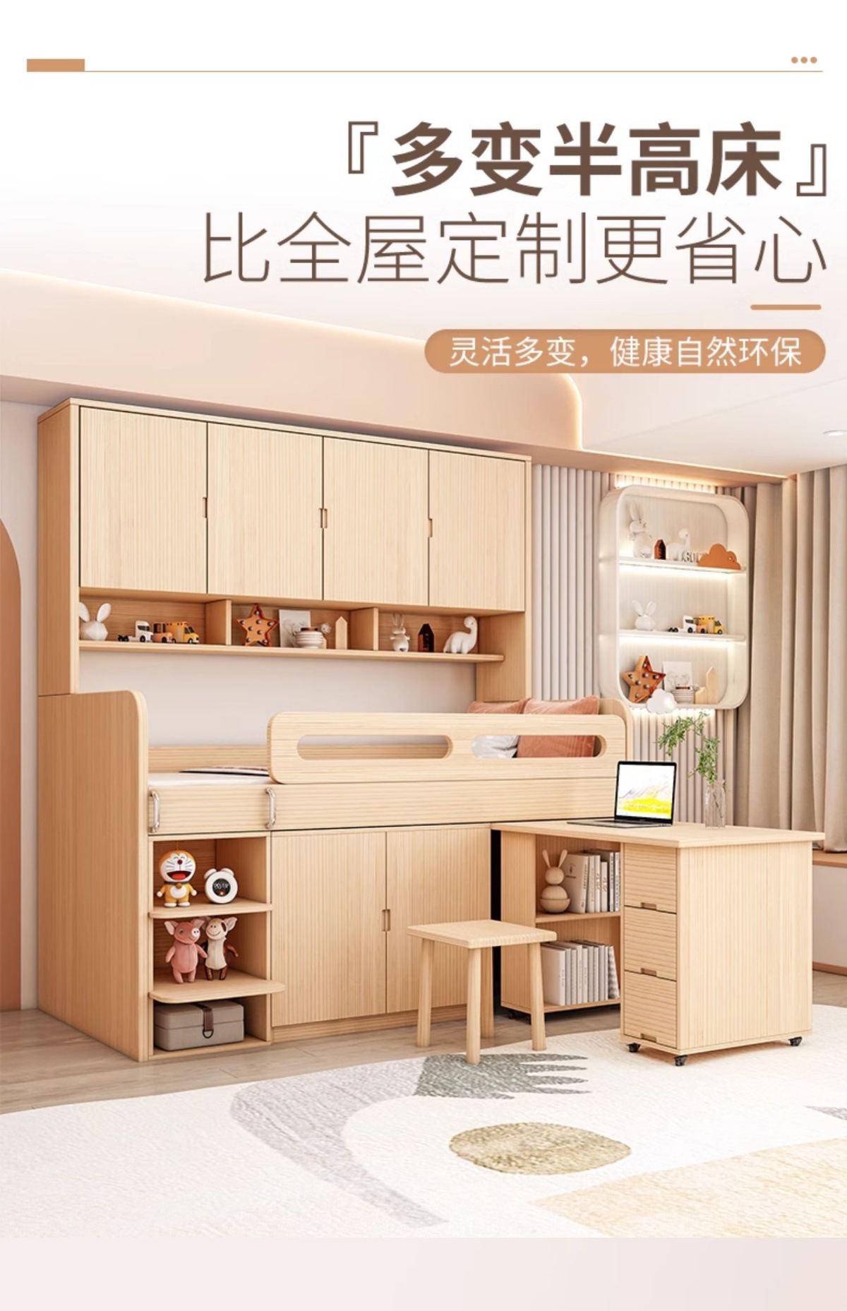 풀 솔리드 우드 반 높이 침대 간단한 작은 아파트 소년 및 소녀 어린이 침대 다기능 옷장 조합 원피스 높은 침대