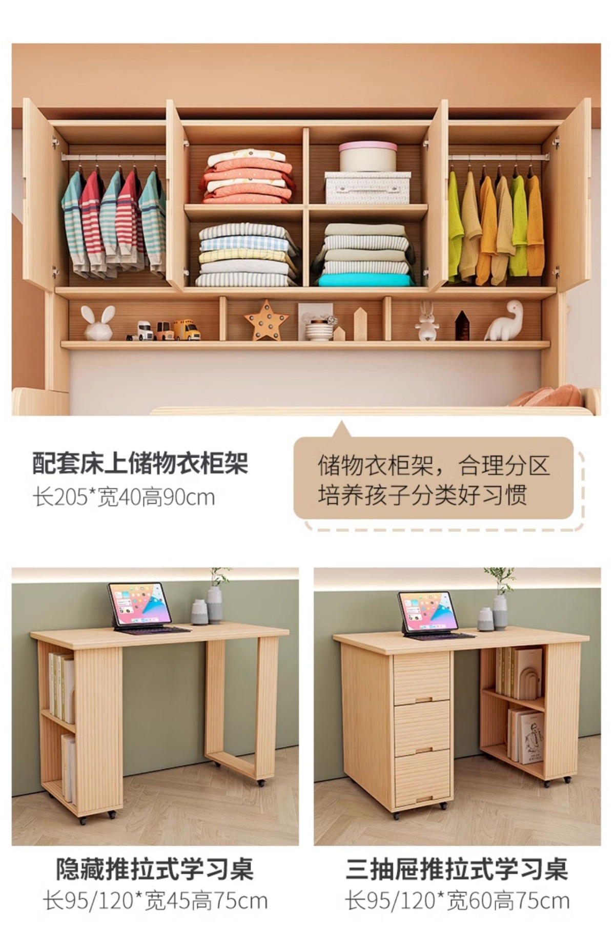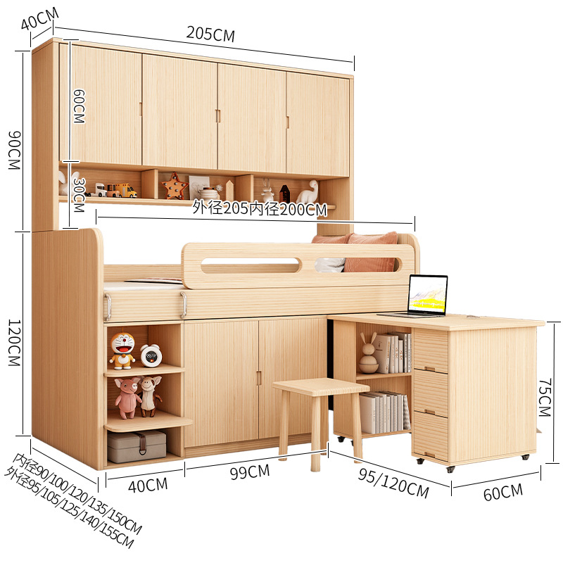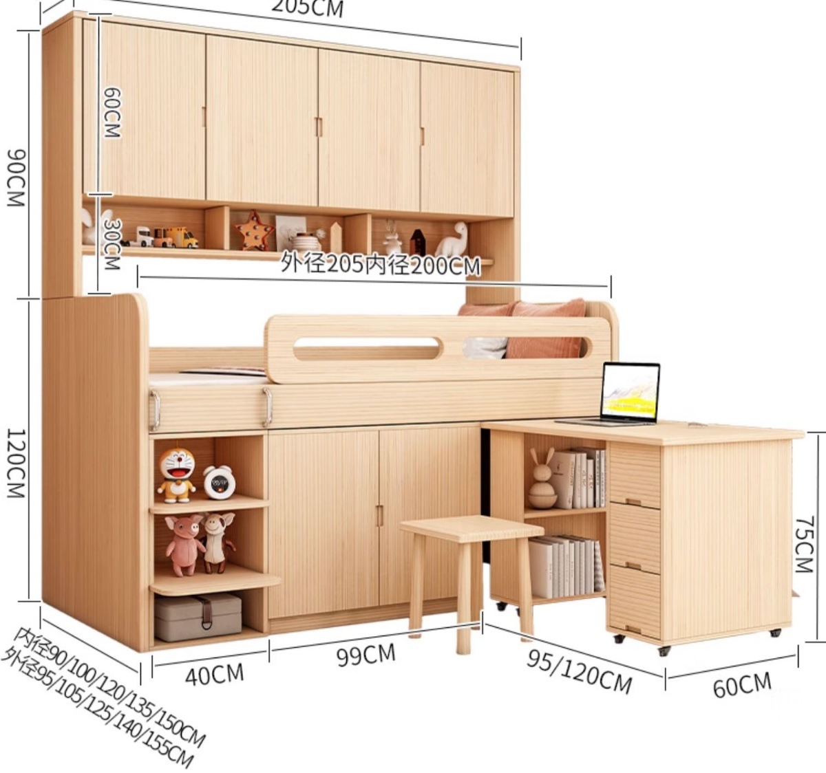 • 침대 + 사다리 캐비닛 + 상단 캐비닛 + 서랍 3개 캐비닛 + 옷장 + 서랍이 있는 책상