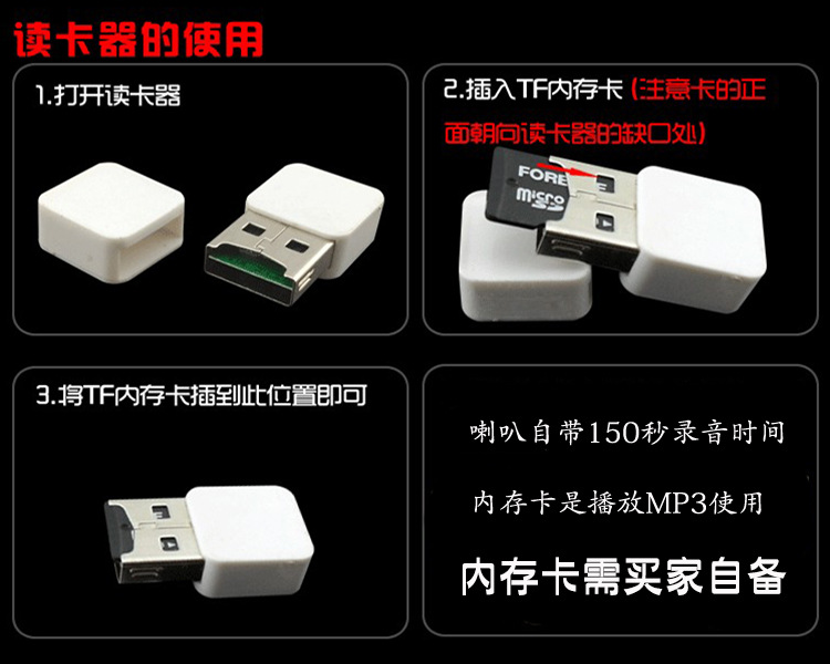 • 충전식 버전/플러그형 U 디스크 스피커 + 7400mWh 리튬 배터리 2개 + 크래들 충전기/6개