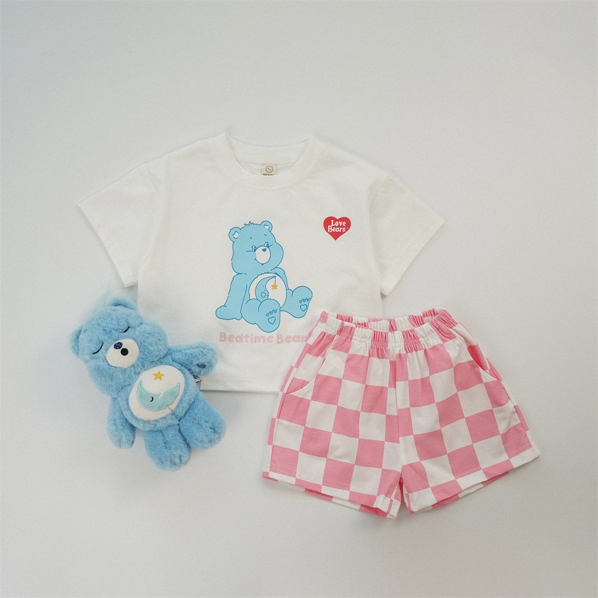 한국식 어린이 격자 무늬 세트 여름 순면 반팔 어린이 무지개 아기 곰 티셔츠 격자 무늬 반바지 세트스토어 가기
