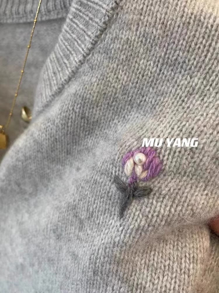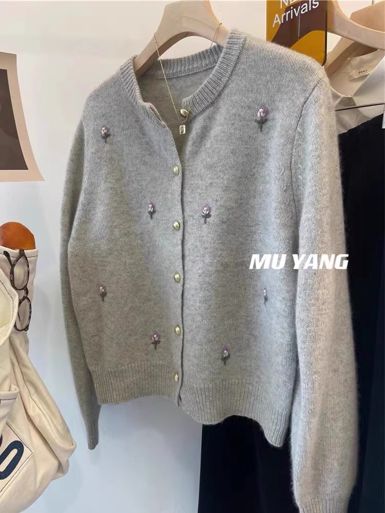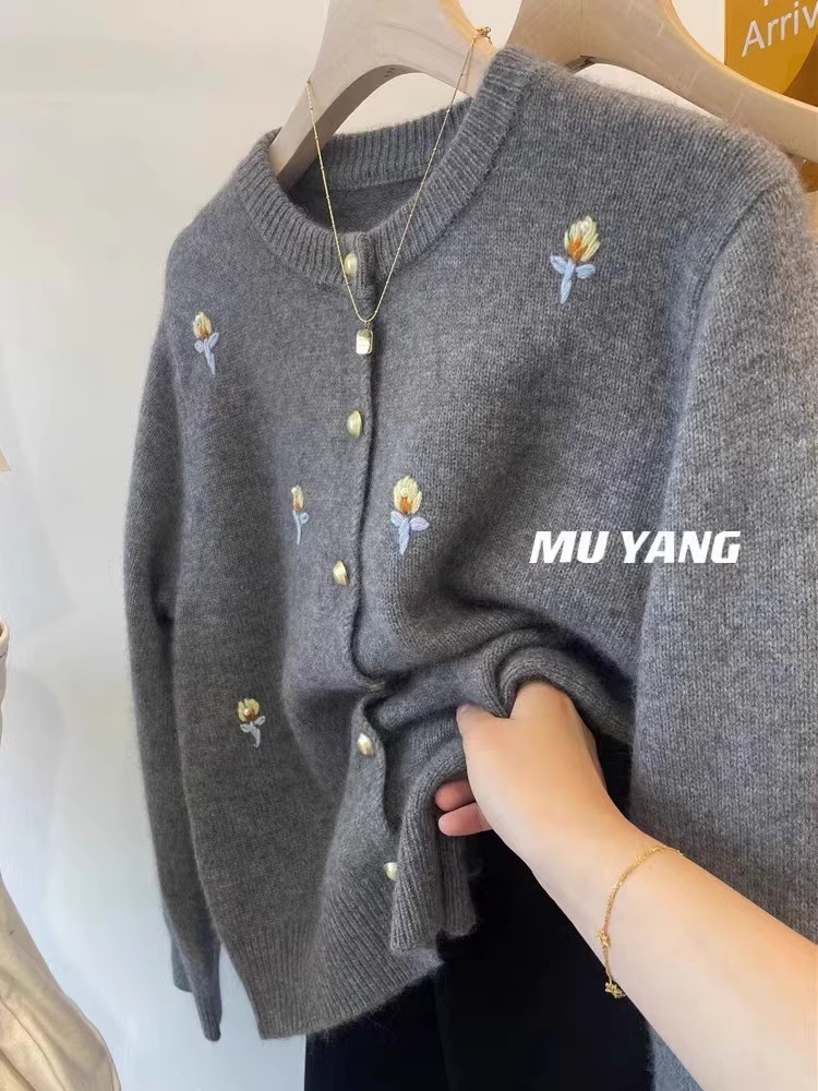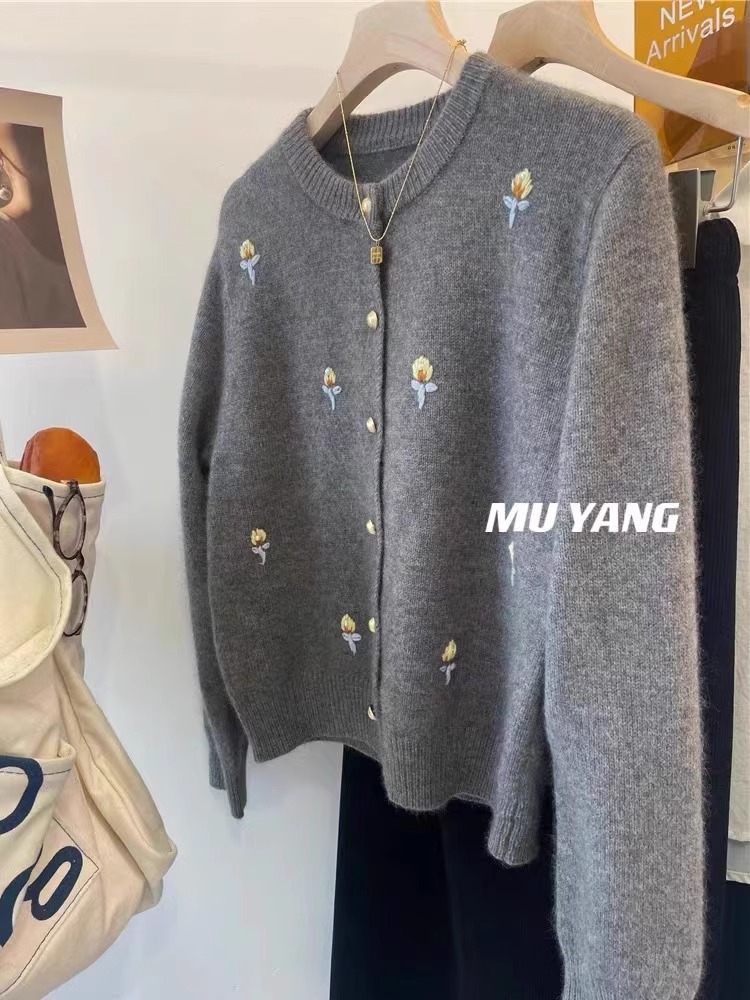 회색 프랑스 스웨터 카디건 여성의 2024 년 새로운 가을과 겨울 느슨한 둥근 목 나이를 줄이는 니트 코트 탑