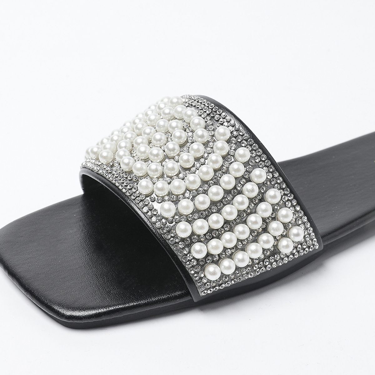 유럽과 미국의 대외 무역 플랫 플러스 사이즈 구슬 슬리퍼 여성 스퀘어 헤드 라인스톤 경량 비치 샌들 및 슬리퍼