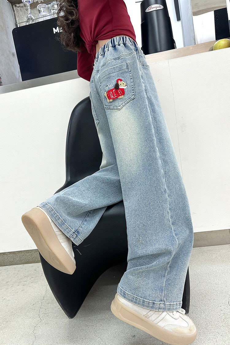 소녀 청바지 봄과 가을 그물 인기있는 외국 스타일 2025 새로운 어린이 스트레이트 다리 넓은 다리 바지 느슨한 여자 올 매치 바지