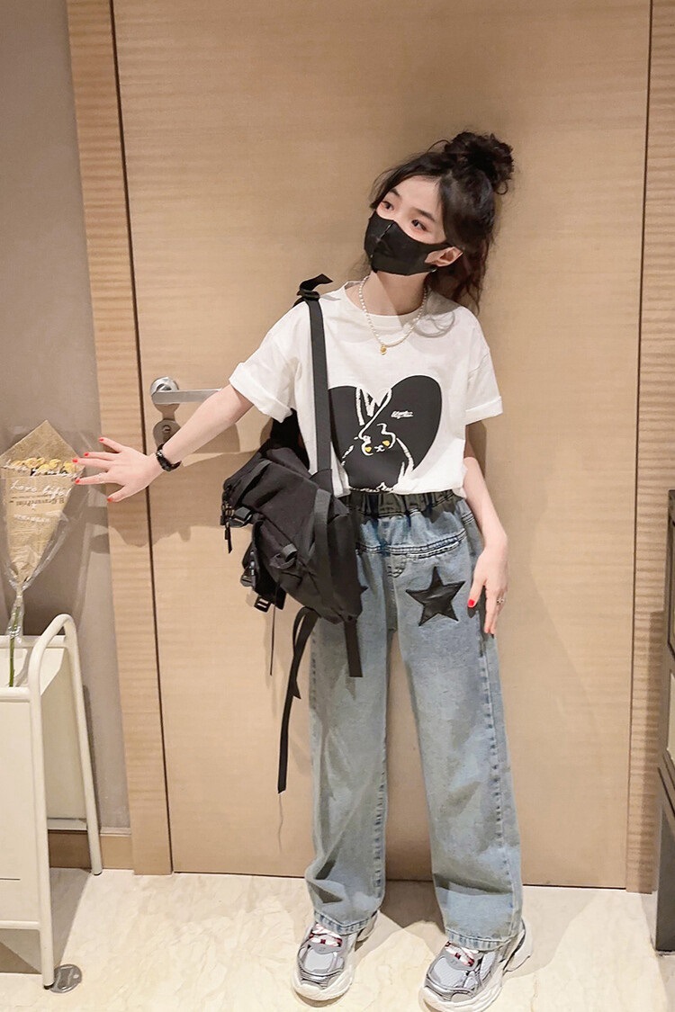 여자 여름 2025 새로운 한국 스타일 여름 큰 어린이 서양식 인터넷 인기있는 어린이 짧은 소매 청바지스토어 가기