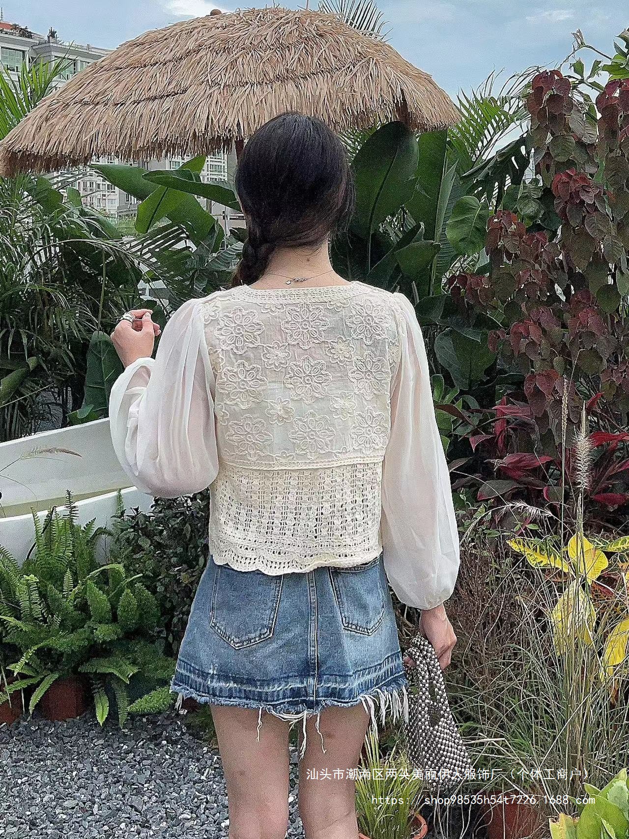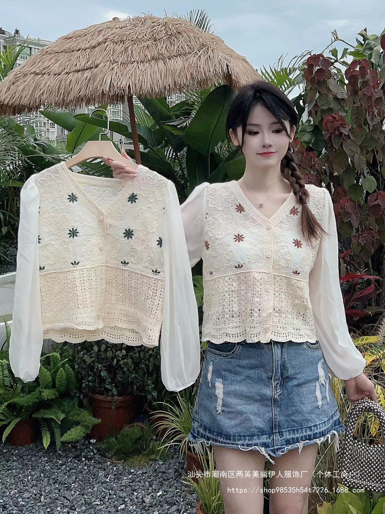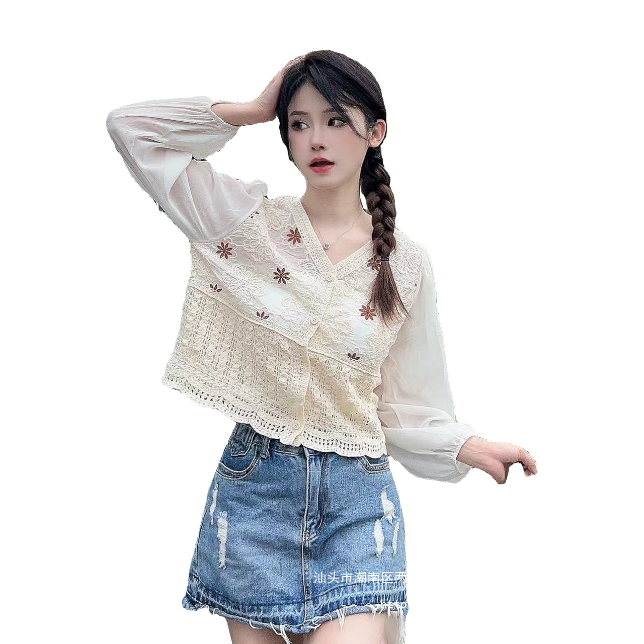 코튼 원사 빈 아웃 스티칭 얇은 V-넥 쉬폰 셔츠 긴 소매 여름 레이스 셔츠 니트 스위트 랜턴 슬리브 탑