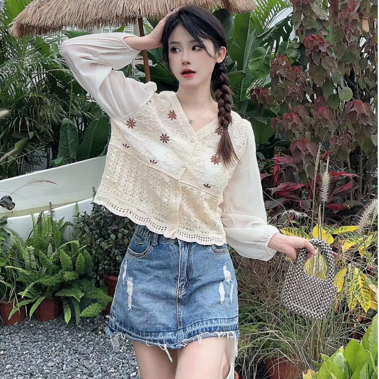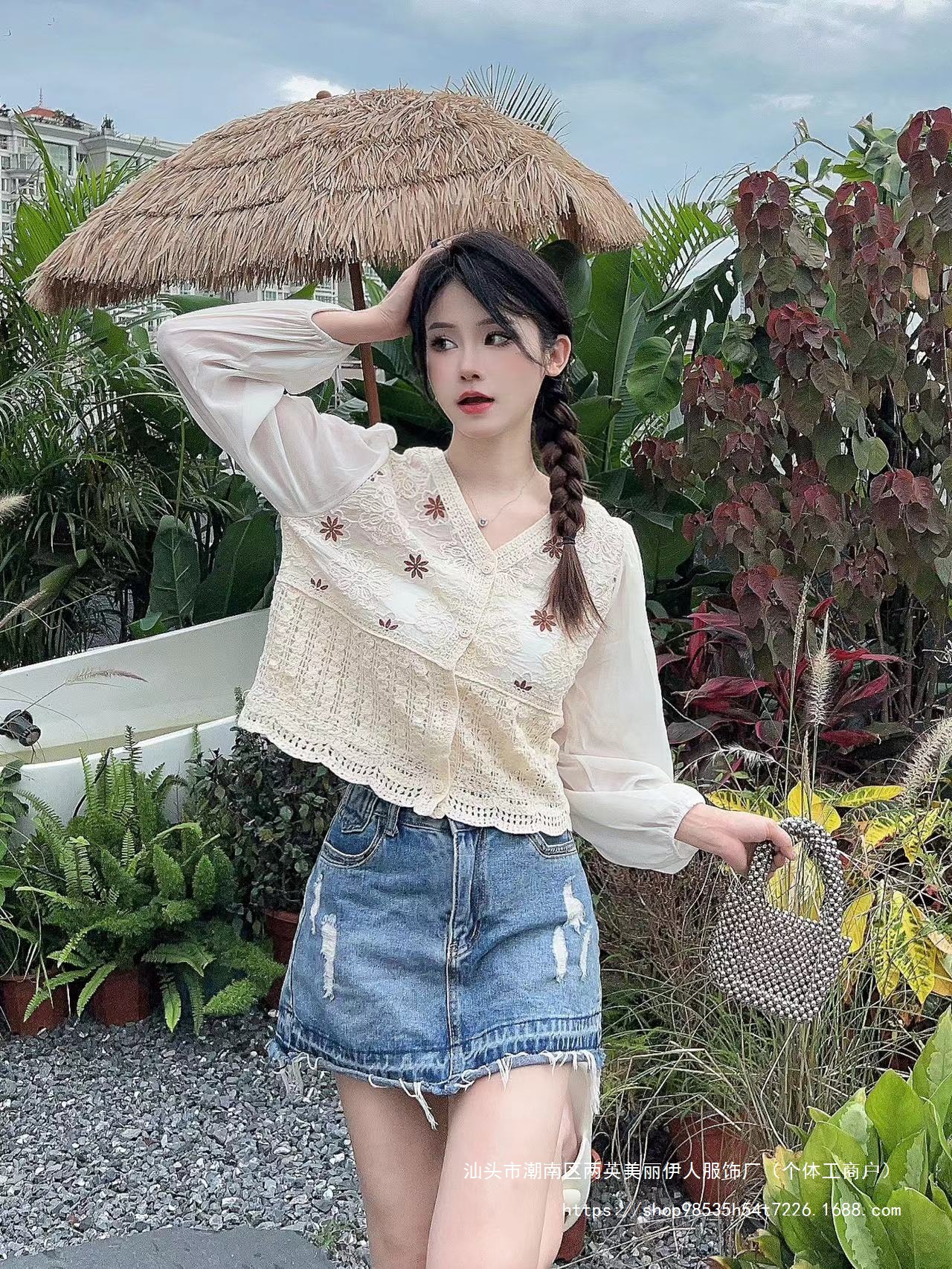 코튼 원사 빈 아웃 스티칭 얇은 V-넥 쉬폰 셔츠 긴 소매 여름 레이스 셔츠 니트 스위트 랜턴 슬리브 탑스토어 가기