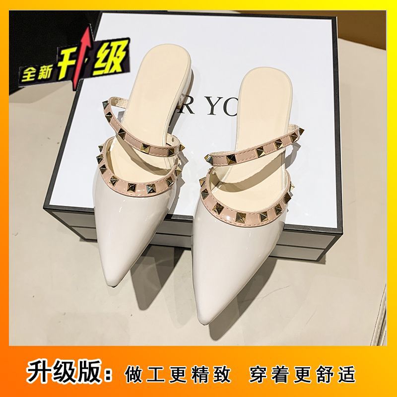 2024 년 가을과 겨울 새로운 폭발 디자인 센스 틈새 영국 스타일 리벳 로우 힐 싱글 신발 두꺼운 힐 외부 착용 반 슬리퍼