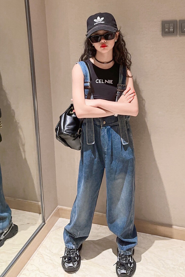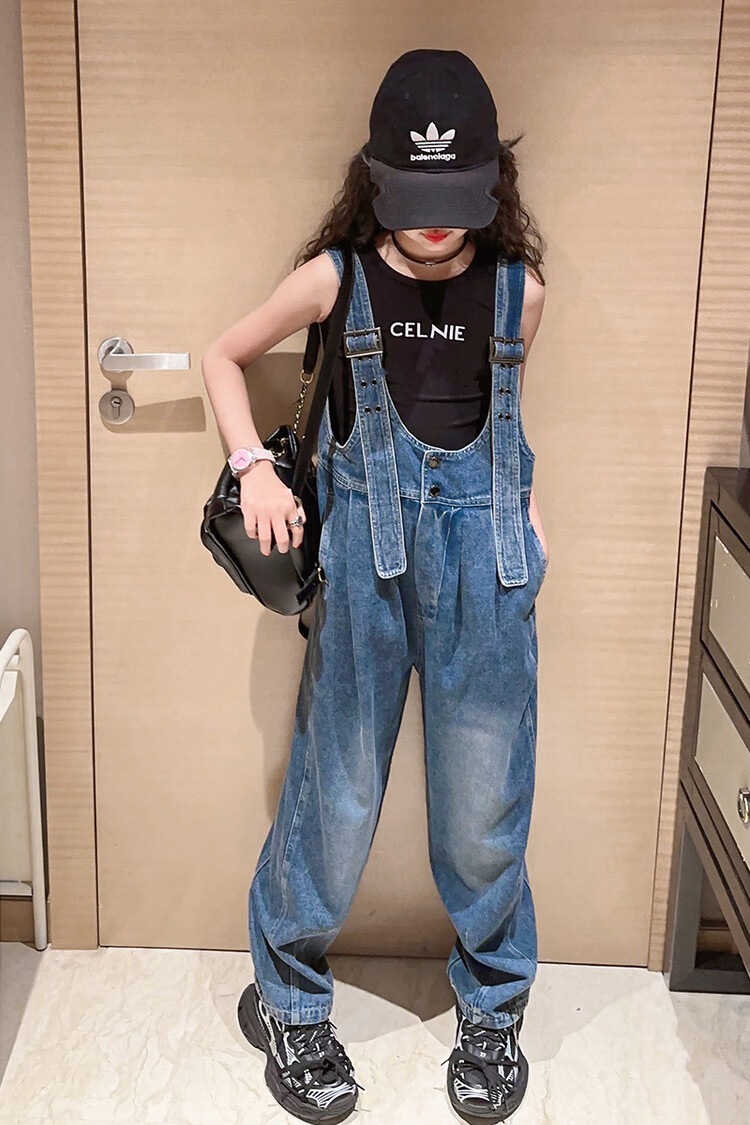 소녀의 봄과 가을 스트랩 바지 소녀 큰 어린이 캐주얼 와이드 레그 스트레이트 데님 가을 서양식스토어 가기