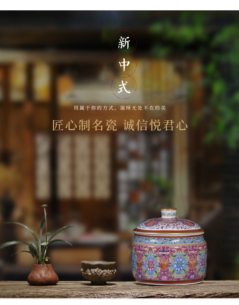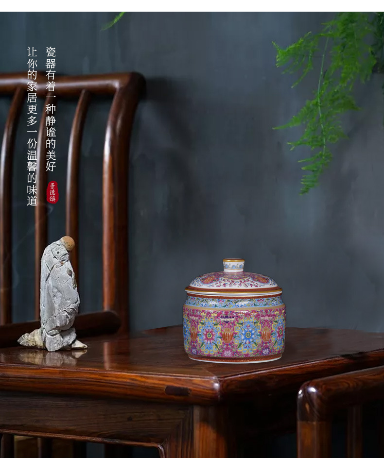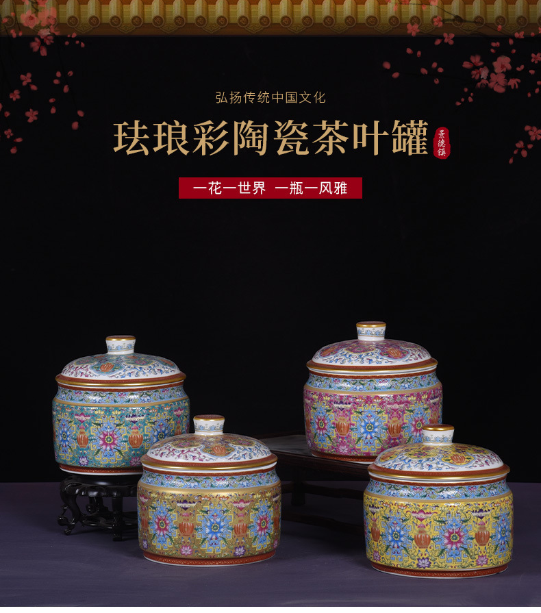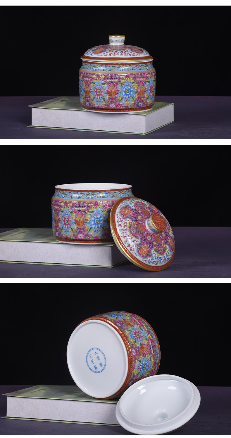 Jingdezhen 모조 청나라 에나멜 컬러 Fushou 패턴 티 케이크 커버 캔 가정용 Pu'er 차 세라믹 밀봉 캔 도매스토어 가기
