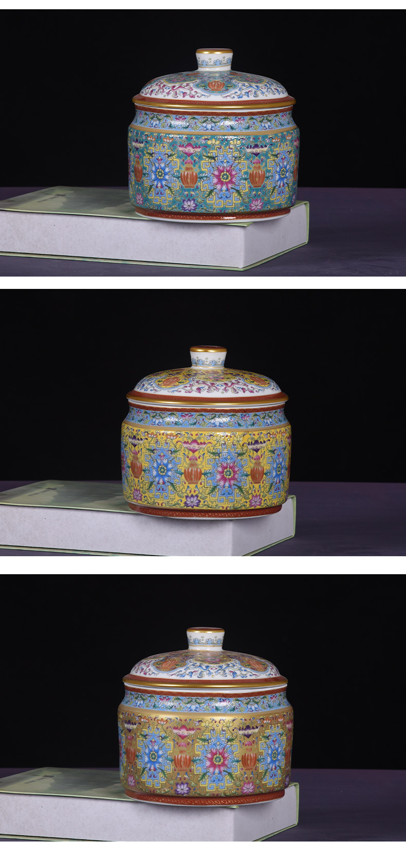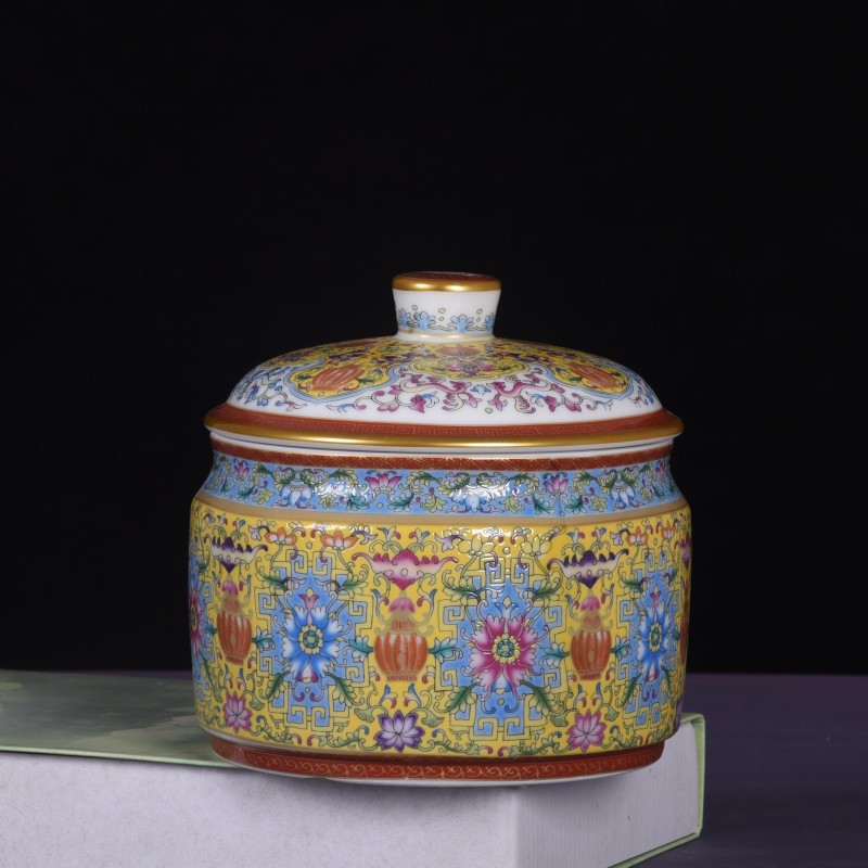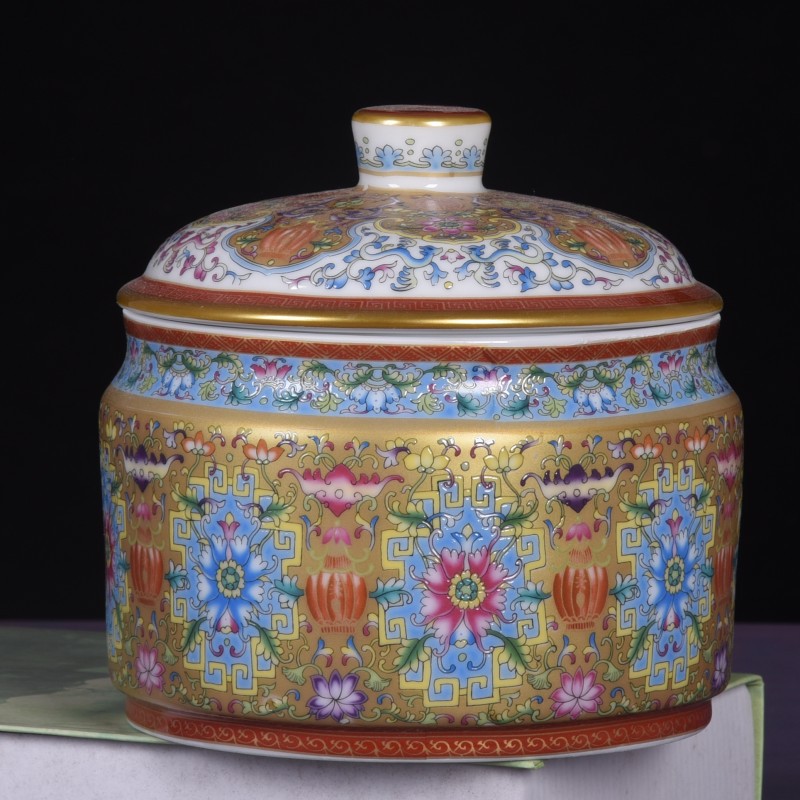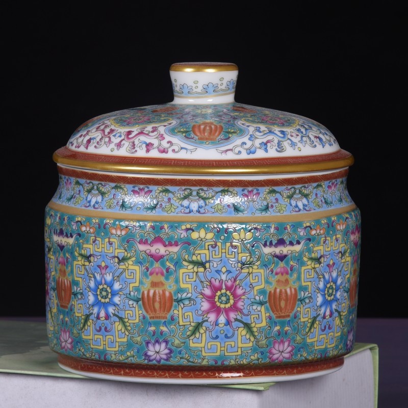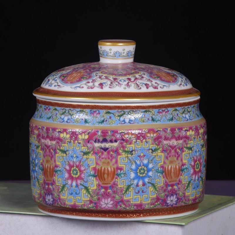 Jingdezhen 모조 청나라 에나멜 컬러 Fushou 패턴 티 케이크 커버 캔 가정용 Pu'er 차 세라믹 밀봉 캔 도매스토어 가기