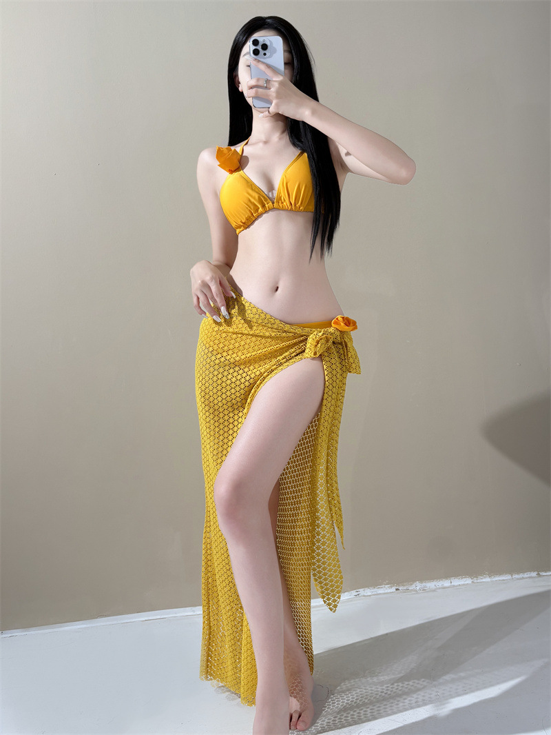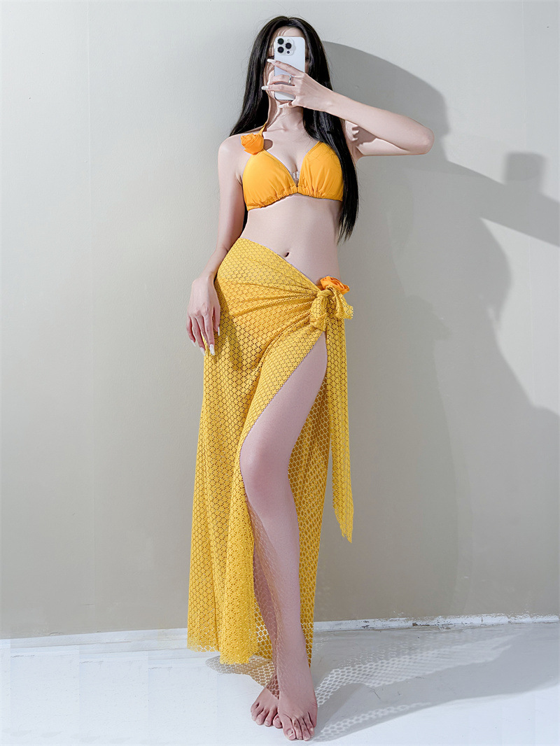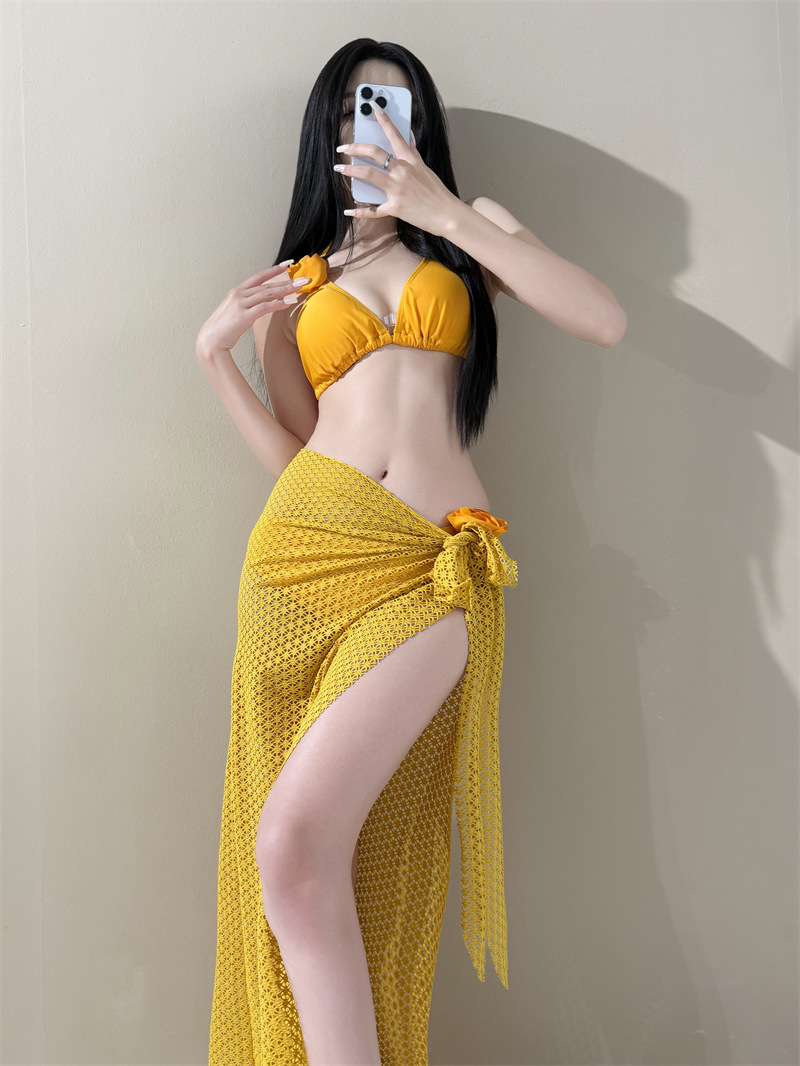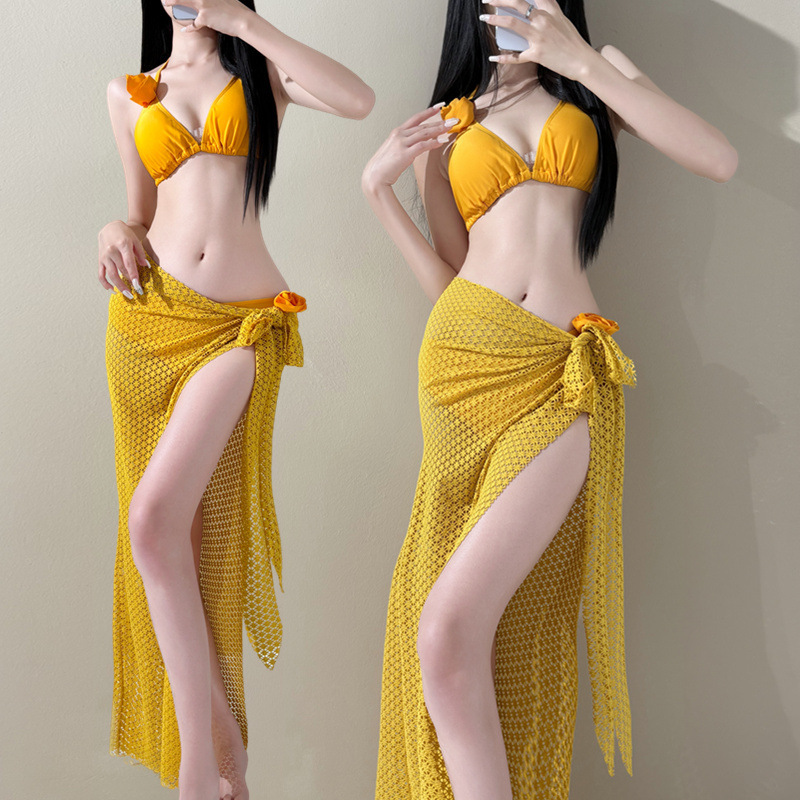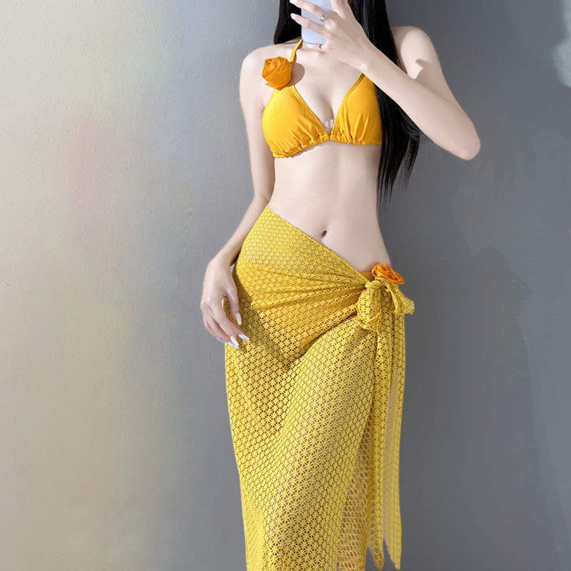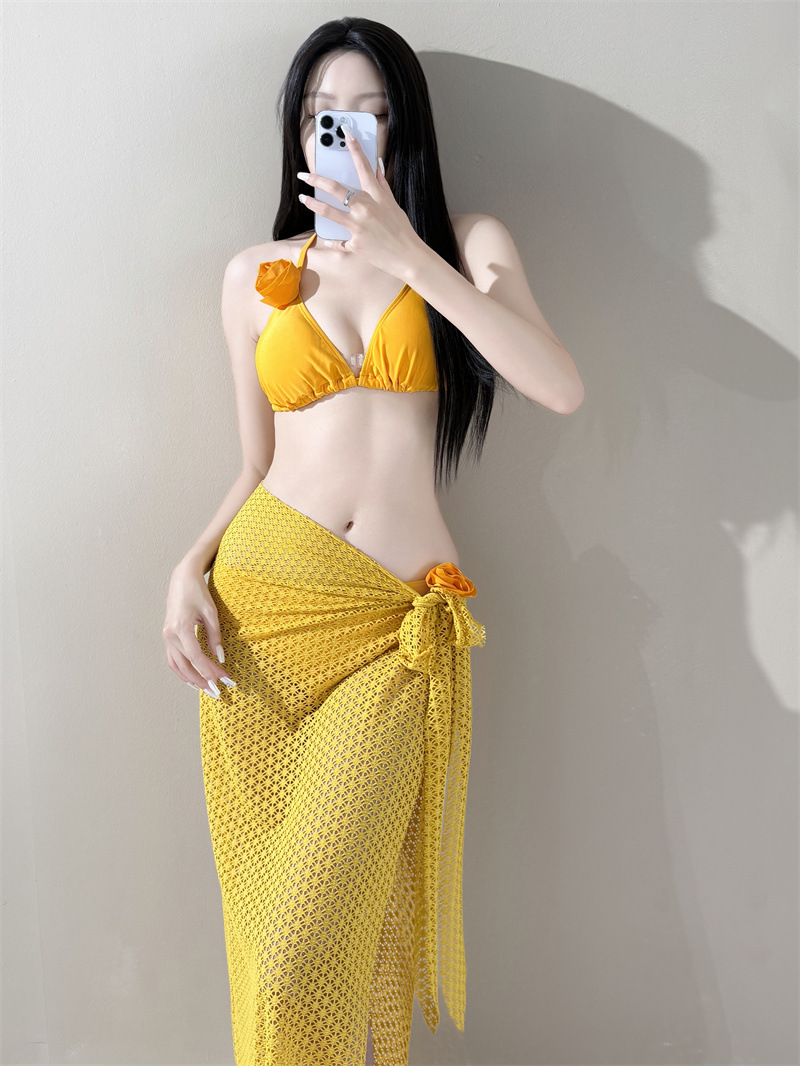 태국 새로운 생강 노란색 틈새 분할 꽃 비키니 섬 휴가 슬리밍 온천 3 피스 수영복 여성
