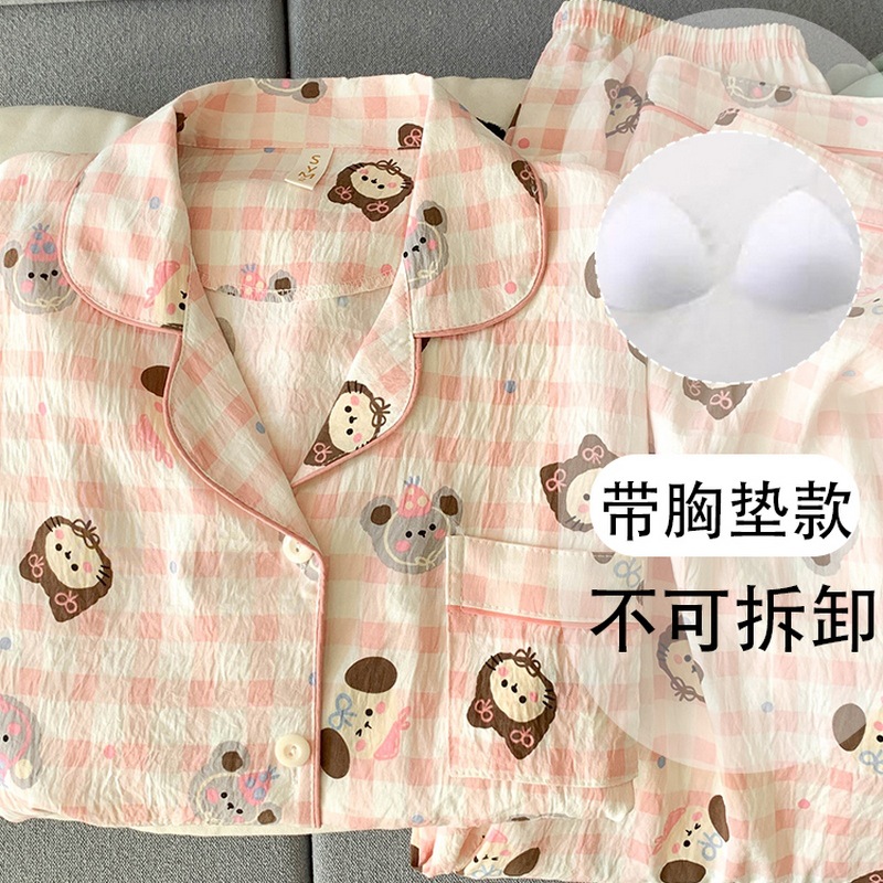 • (가슴패드 없음) [Yunduo Cotton] 빈핑크 체크무늬 (긴팔+긴바지)