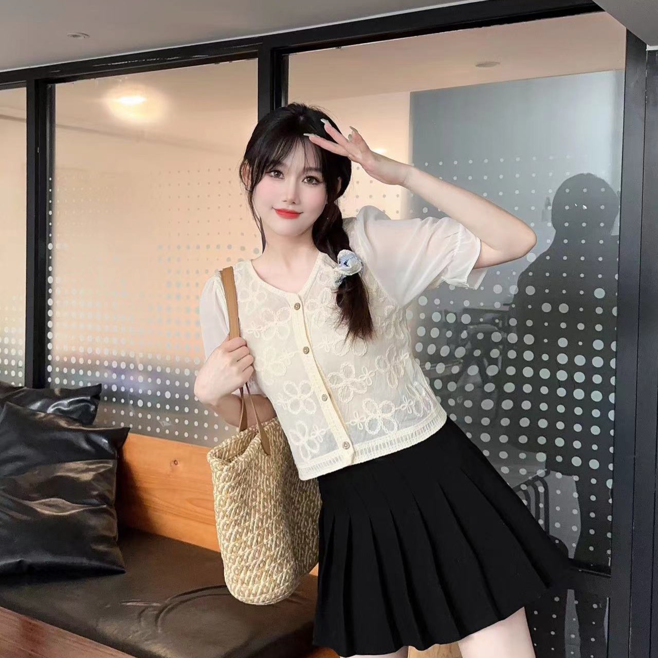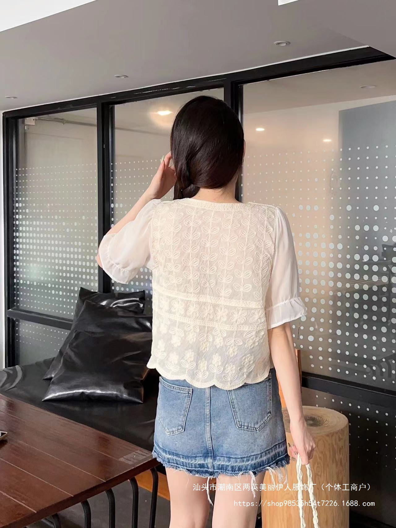 새로운 여름 패션 칼라 반팔 쉬폰 셔츠 여성용 타이트한 허리 세련된 연령 감소 세련된 레이스 작은 셔츠 툴 디자인스토어 가기