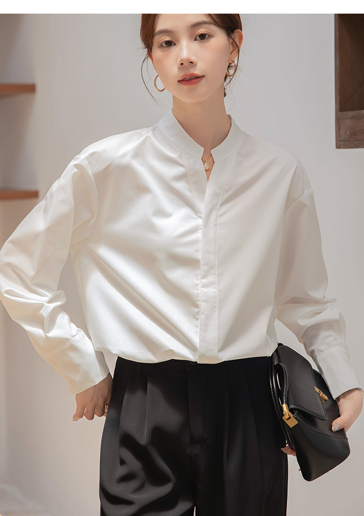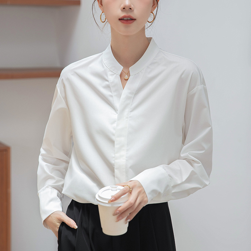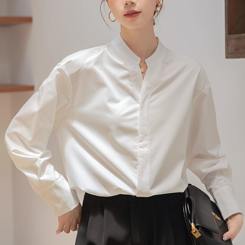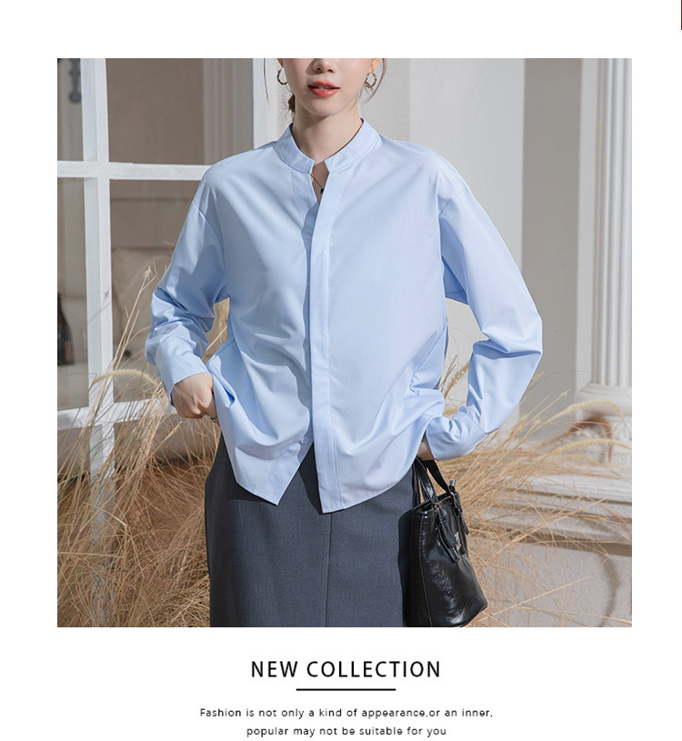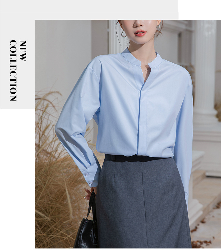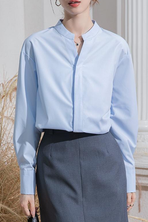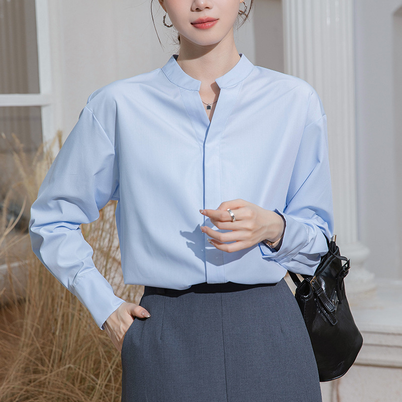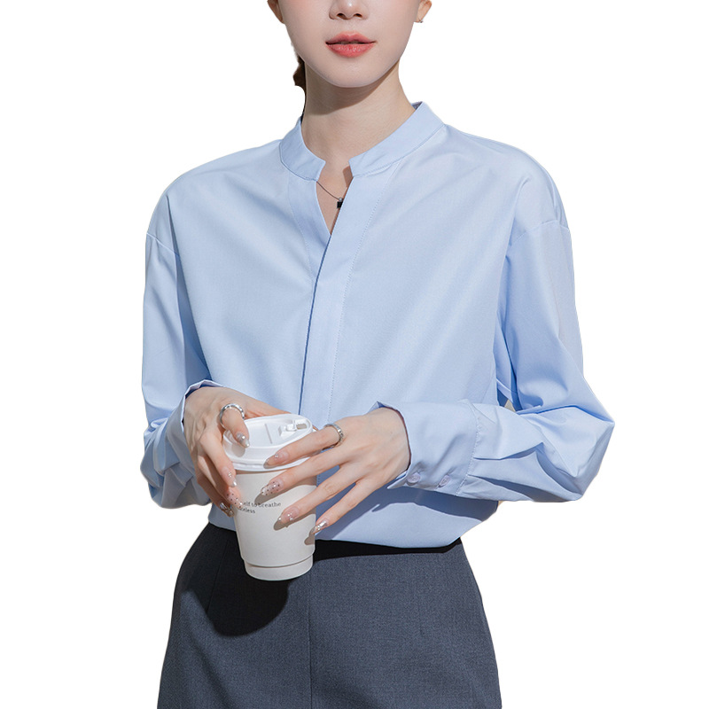 실제 촬영 새로운 2025 봄 파란색 셔츠 기질 직장 지적 작은 V 넥 긴 소매 소녀 셔츠