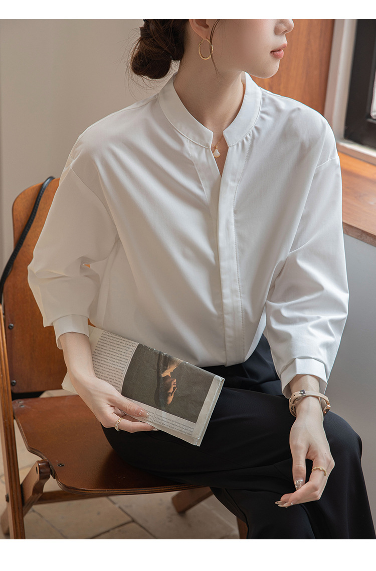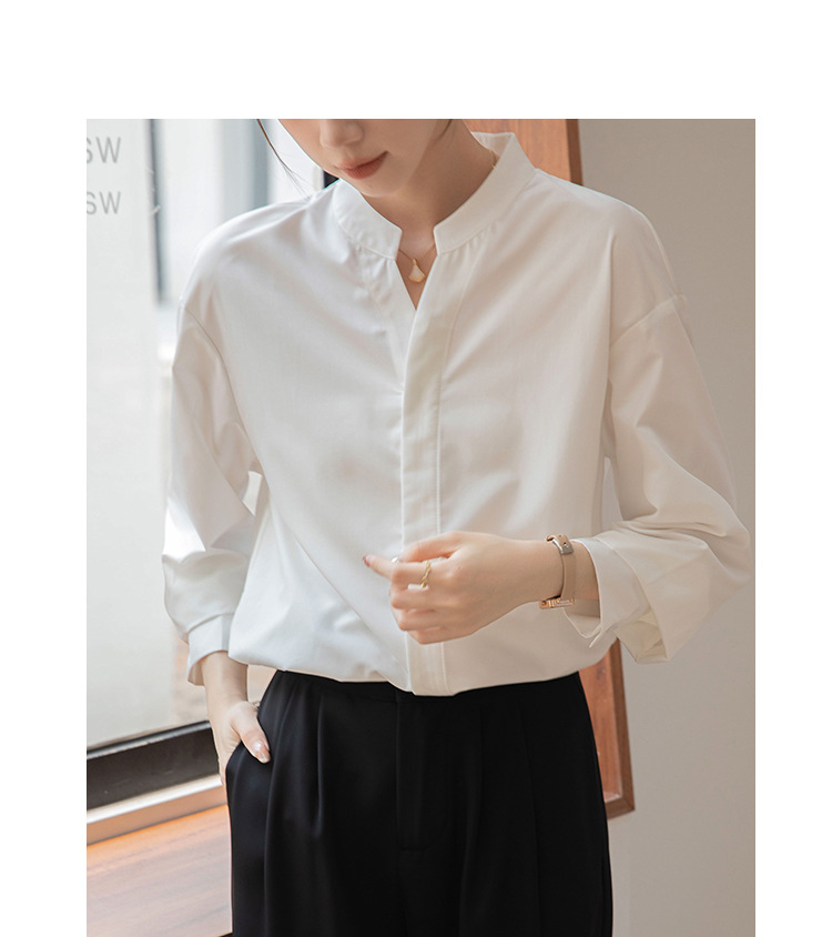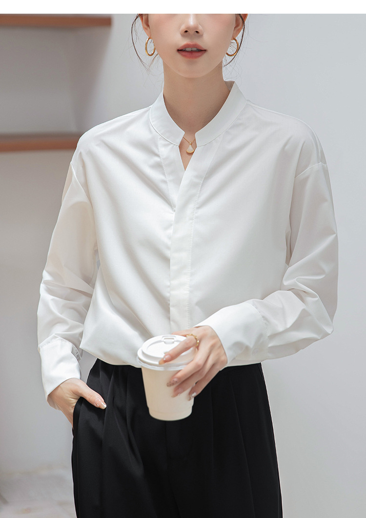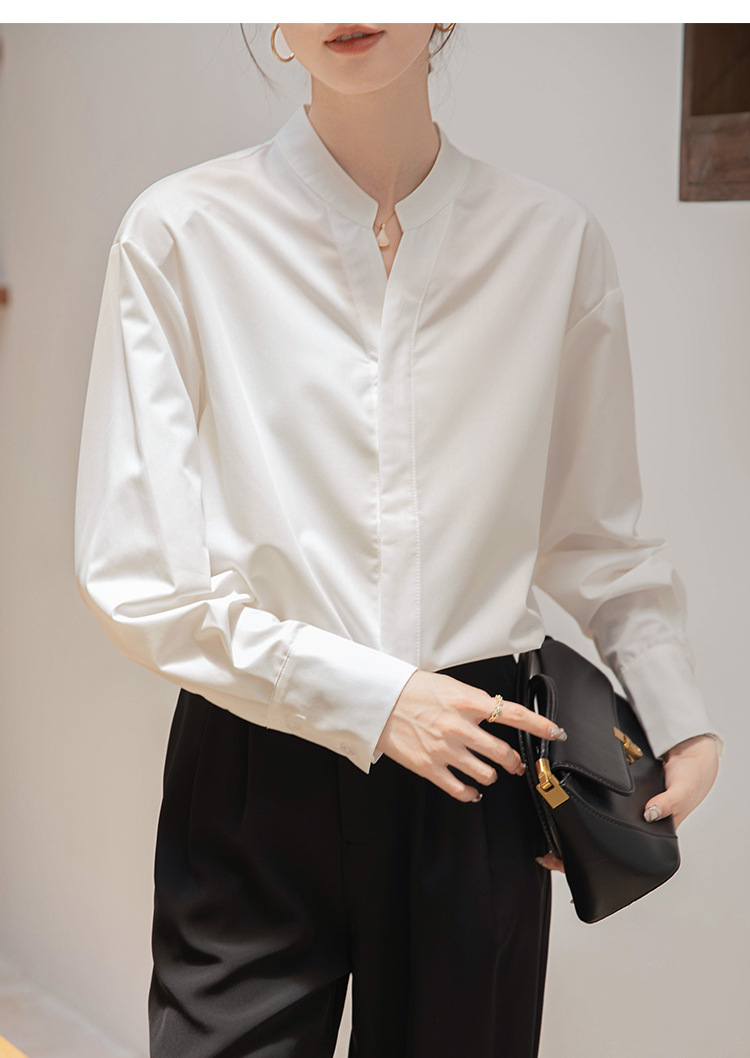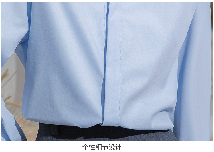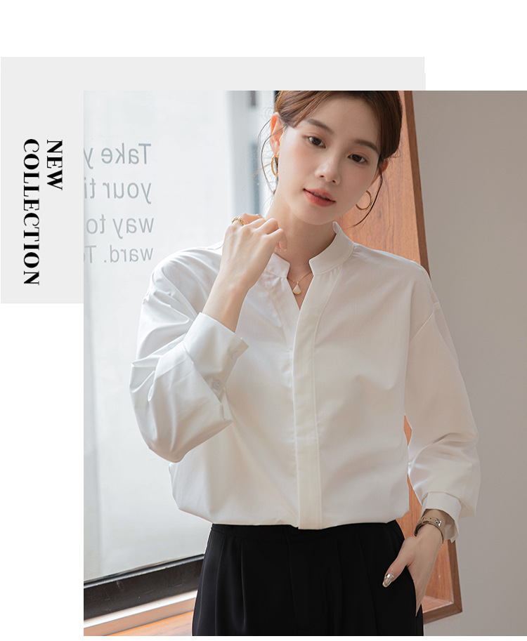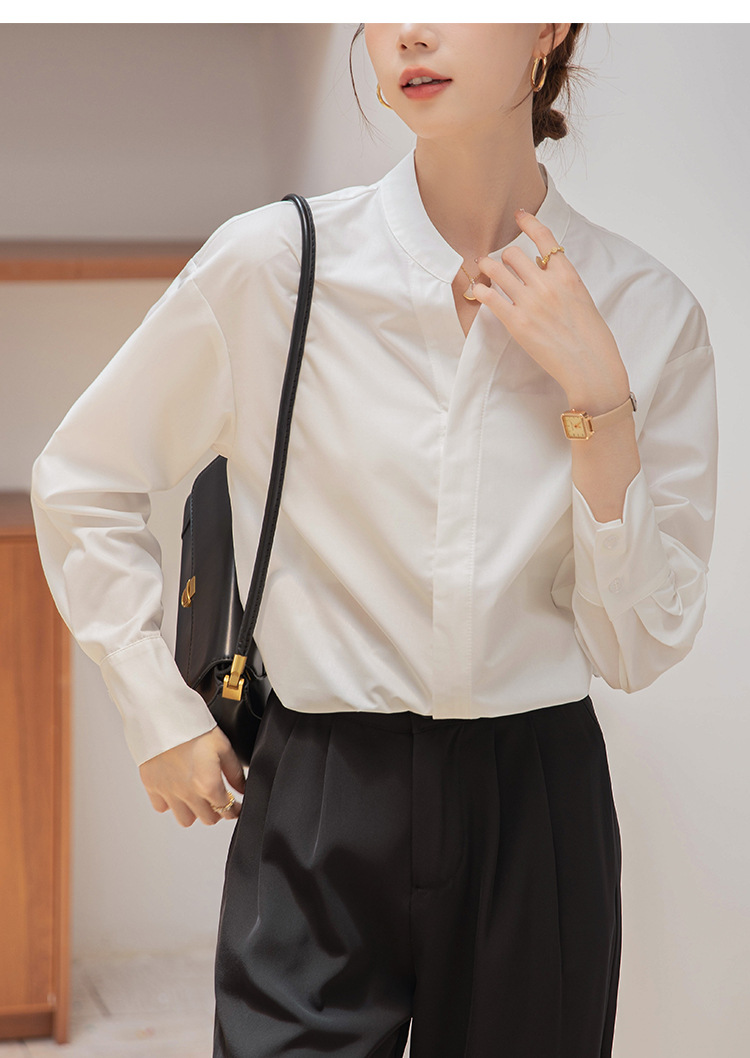 실제 촬영 새로운 2025 봄 파란색 셔츠 기질 직장 지적 작은 V 넥 긴 소매 소녀 셔츠