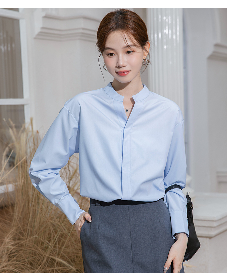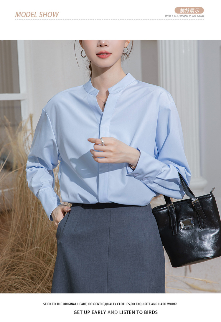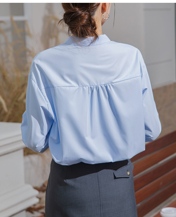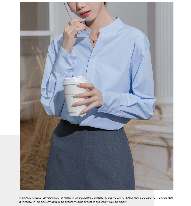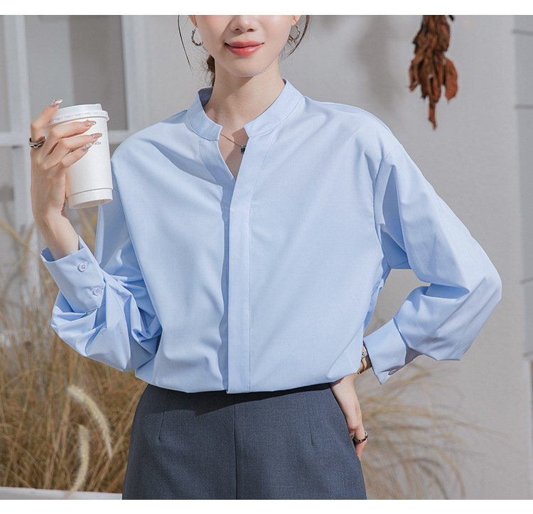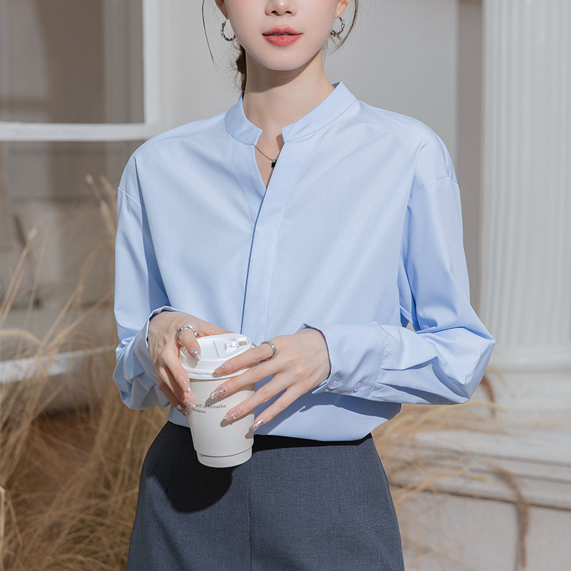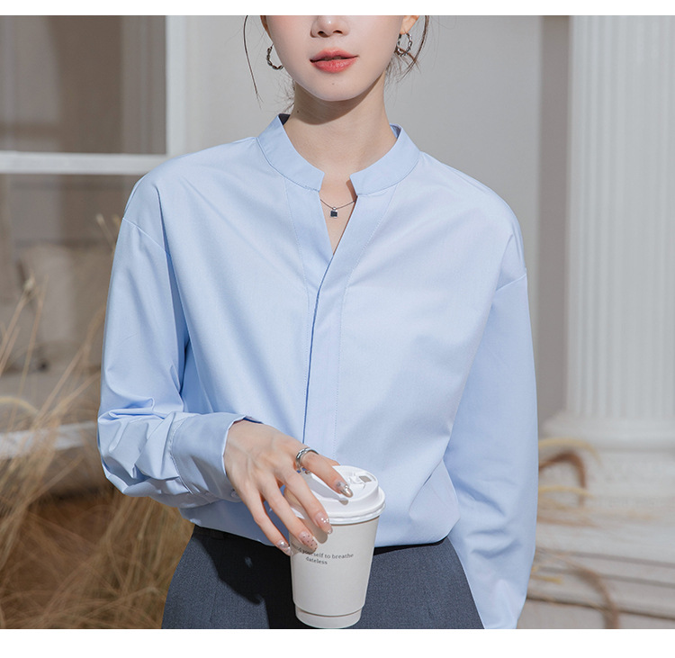 실제 촬영 새로운 2025 봄 파란색 셔츠 기질 직장 지적 작은 V 넥 긴 소매 소녀 셔츠스토어 가기