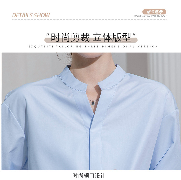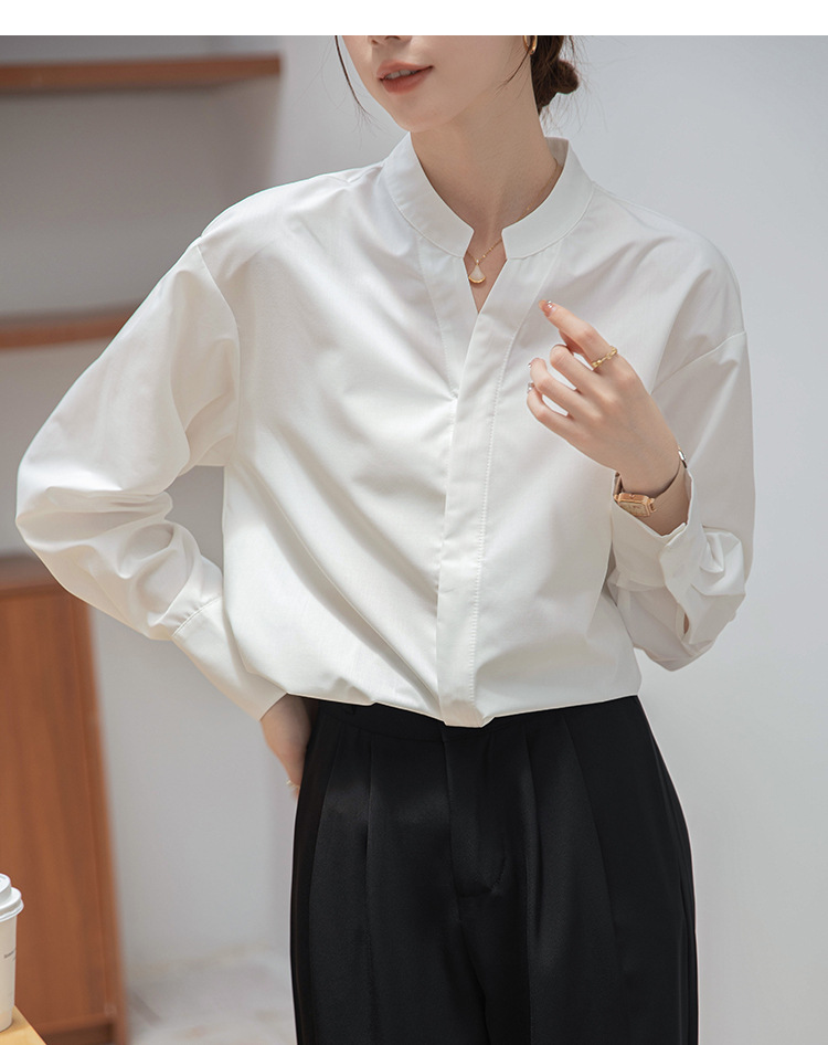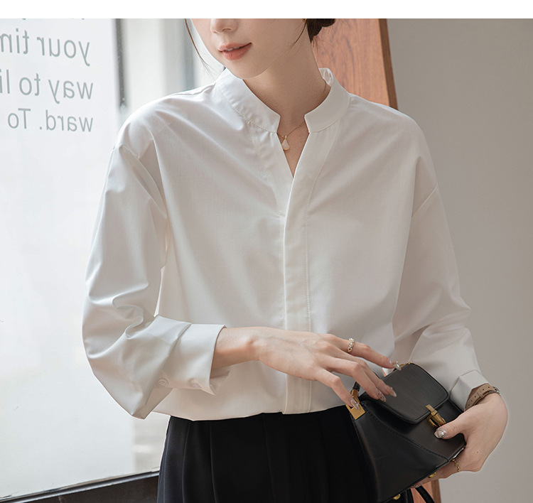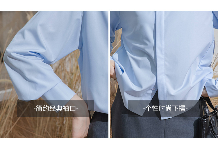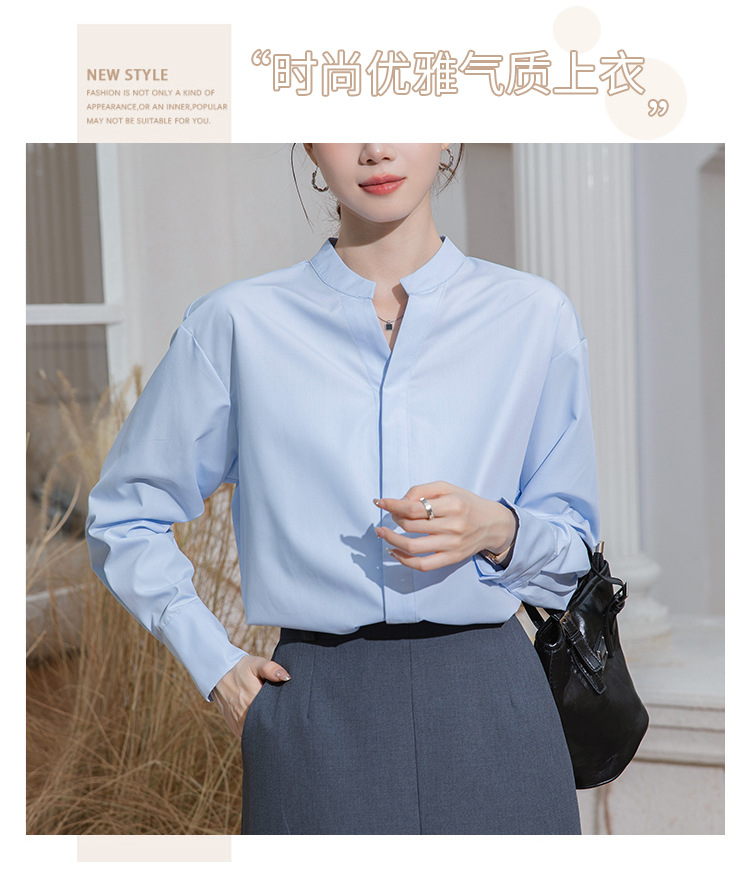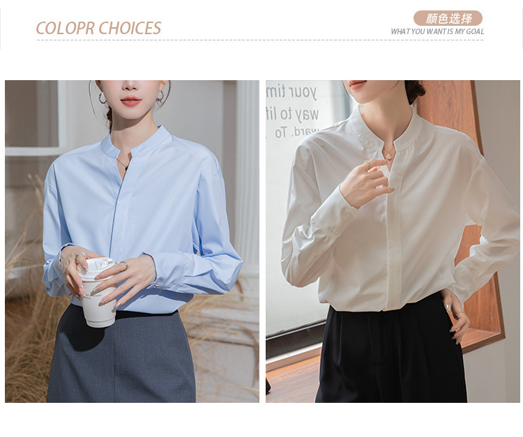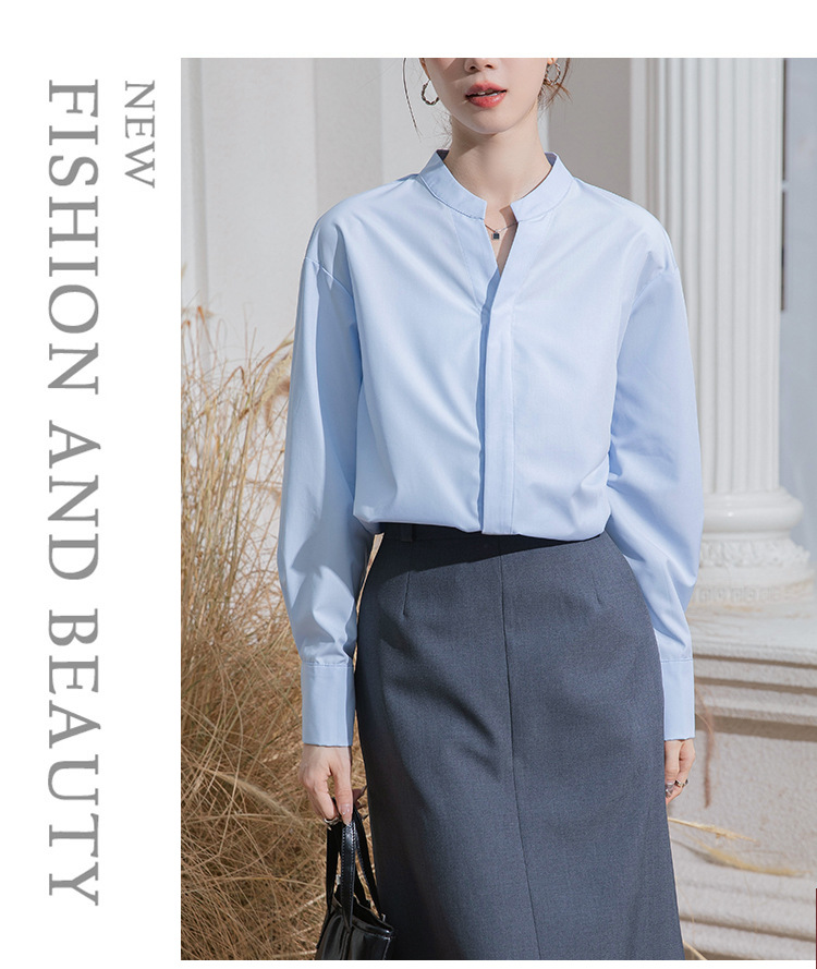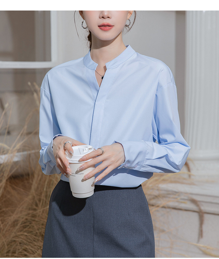 실제 촬영 새로운 2025 봄 파란색 셔츠 기질 직장 지적 작은 V 넥 긴 소매 소녀 셔츠스토어 가기