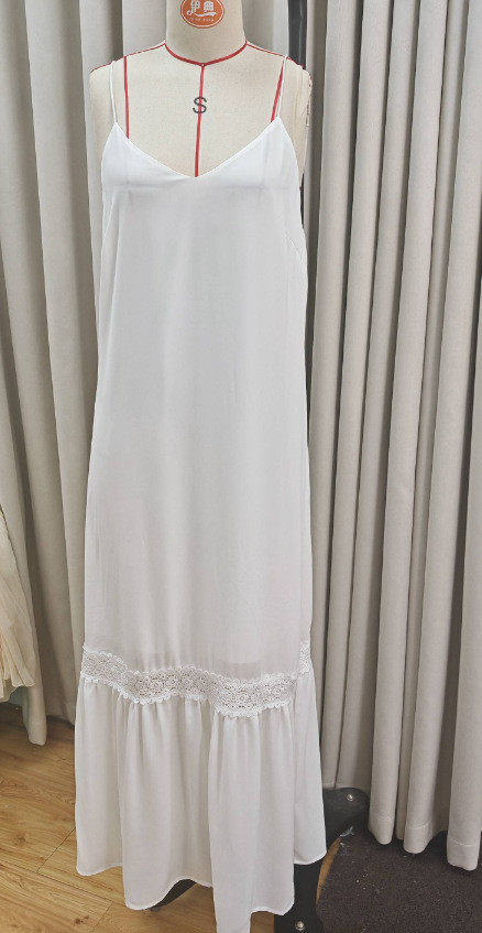 단색 V 넥 스트랩 레이스 바느질 긴 원피스 국경 패션 섹시한 화이트 백리스 휴일 원피스스토어 가기
