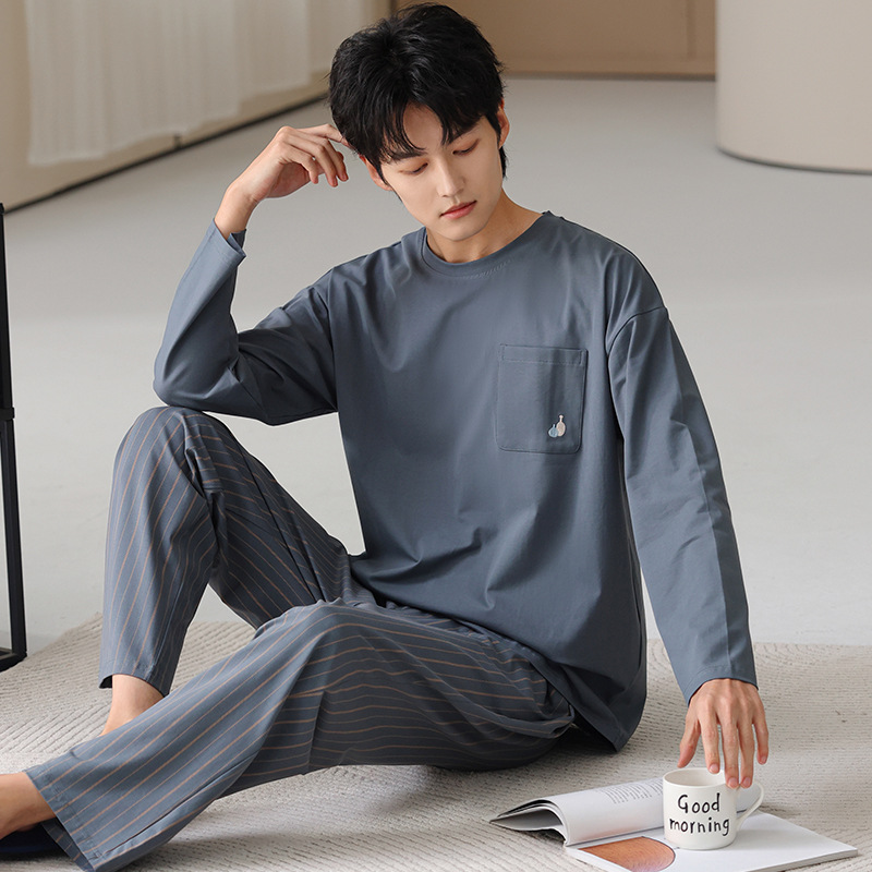 잠옷 남자의 봄과 가을 순면 긴 소매 옷 남자의 가을 얇은 캐주얼 줄무늬 플러스 사이즈 홈 옷스토어 가기