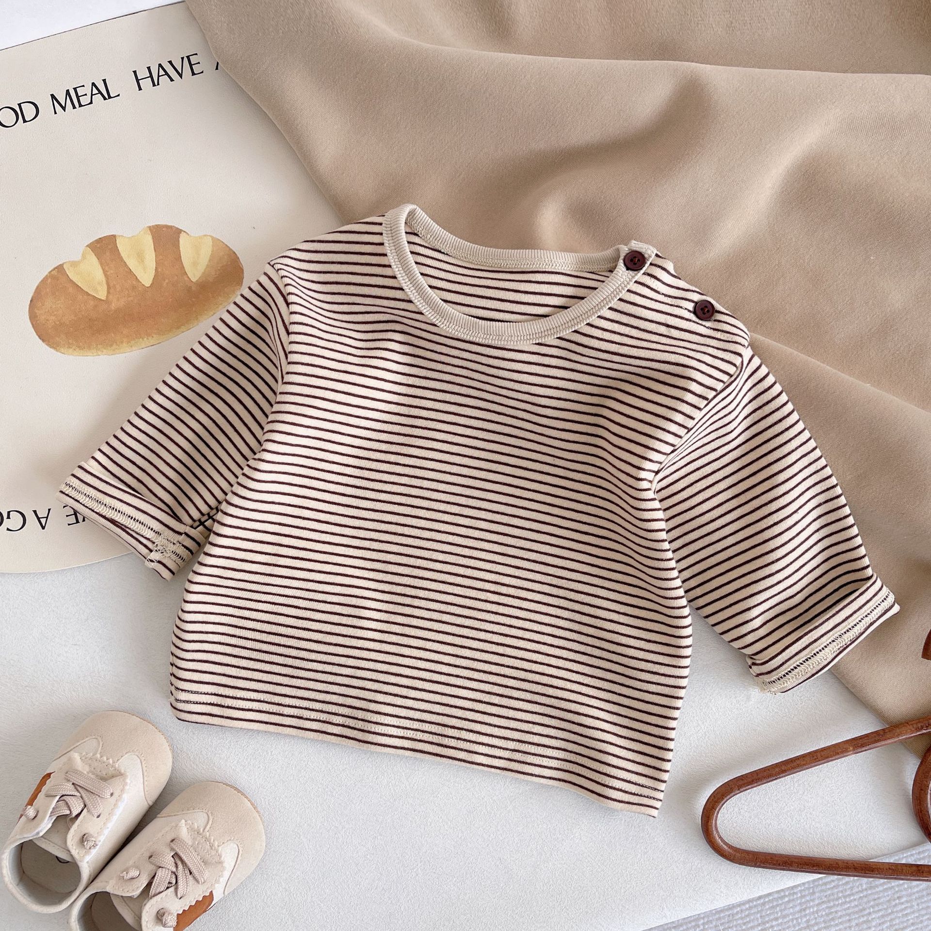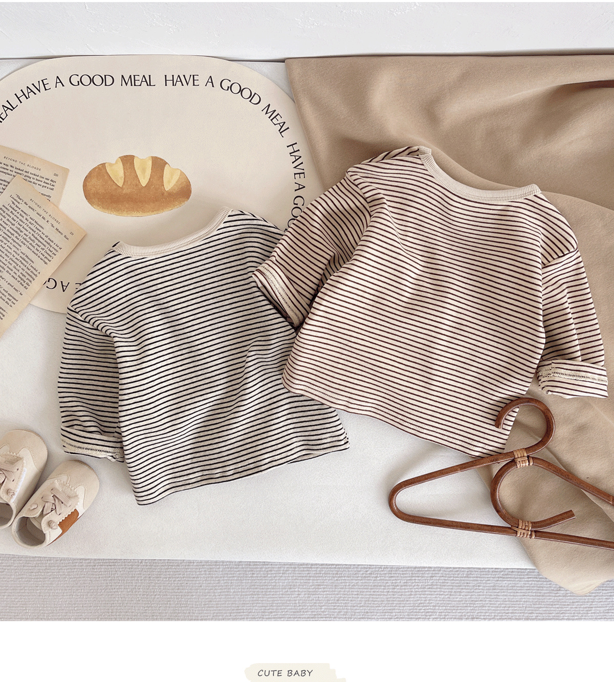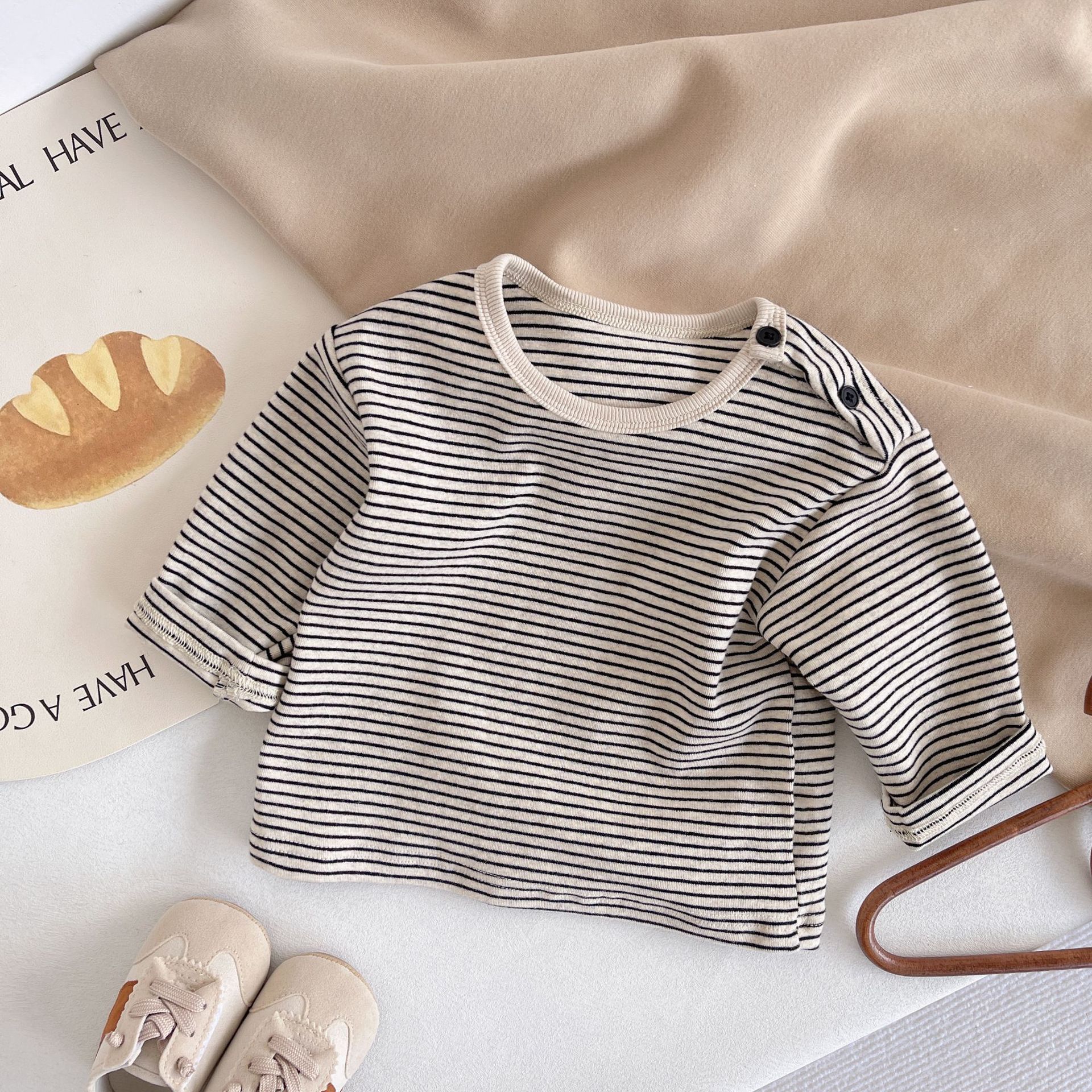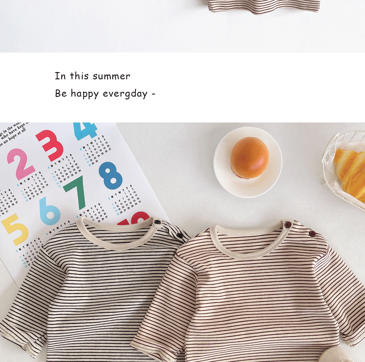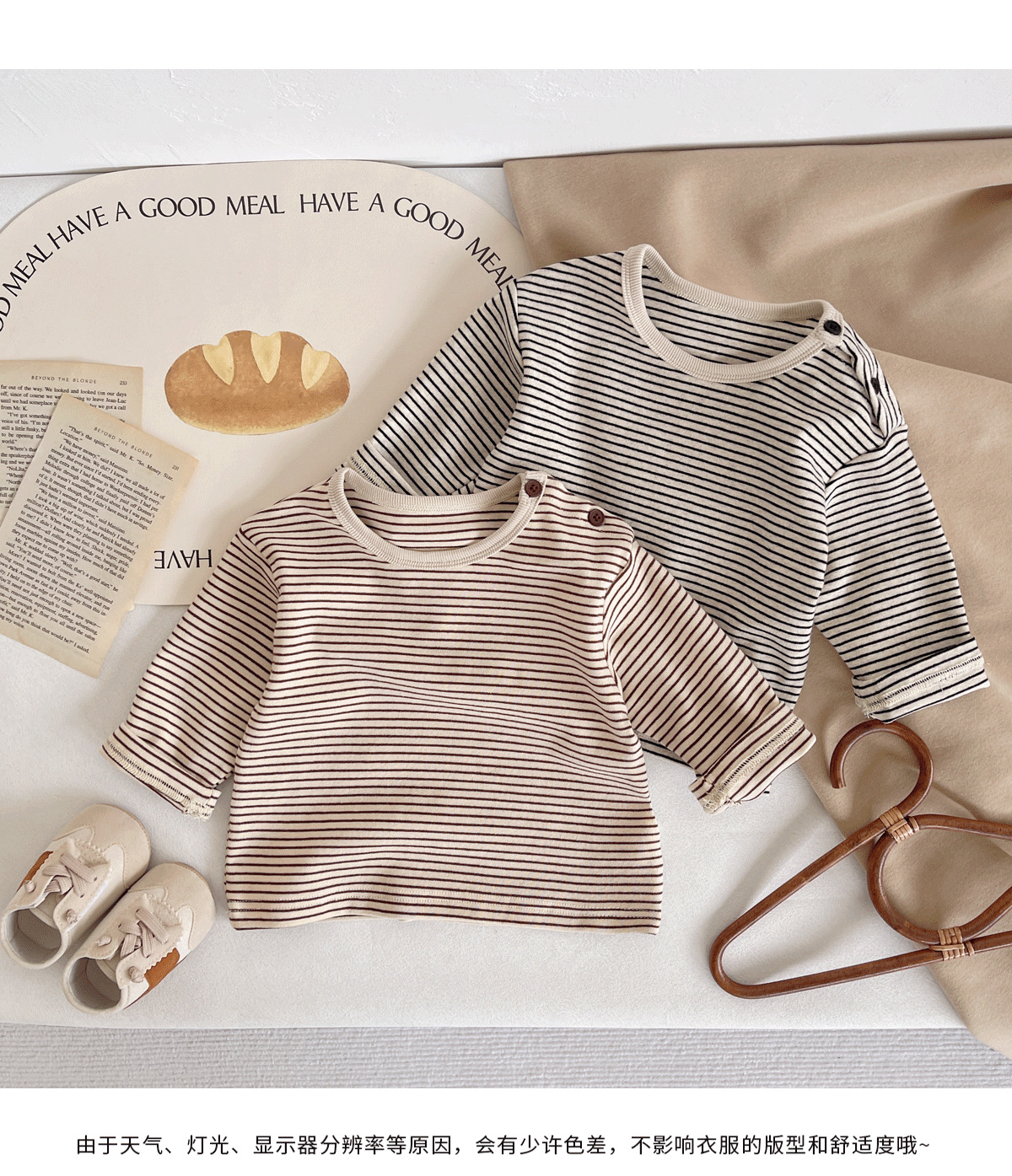 아동복 가을 새 소년과 소녀 줄무늬 긴팔 탑 아기 어깨 버클 티셔츠베이스 셔츠와 간단한 한국식 셔츠스토어 가기