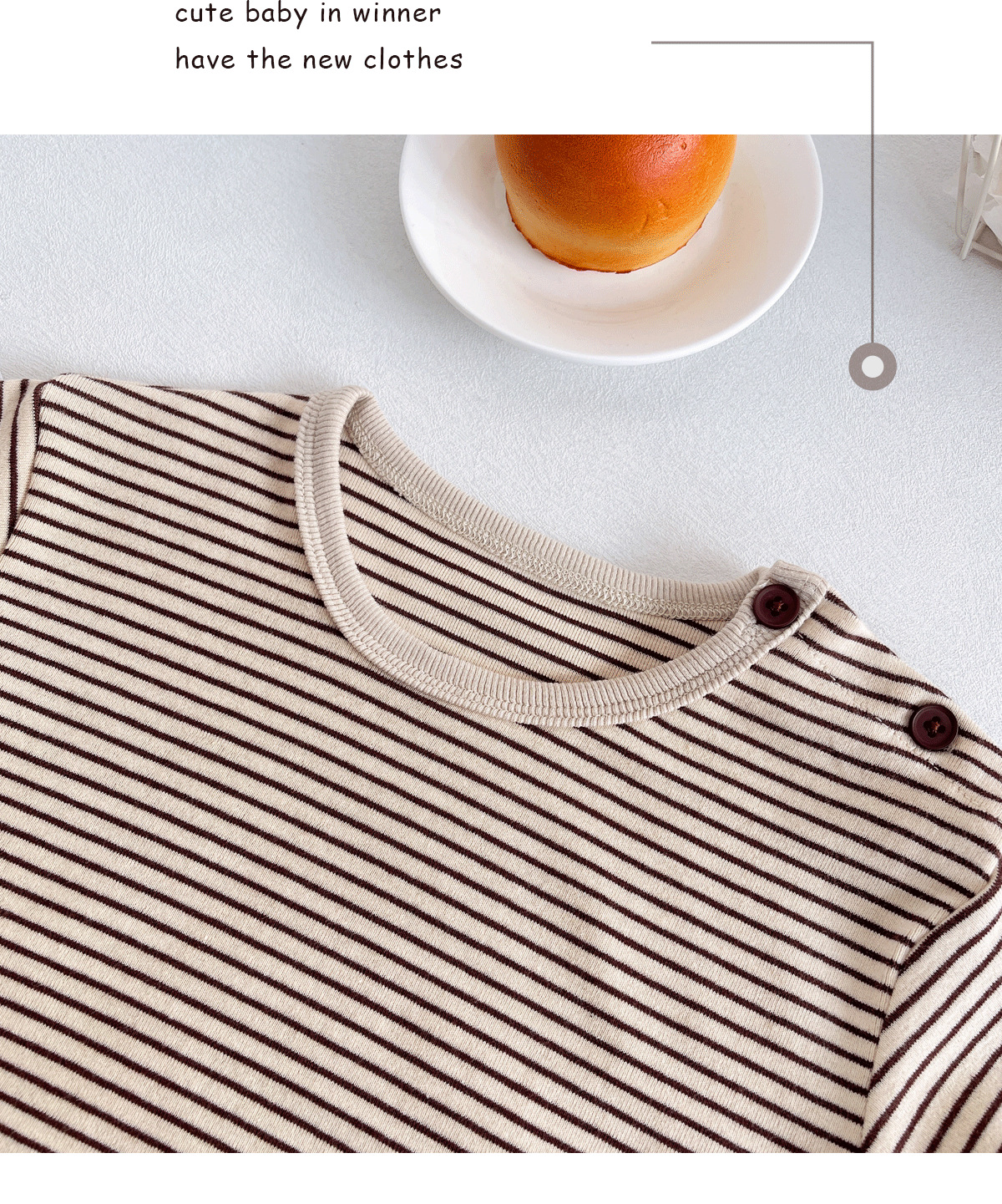 아동복 가을 새 소년과 소녀 줄무늬 긴팔 탑 아기 어깨 버클 티셔츠베이스 셔츠와 간단한 한국식 셔츠