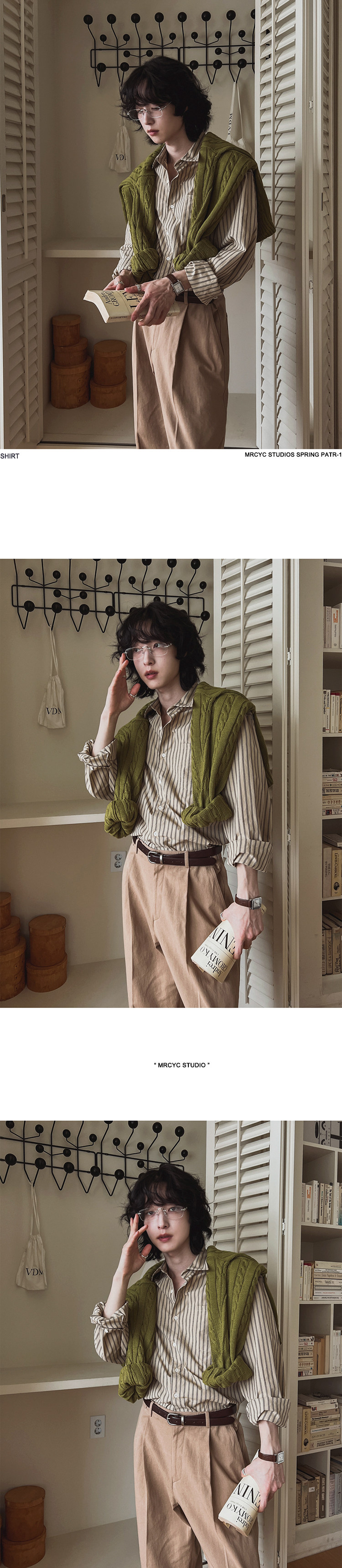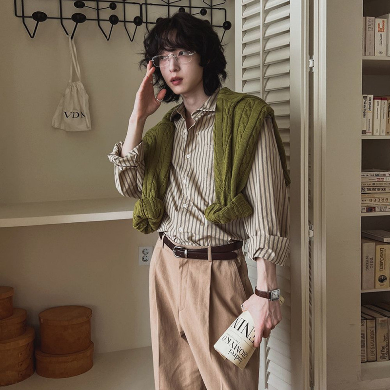MYQ 게으른 줄무늬 긴 소매 셔츠 남자의 봄 느슨한 캐주얼 셔츠 한국 스타일 유행 옷깃 재킷스토어 가기