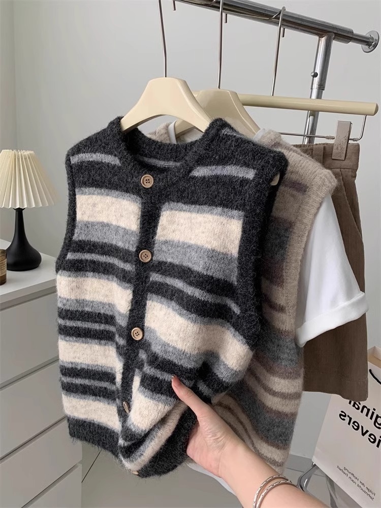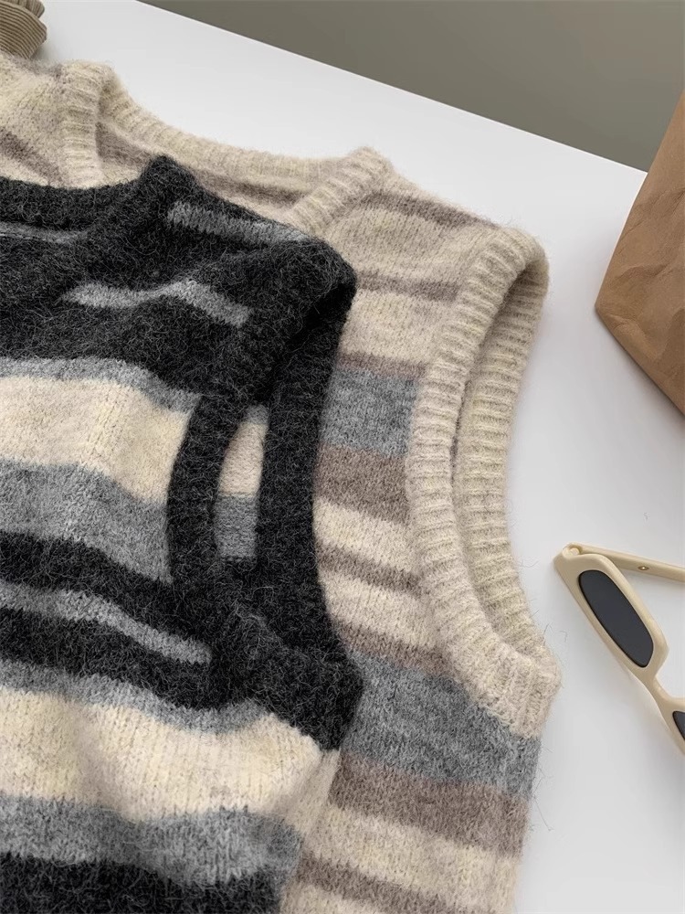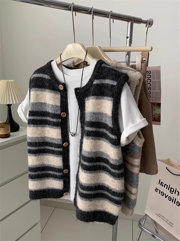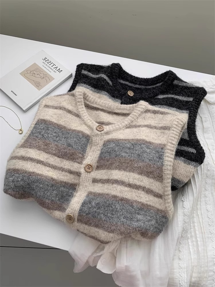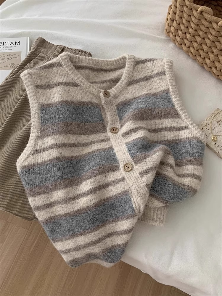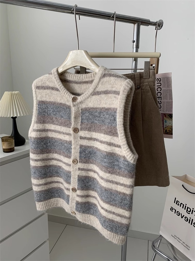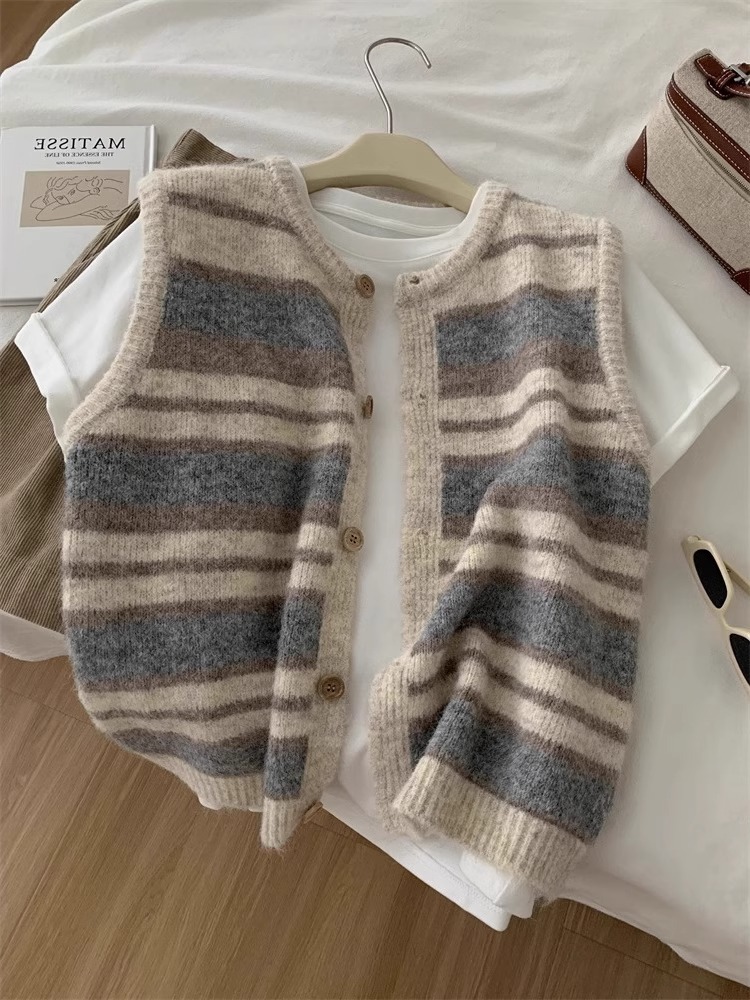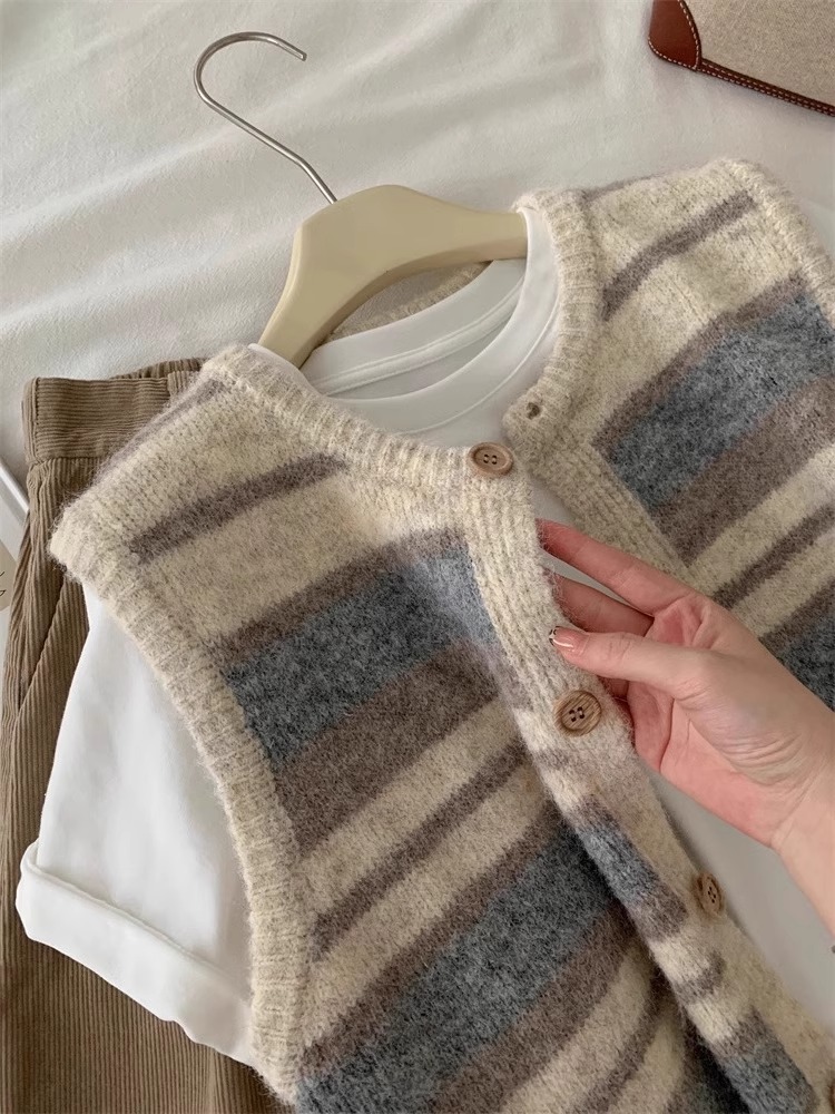 일본 스타일 레트로 스트라이프 니트 카디건 스웨터 조끼 여성 봄과 가을 독특한 슈퍼 모양의 조끼 스택 탑