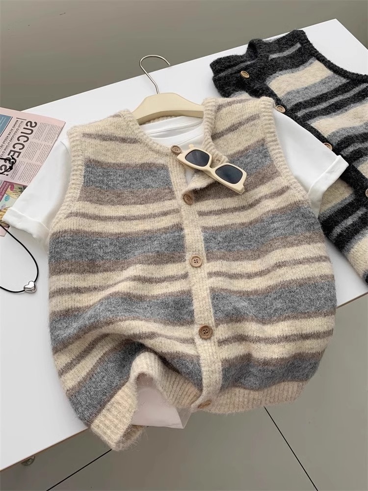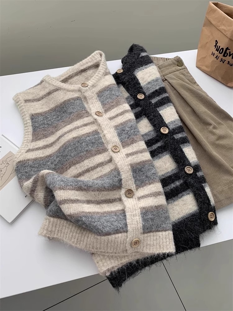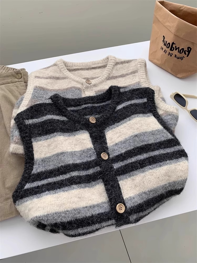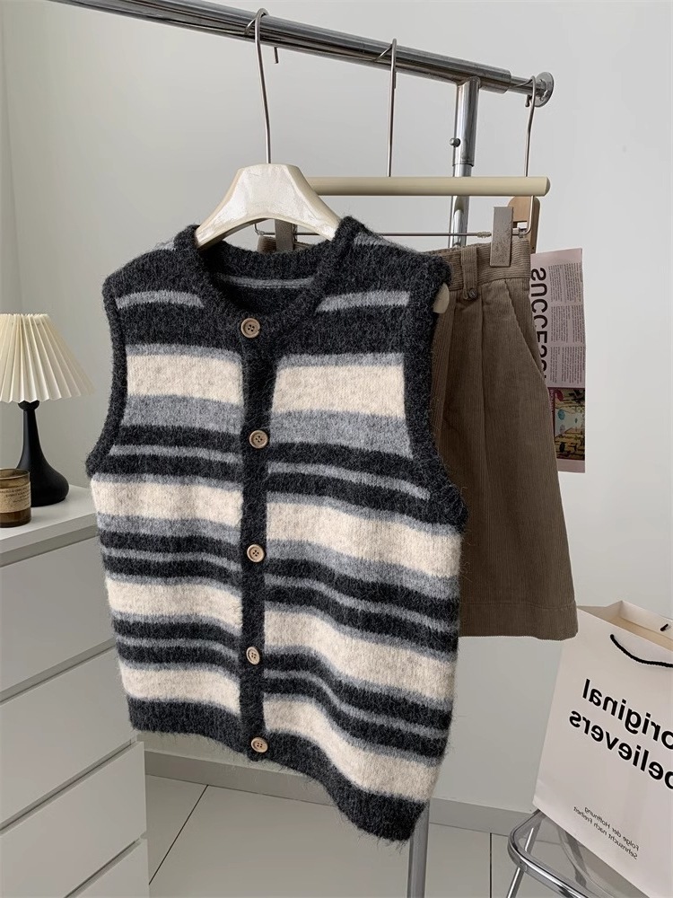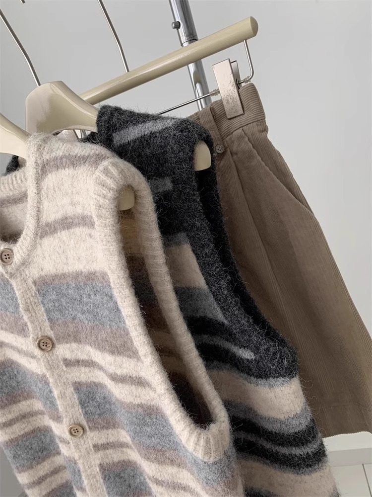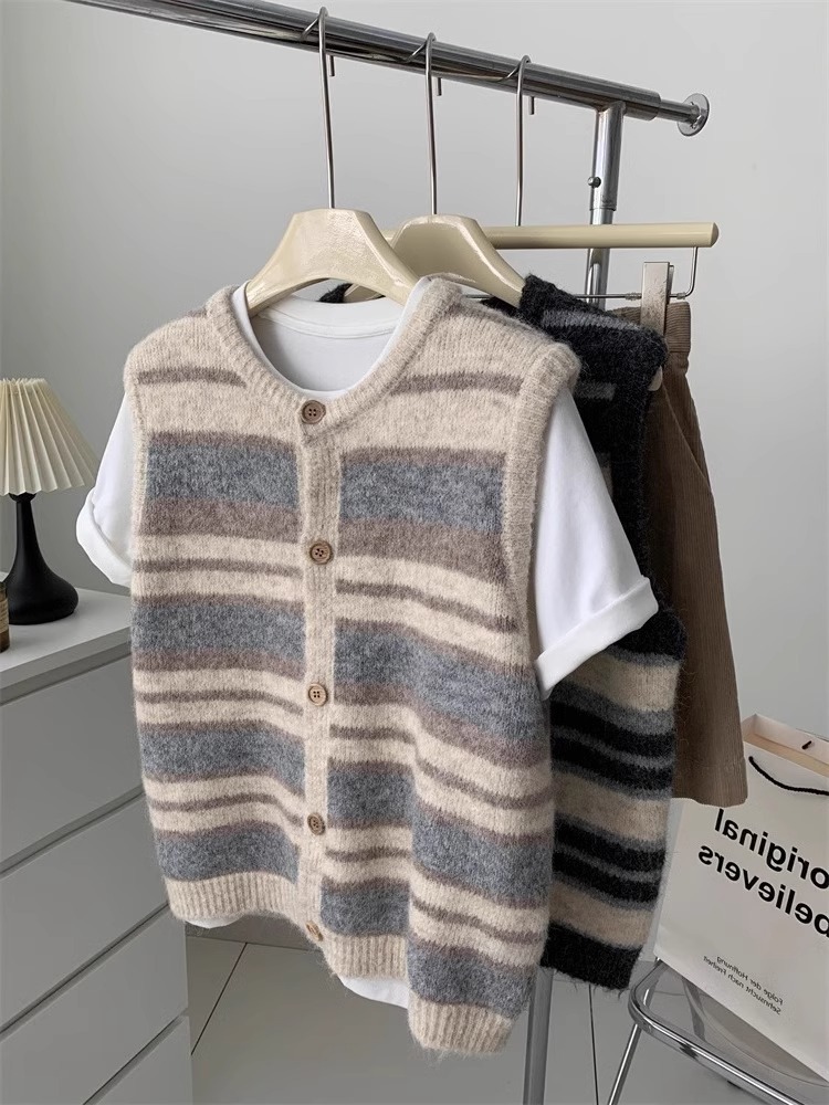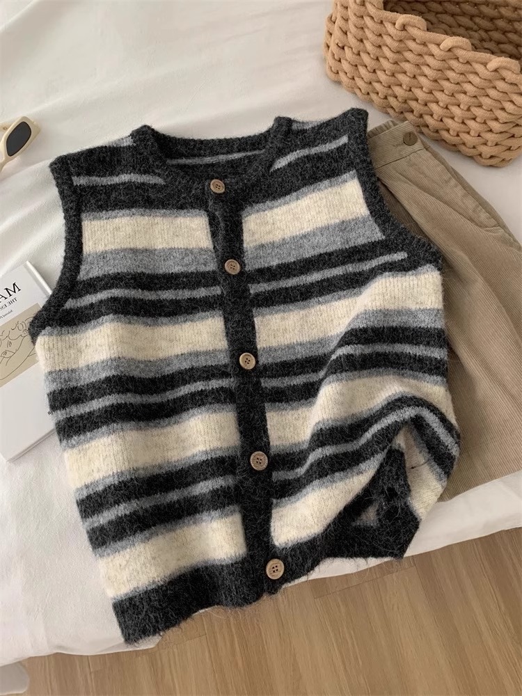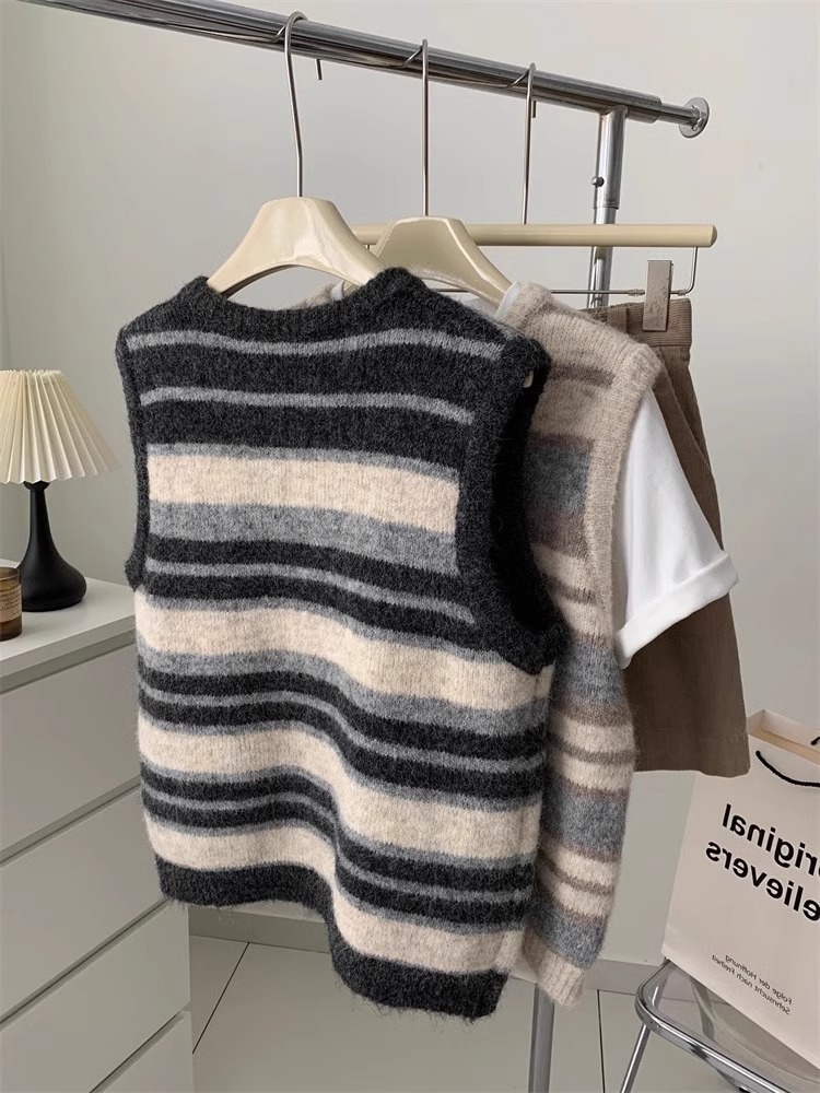 일본 스타일 레트로 스트라이프 니트 카디건 스웨터 조끼 여성 봄과 가을 독특한 슈퍼 모양의 조끼 스택 탑