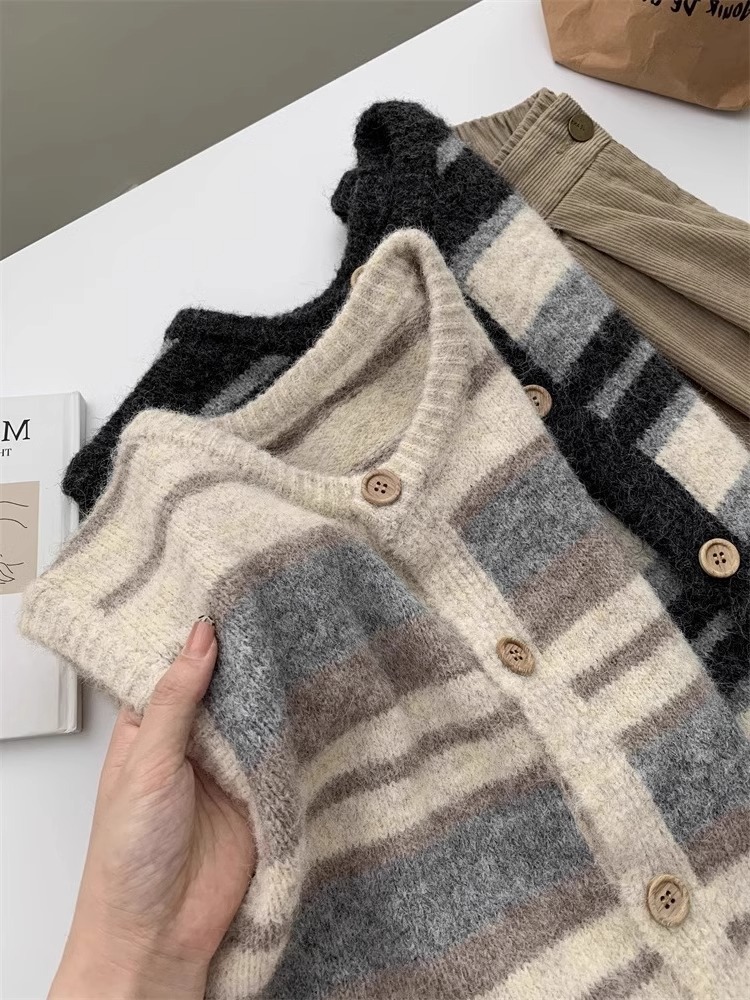 일본 스타일 레트로 스트라이프 니트 카디건 스웨터 조끼 여성 봄과 가을 독특한 슈퍼 모양의 조끼 스택 탑스토어 가기