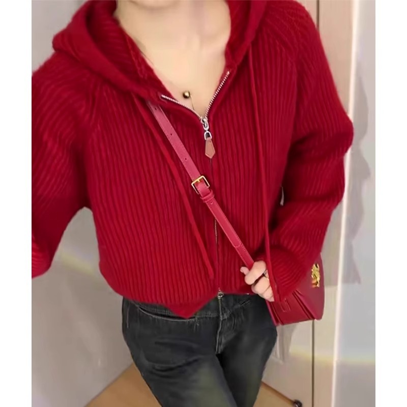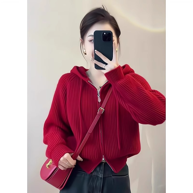 레드 후드 스웨터 코트 여자 2024 가을 겨울 한국 느슨한 짧은 더블 지퍼 사이버 연예인 니트 카디건 탑