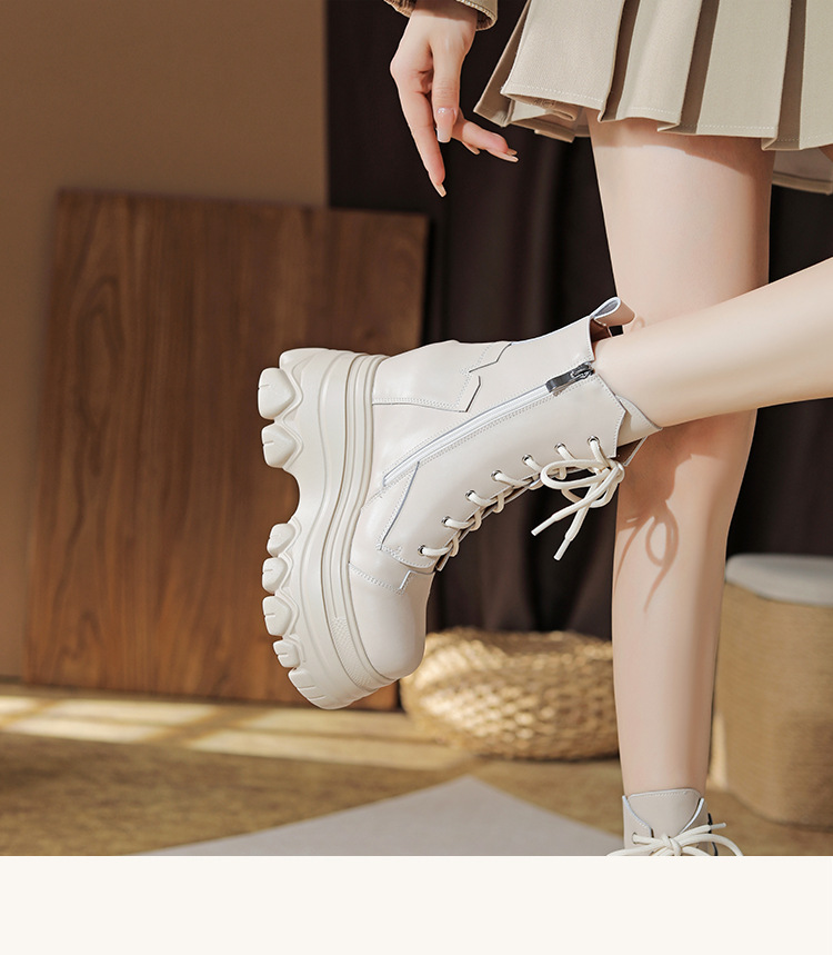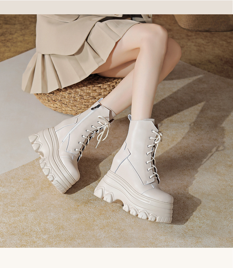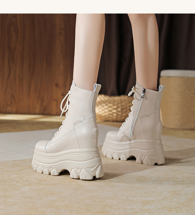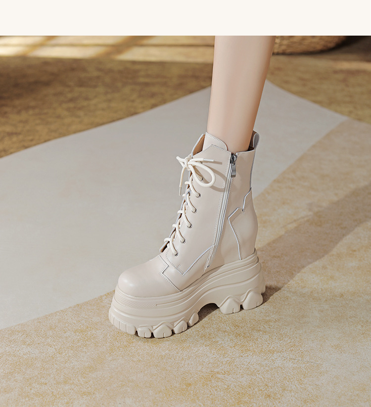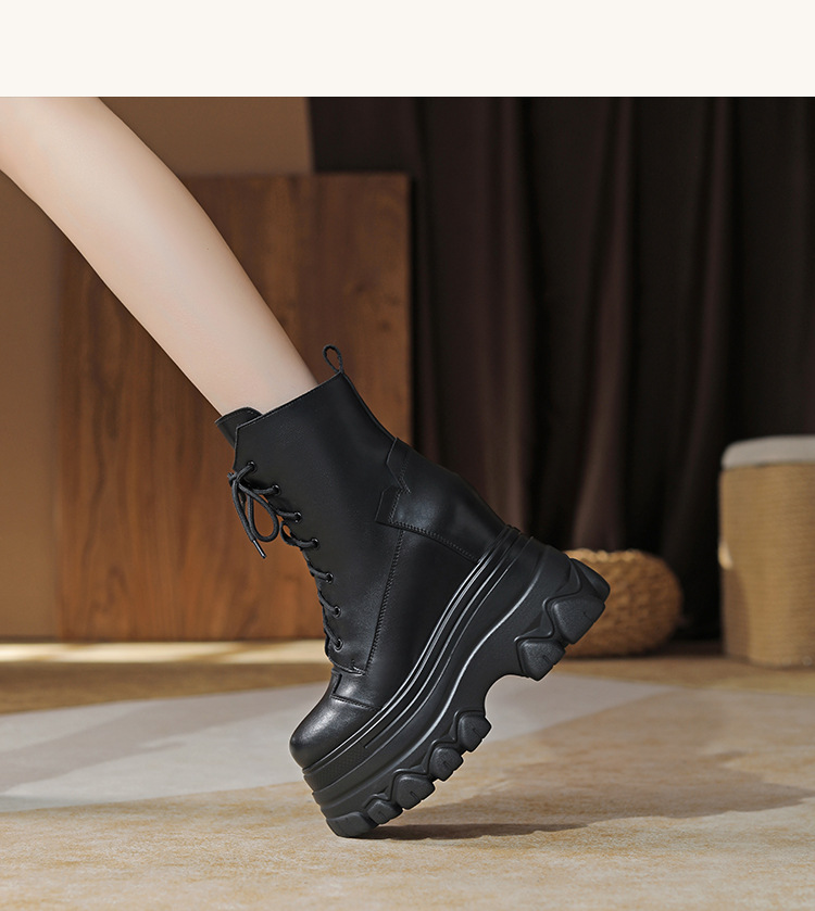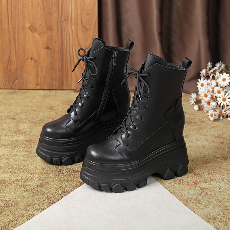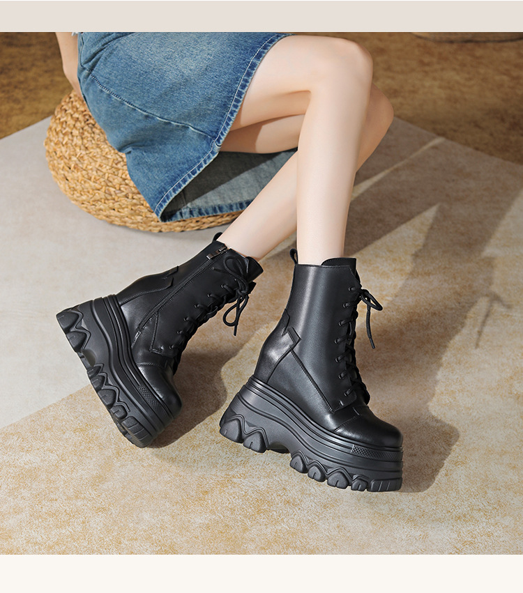 12cm 내부 높이 증가 수제 정품 가죽 두꺼운 밑창 레이스 업 마틴 부츠 여성의 작은 높이 증가 유행 올 매치 편안한 발목 부츠스토어 가기