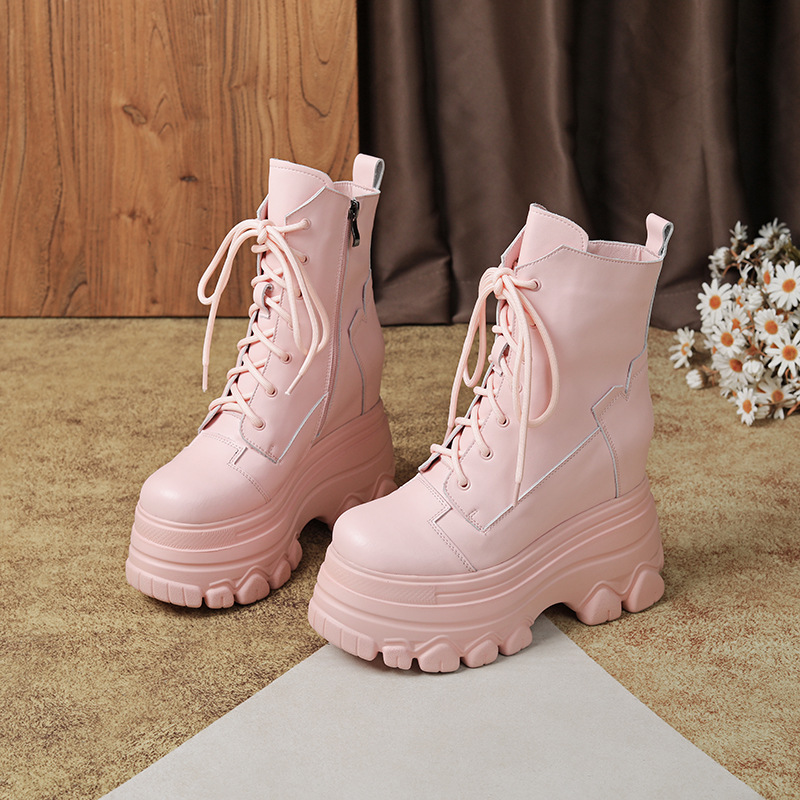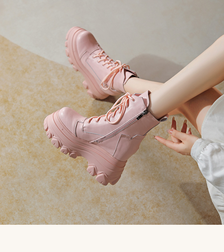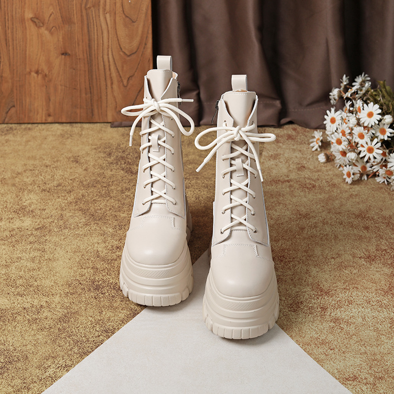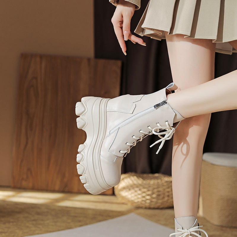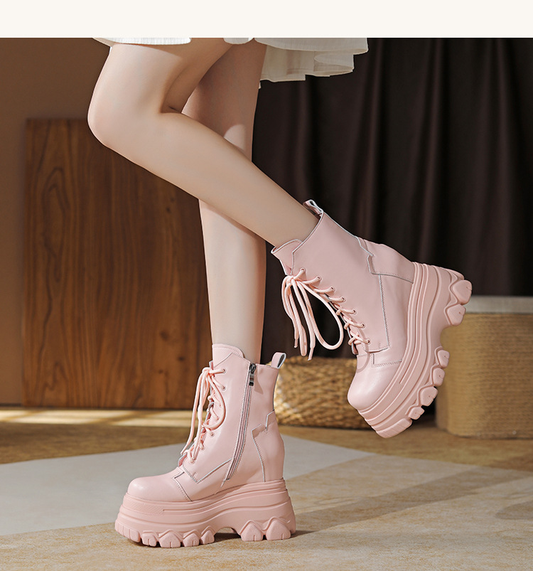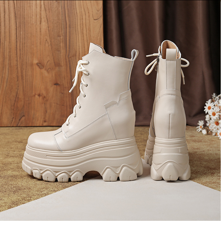 12cm 내부 높이 증가 수제 정품 가죽 두꺼운 밑창 레이스 업 마틴 부츠 여성의 작은 높이 증가 유행 올 매치 편안한 발목 부츠스토어 가기