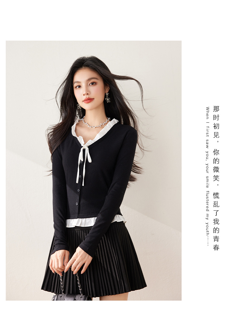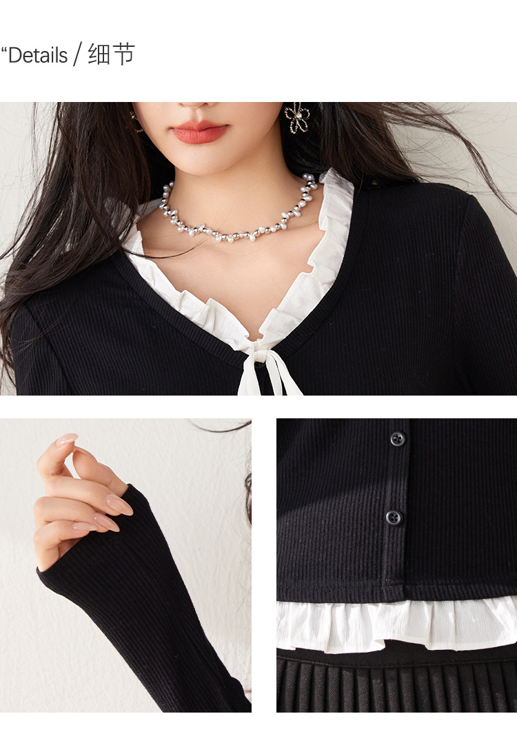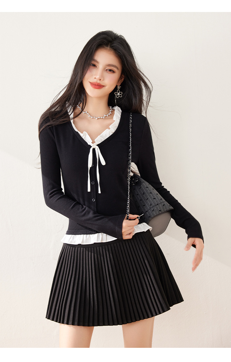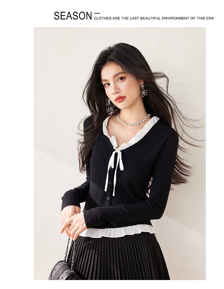 봄 2025 새로운 프랑스 가짜 투피스 V 넥 대조 컬러 나비 레이스 업 여성용 반소매 스웨터스토어 가기