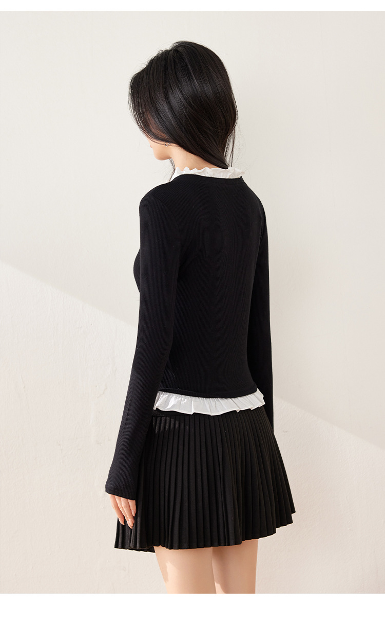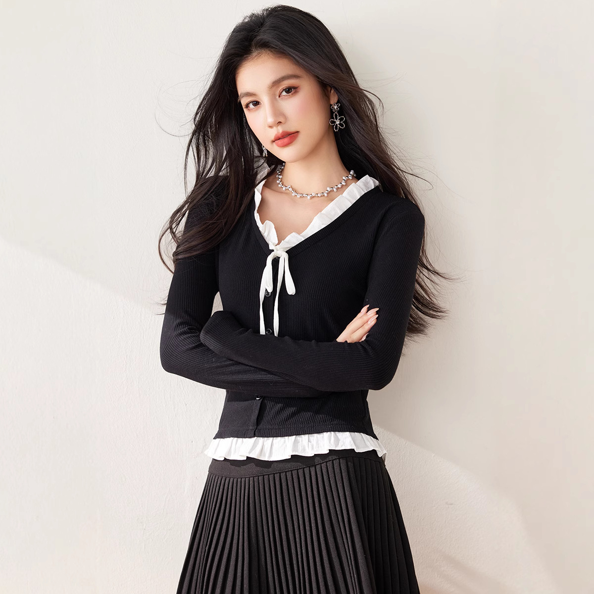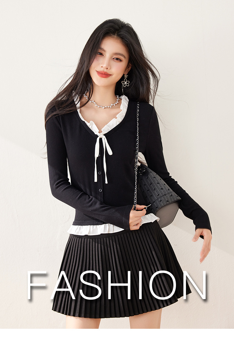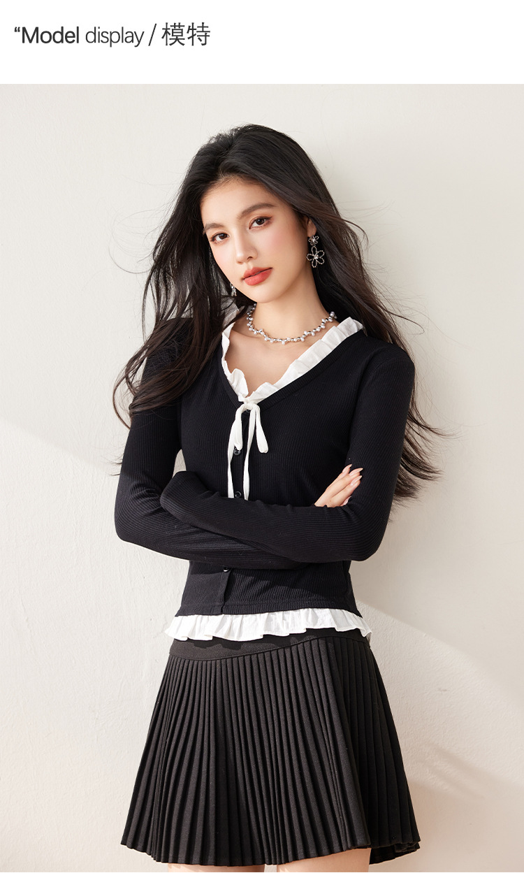 봄 2025 새로운 프랑스 가짜 투피스 V 넥 대조 컬러 나비 레이스 업 여성용 반소매 스웨터스토어 가기
